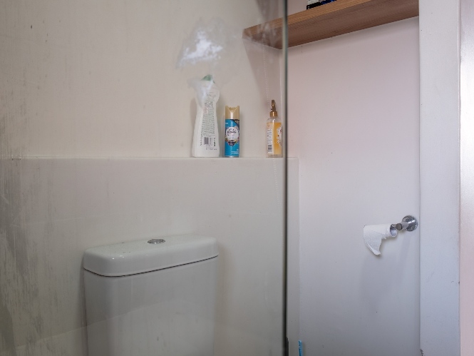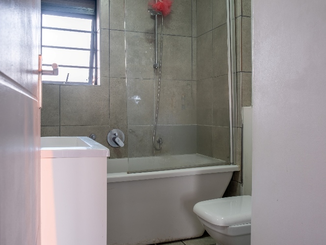 Both bedrooms are generously sized and include built-in cupboards, providing ample storage. The fully tiled bathroom is neatly finished and equipped with a bathtub, showerhead, basin, and toilet.