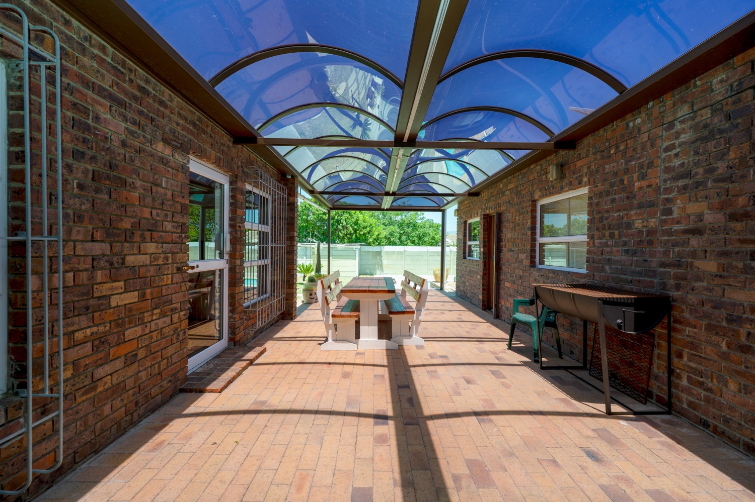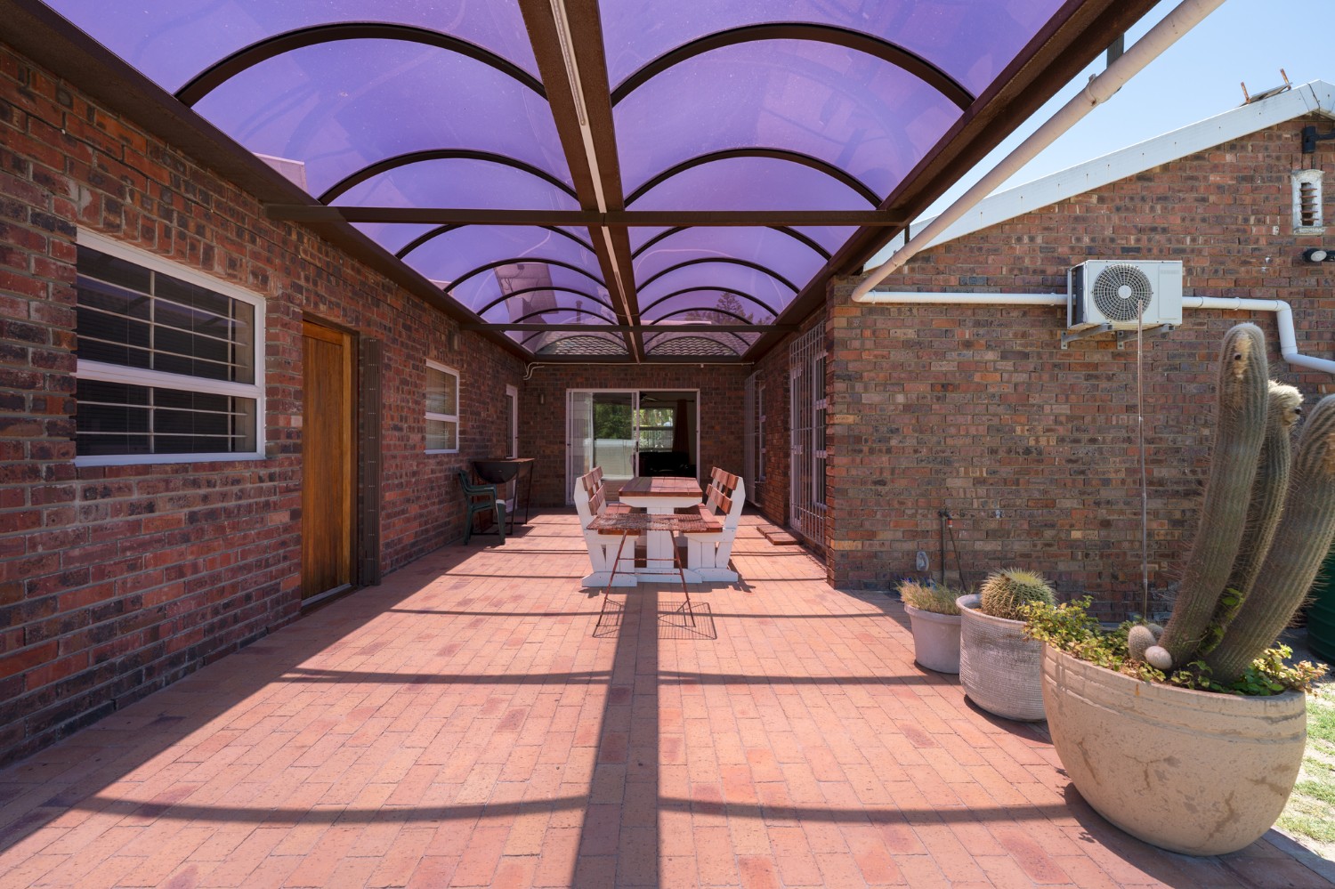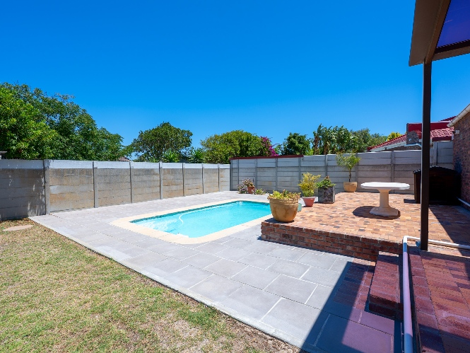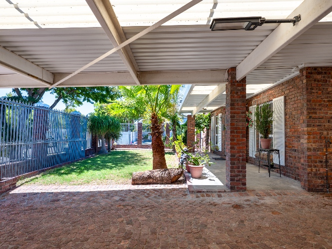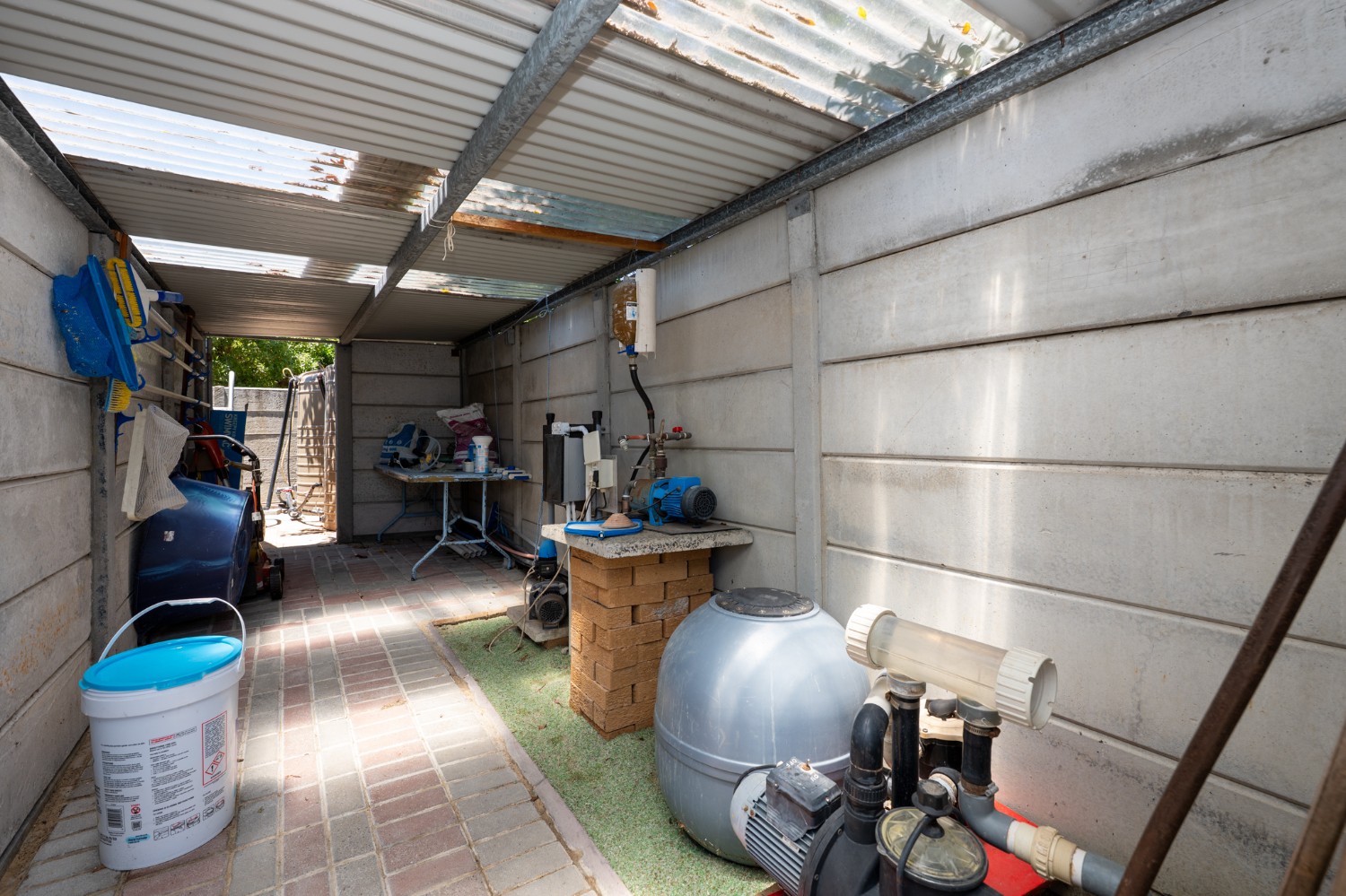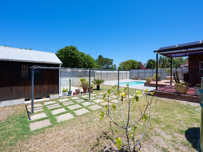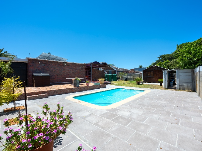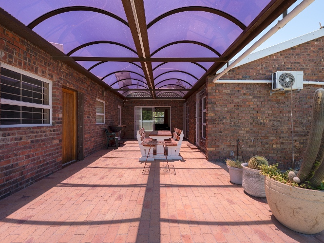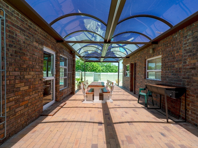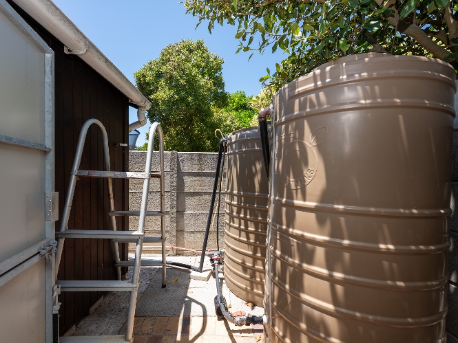 The outdoor area includes a swimming pool and an impressive water-saving setup with four JoJo tanks. Two tanks collect rainwater, while the additional tanks are used for pool backwashing and pumping borehole water. The borehole, fitted with a pump, is connected to the home’s toilets, providing excellent water efficiency.