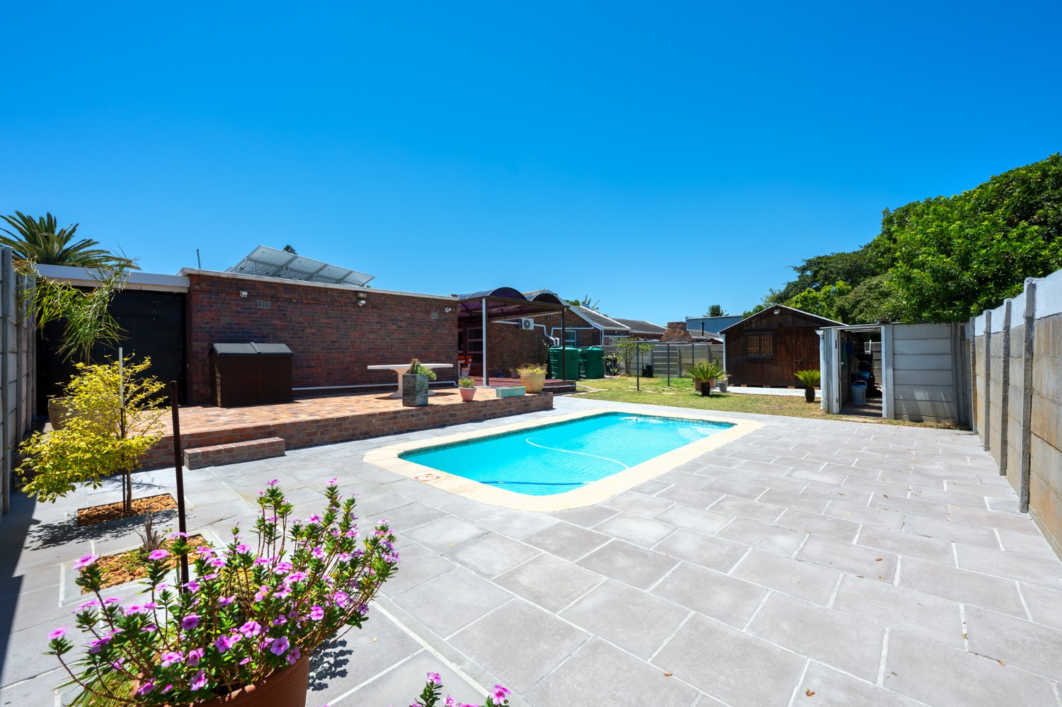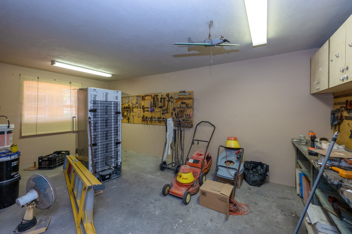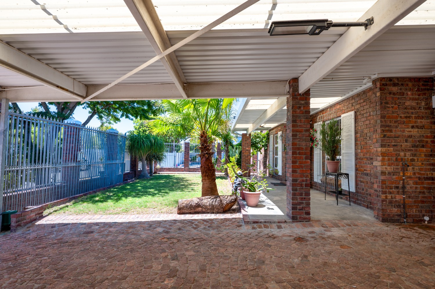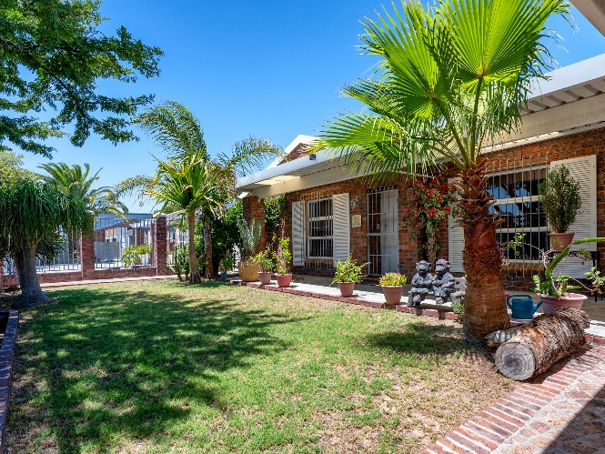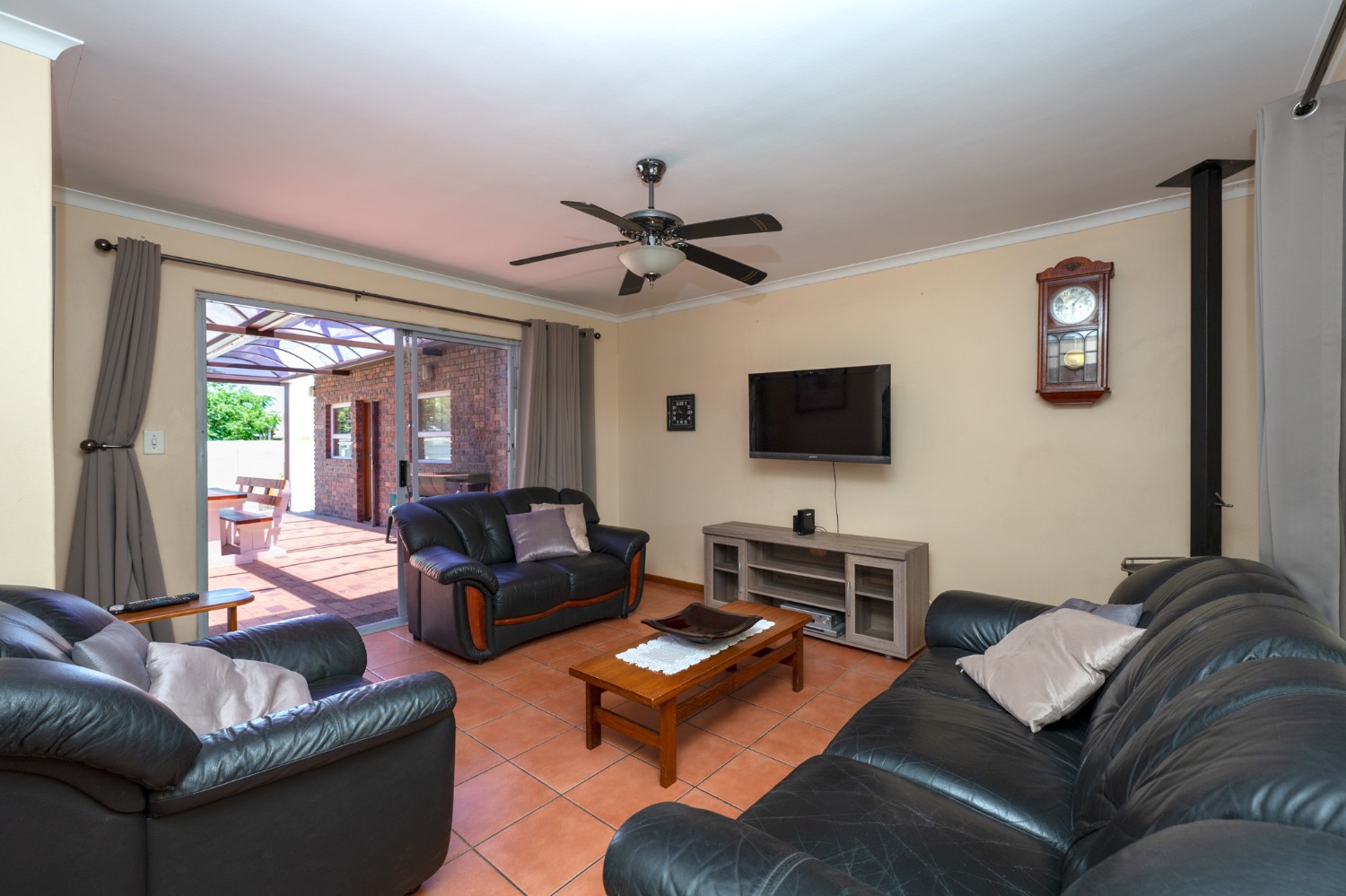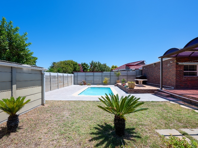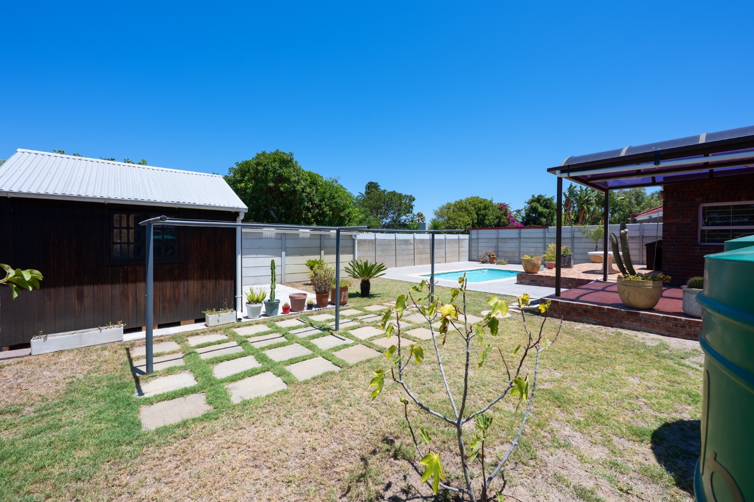 The outdoor area includes a swimming pool and an impressive water-saving setup with four JoJo tanks. Two tanks collect rainwater, while the additional tanks are used for pool backwashing and pumping borehole water. The borehole, fitted with a pump, is connected to the home’s toilets, providing excellent water efficiency.
