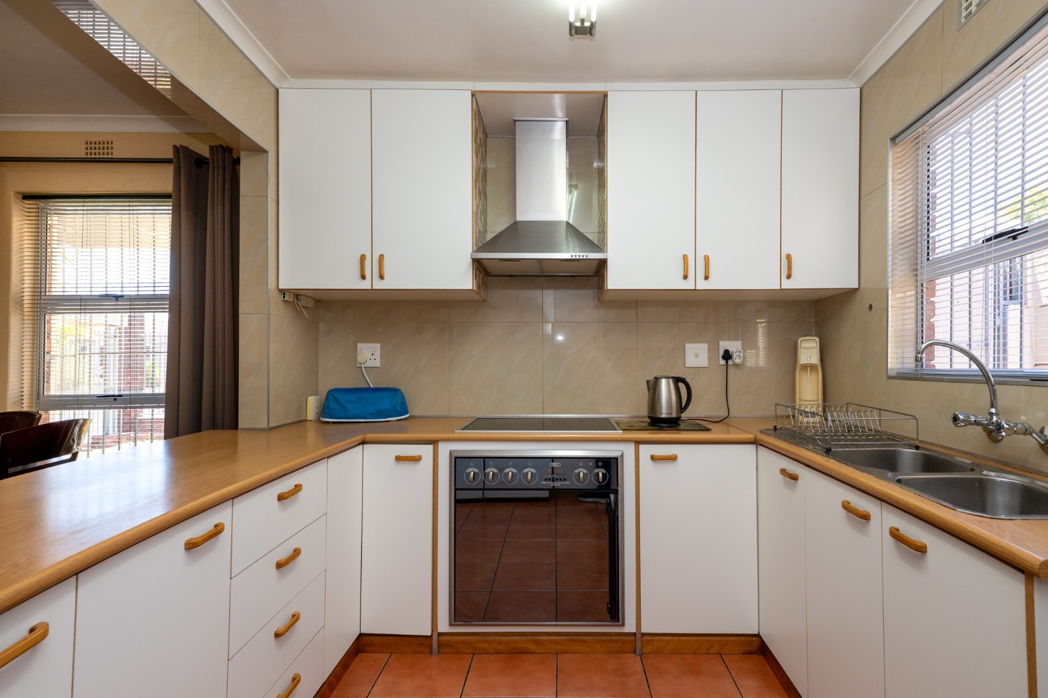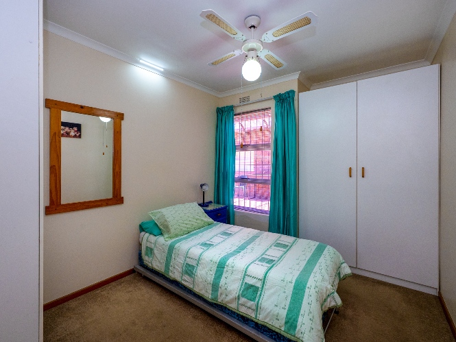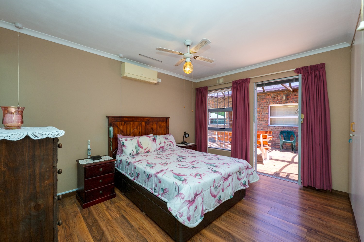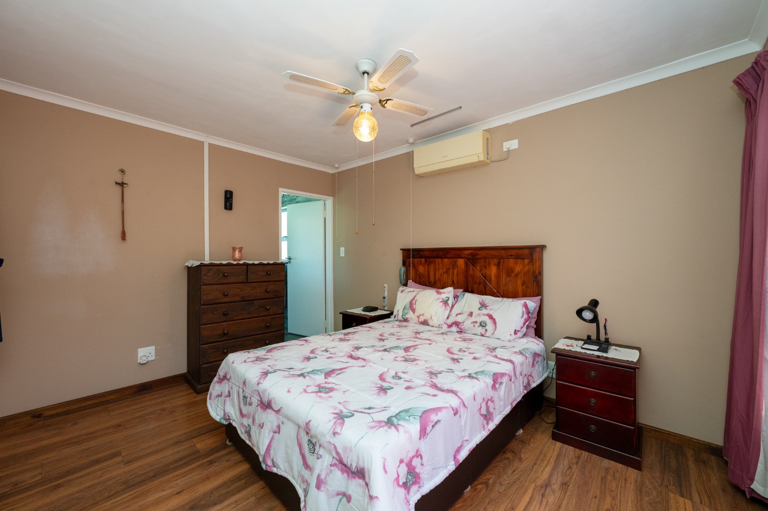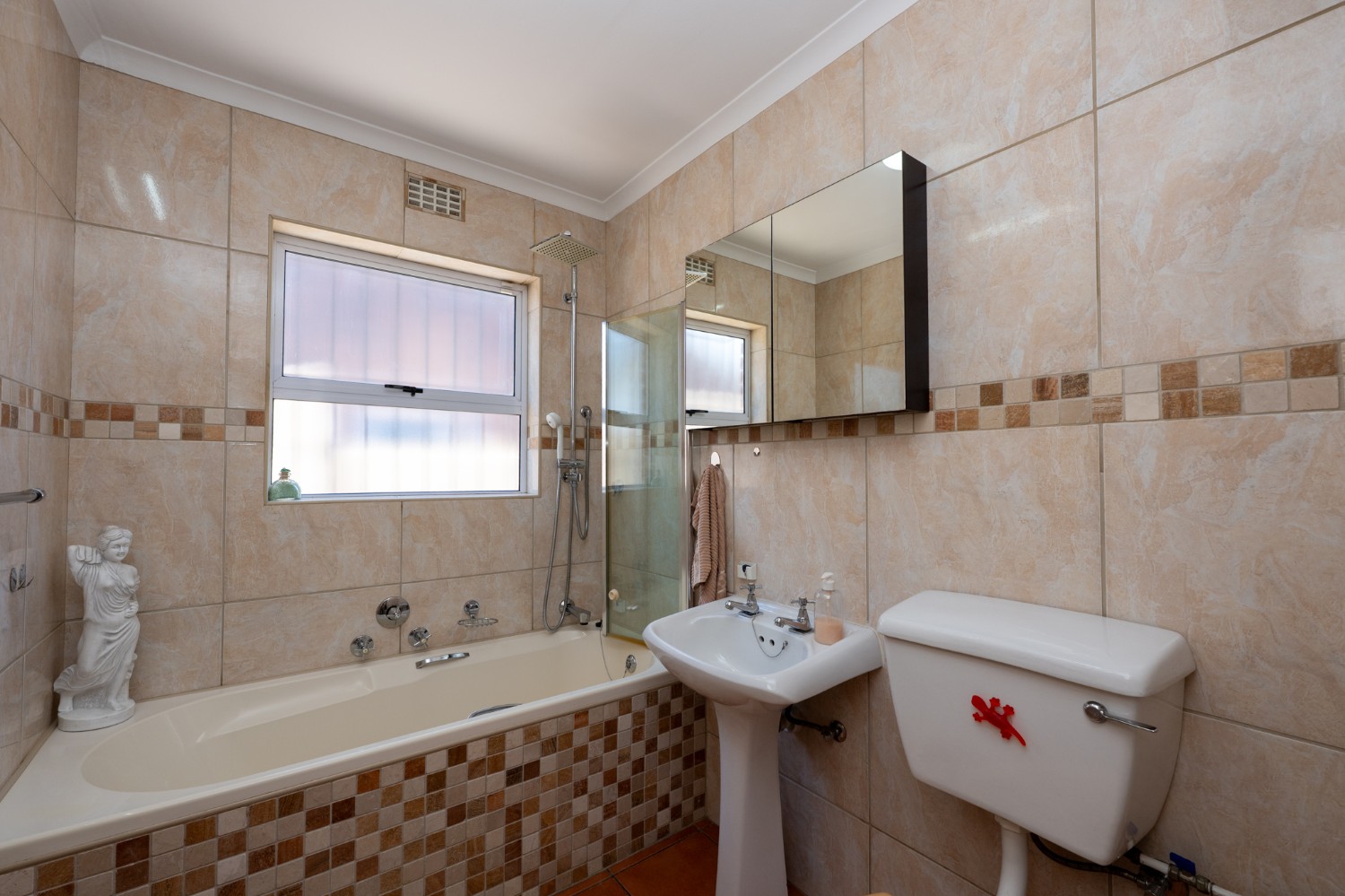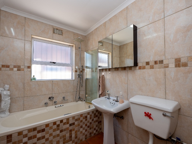 The property boasts 3 well-sized bedrooms, all fitted with built-in cupboards, with the main bedroom featuring air-conditioning. There are 2 bathrooms, including a full family bathroom with a bathtub and a main en-suite with a shower.