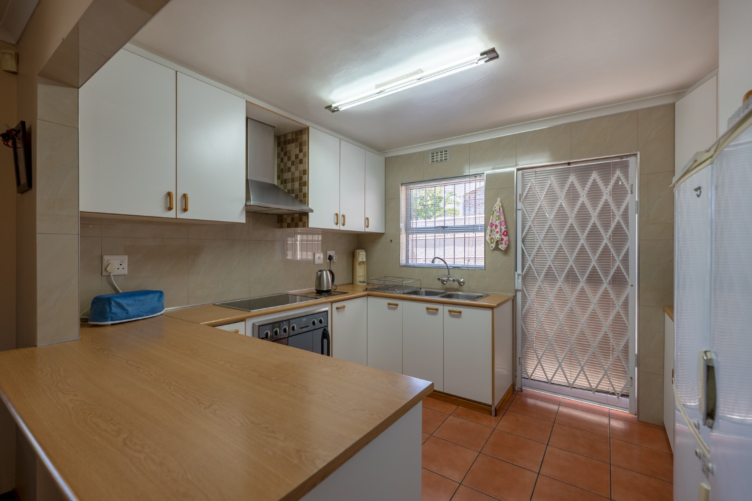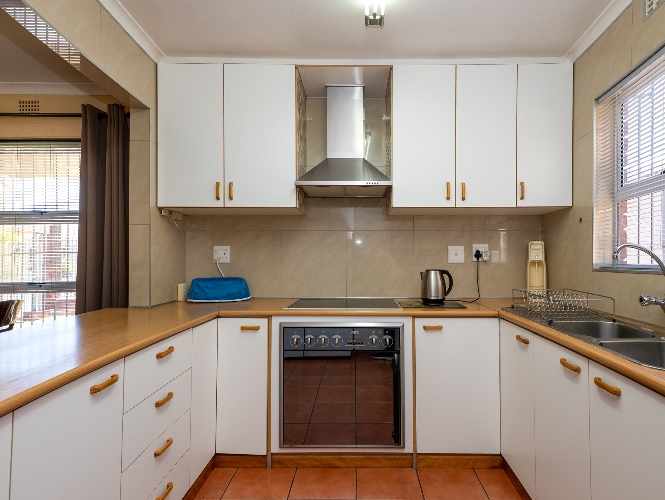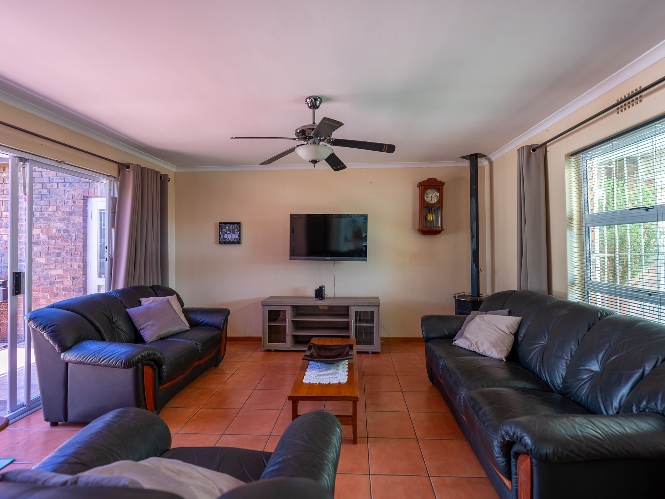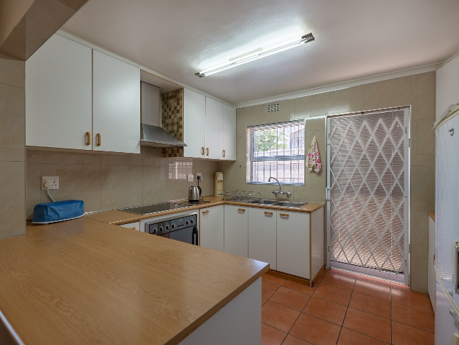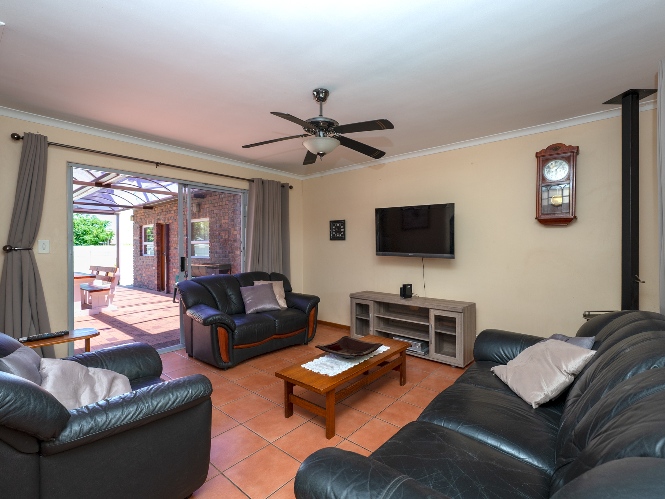 The home offers a neatly fitted kitchen equipped with an electric stove and oven, flowing seamlessly into the lounge and dining area, creating a warm and inviting living space. Sliding doors lead out to a covered patio, ideal for relaxed outdoor entertaining.