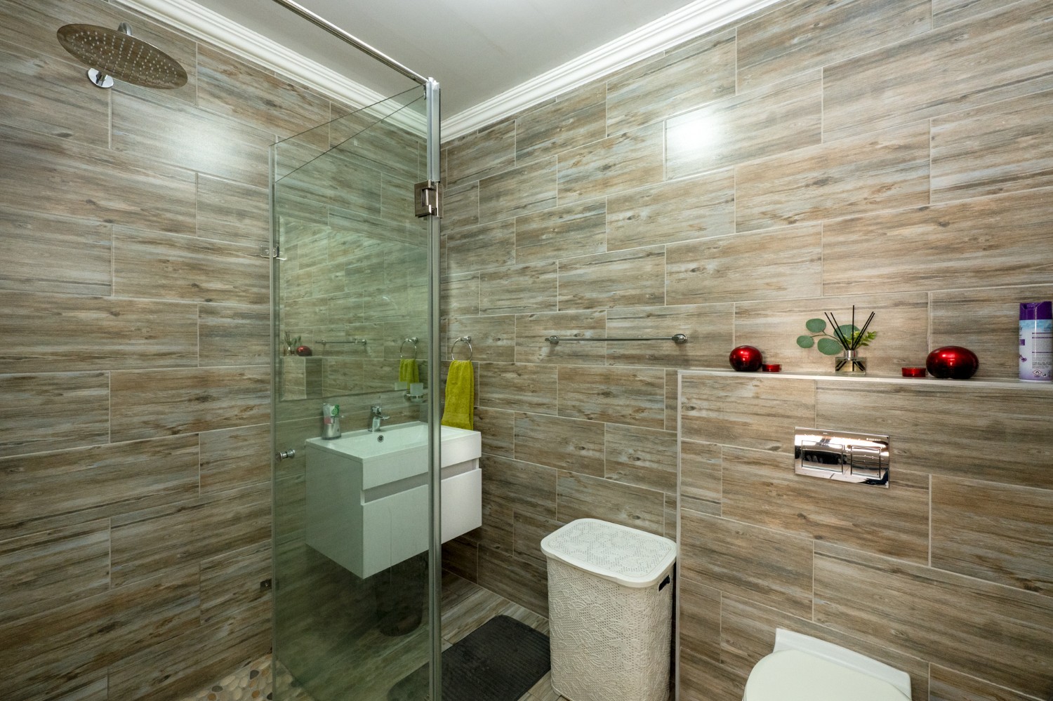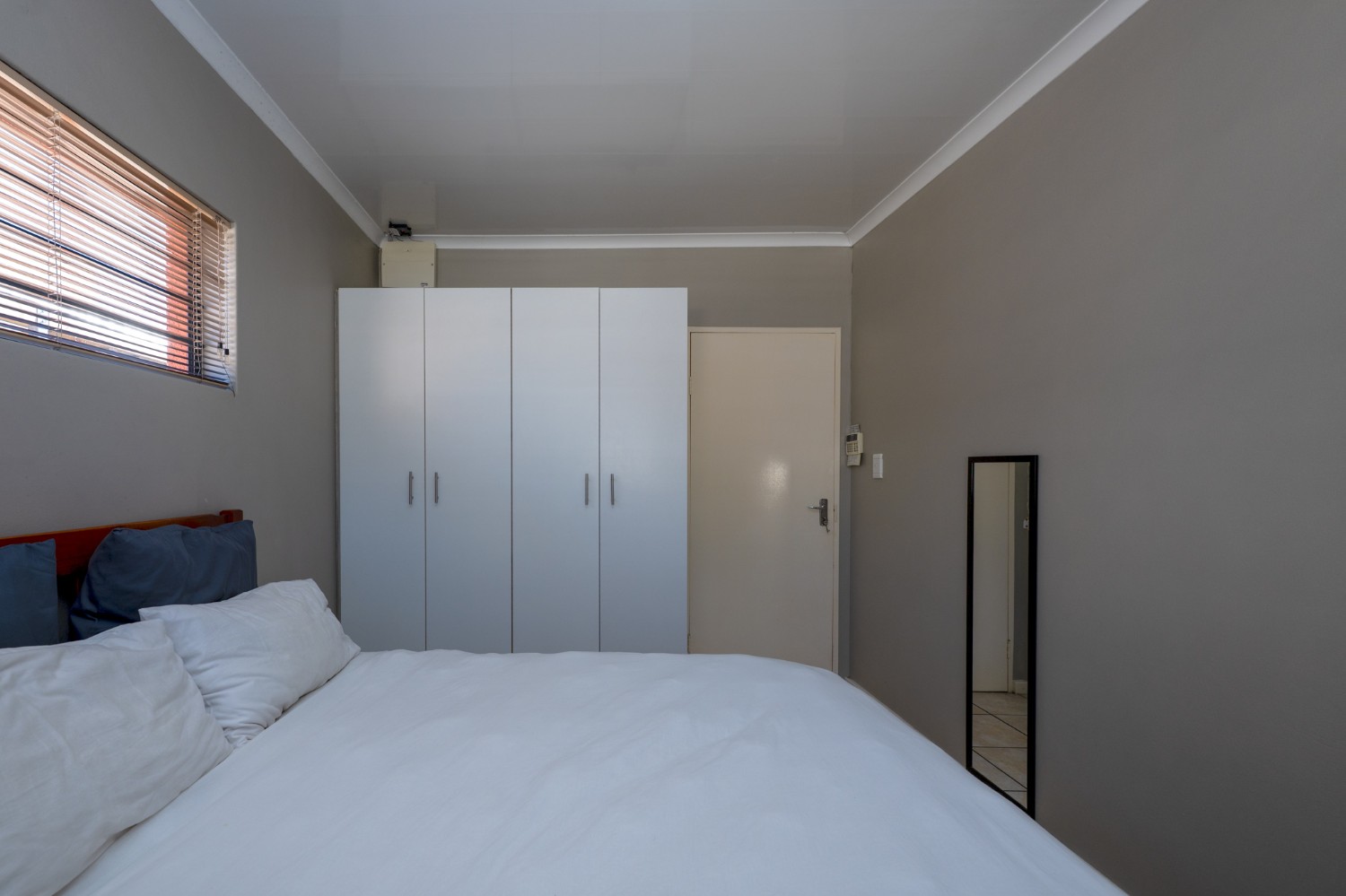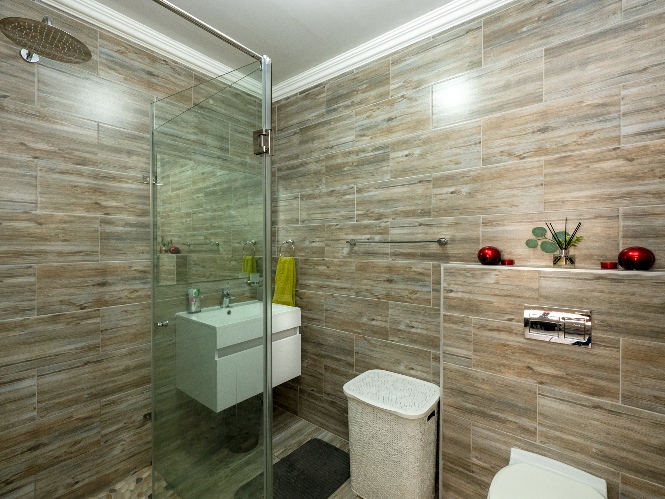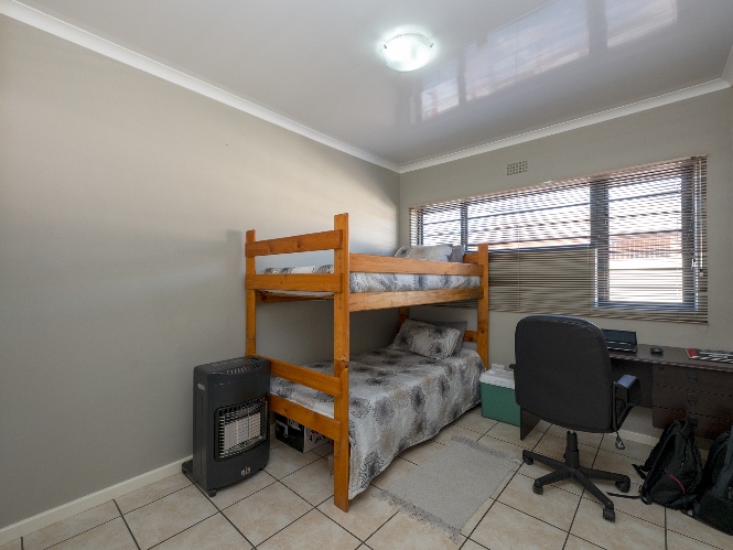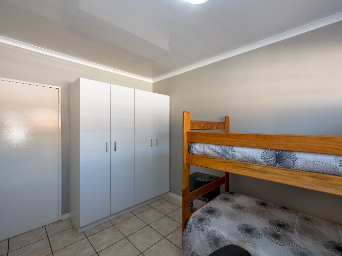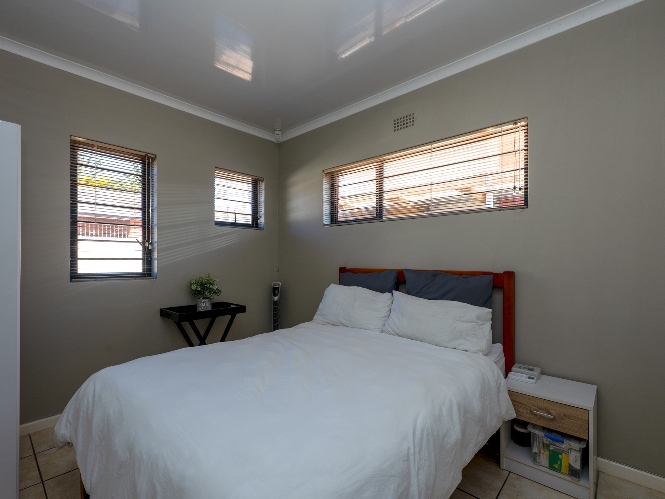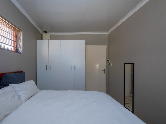 There are two bedrooms fitted with built-in cupboards, blinds and tiled flooring. The modern family bathroom is tastefully finished and includes a shower, basin, and toilet.