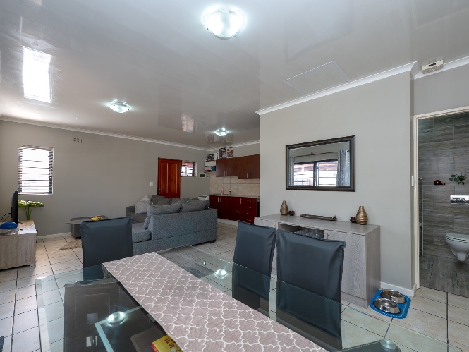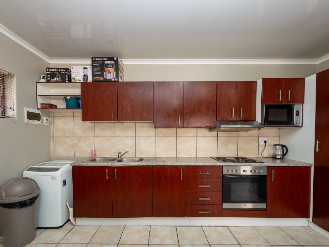 The home features an open-plan lounge and dining room with neat tiled flooring throughout. The lounge opens via a sliding door to the backyard, allowing for easy indoor-outdoor flow and plenty of natural light. The kitchen is well-appointed with dark wood cupboards, an under-counter oven and hob, one plumbing point, and space for a fridge, providing both functionality and style.
