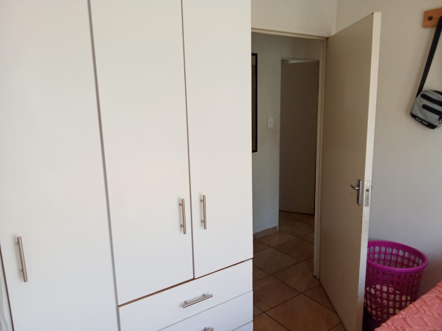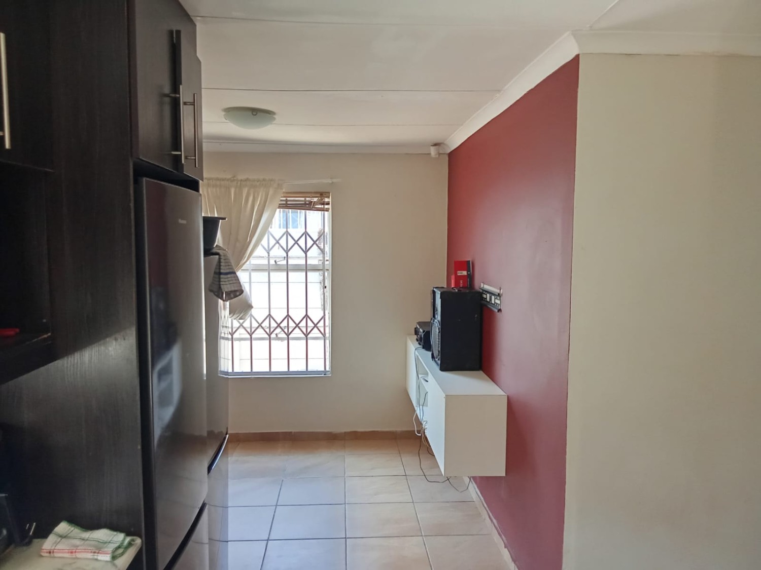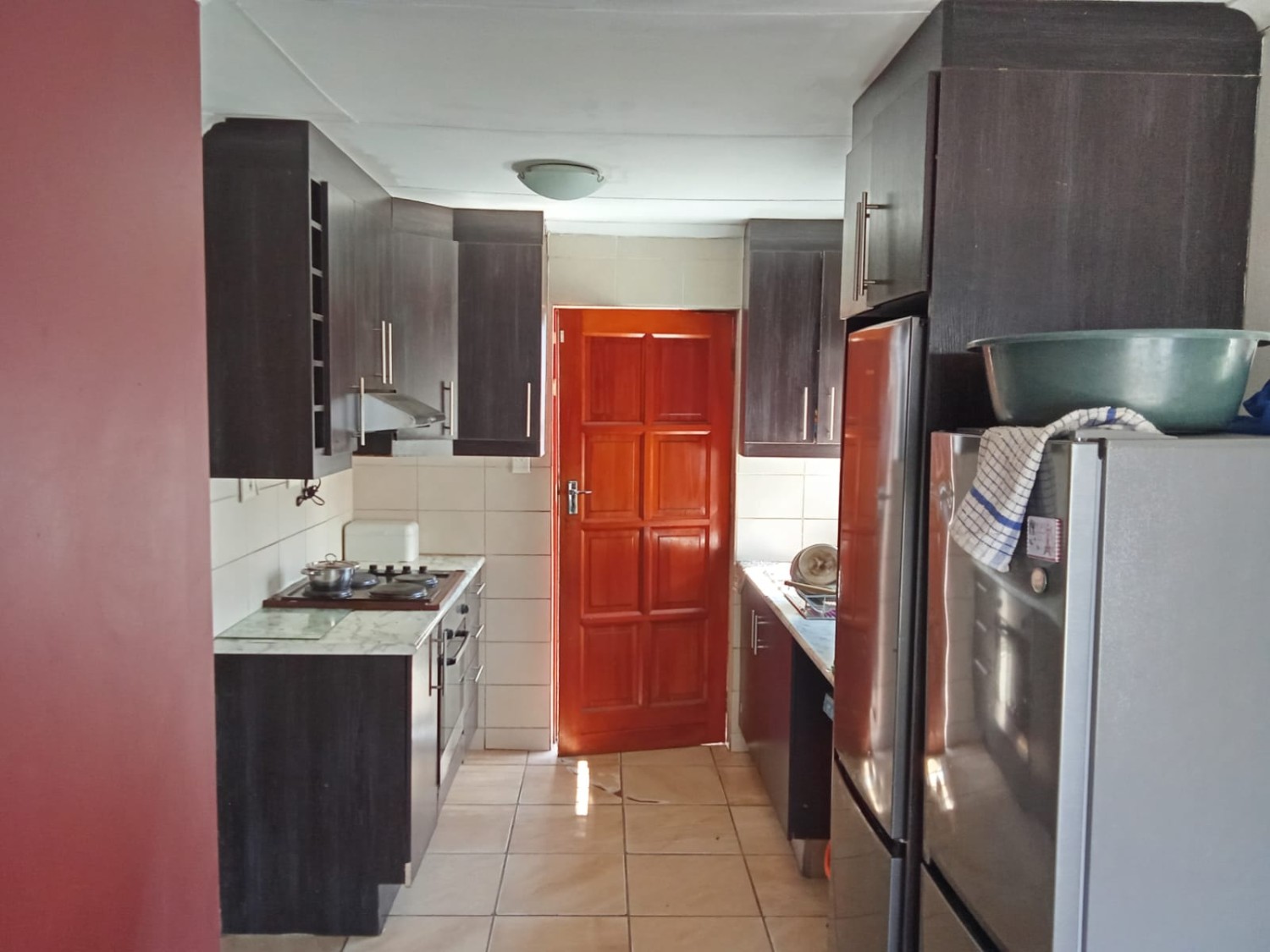 The home features a welcoming lounge with tiled flooring, creating a neat and low-maintenance living space ideal for family living or entertaining guests. The kitchen is fitted with dark wood cupboards, a built-in stove and oven, one plumbing point, and space for a fridge, providing both functionality and style.