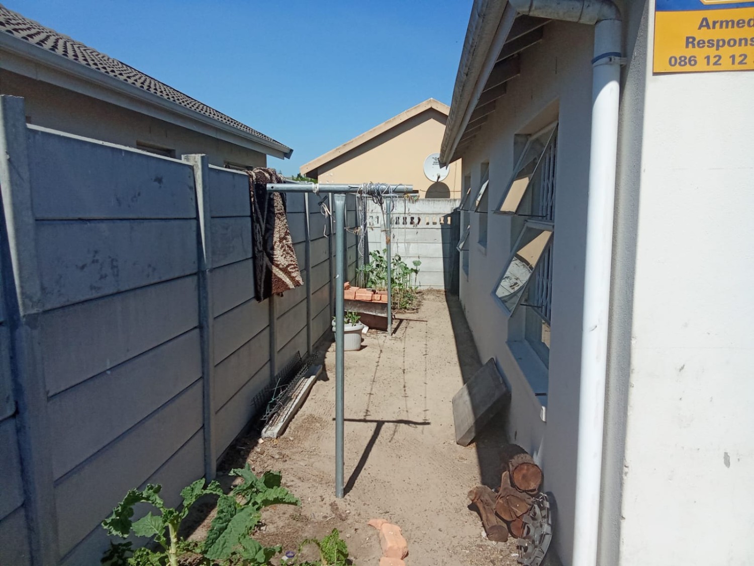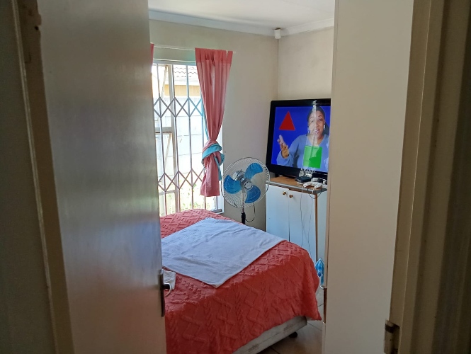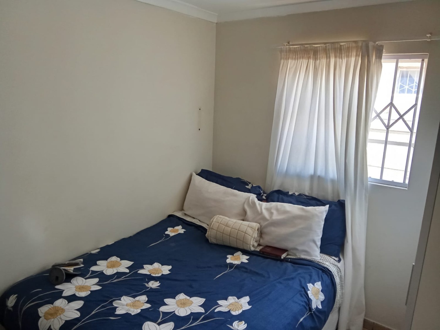 The home features a welcoming lounge with tiled flooring, creating a neat and low-maintenance living space ideal for family living or entertaining guests. The kitchen is fitted with dark wood cupboards, a built-in stove and oven, one plumbing point, and space for a fridge, providing both functionality and style.