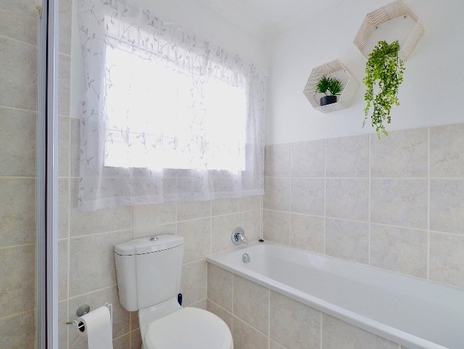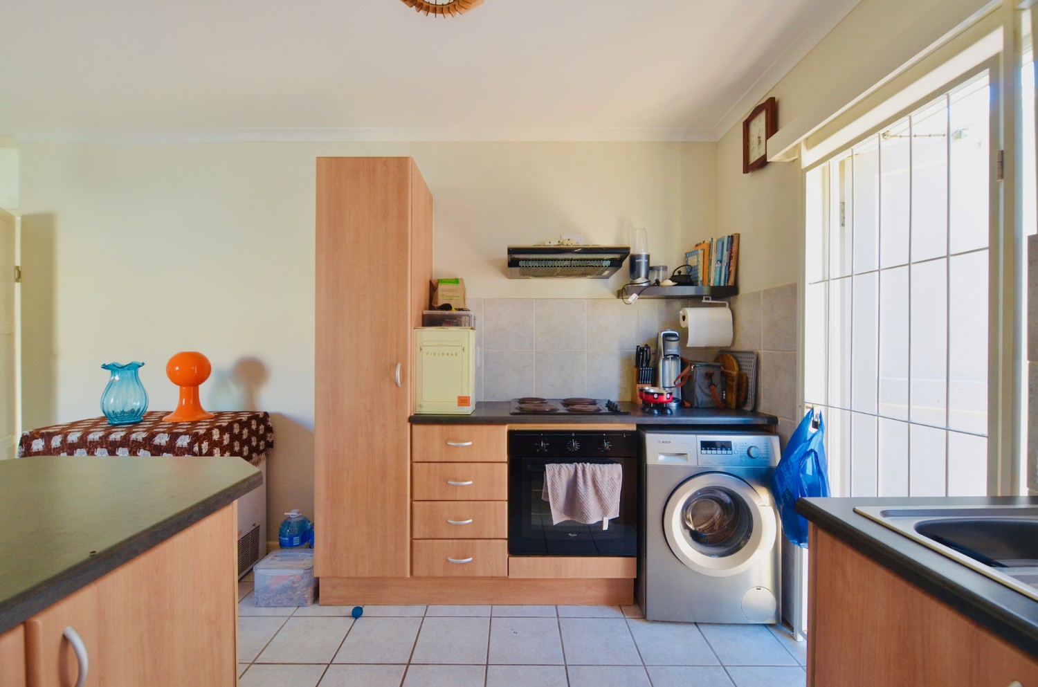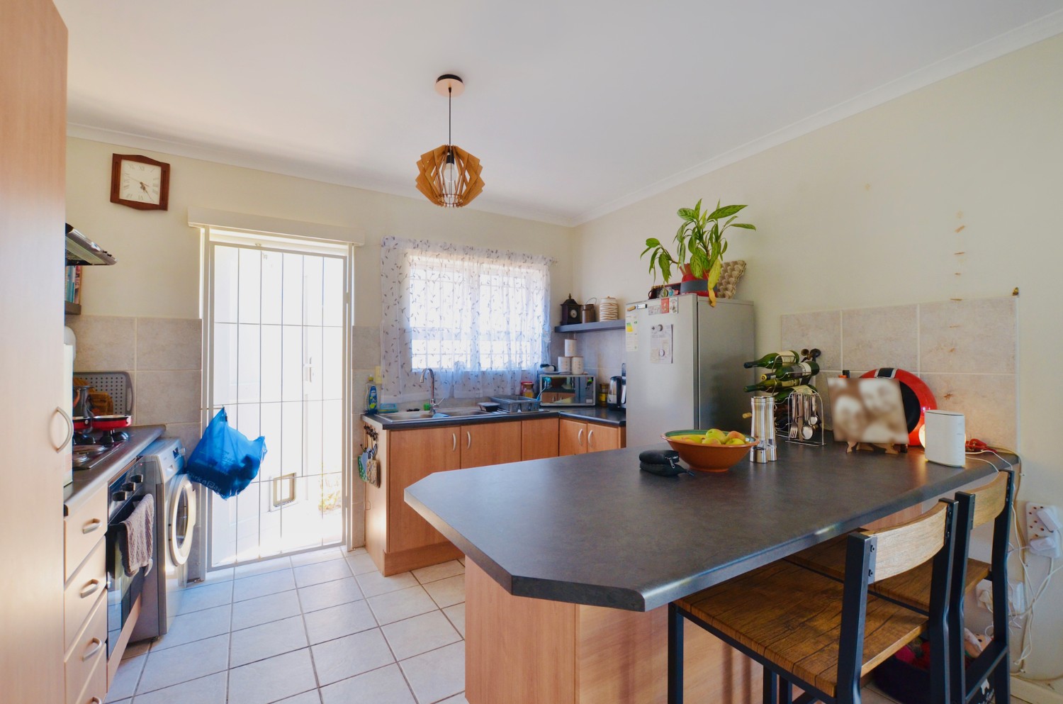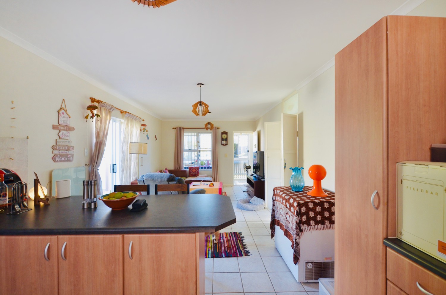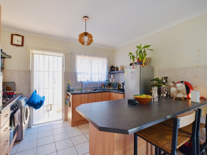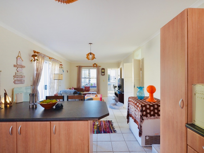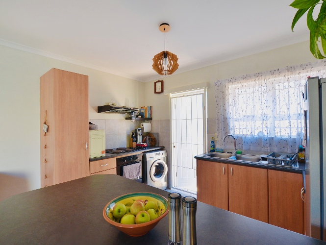 The open-plan living area flows effortlessly into the kitchen, making it ideal for relaxed living and entertaining. Both bedrooms include built-in cupboards, and the full bathroom is neatly finished with a bath and shower.
