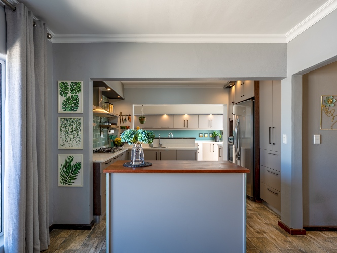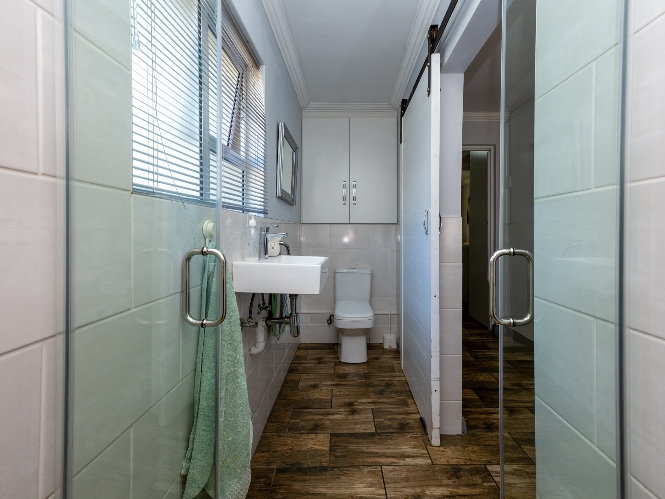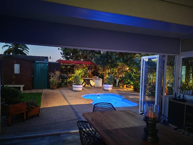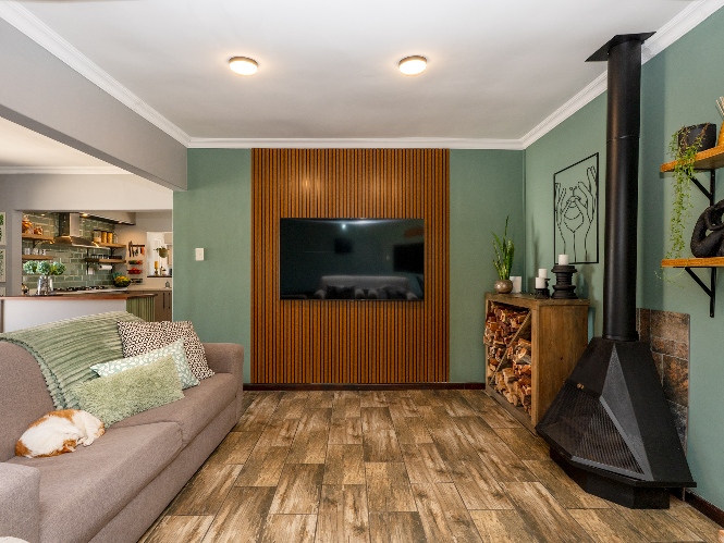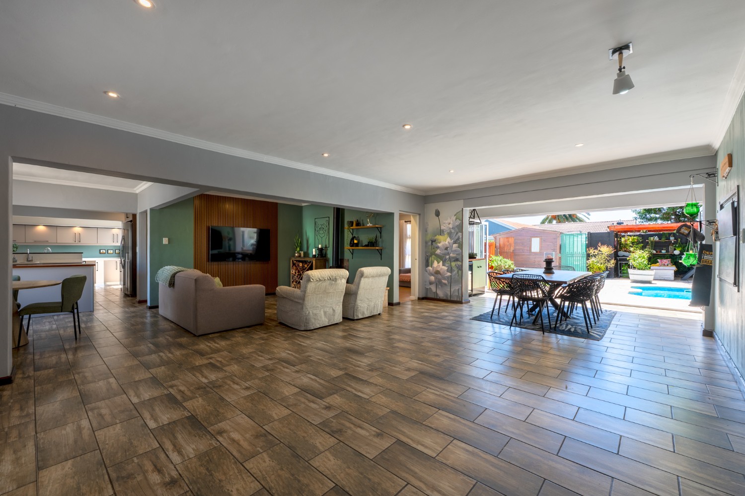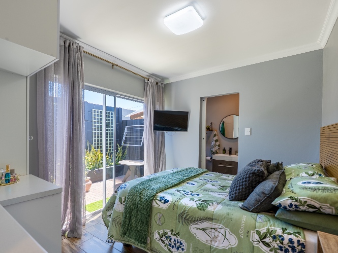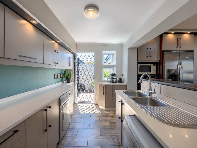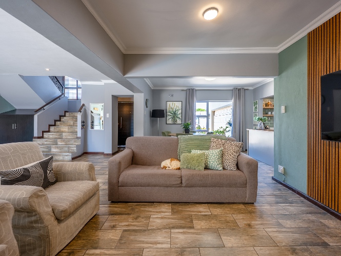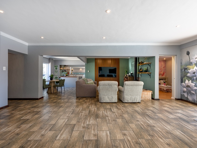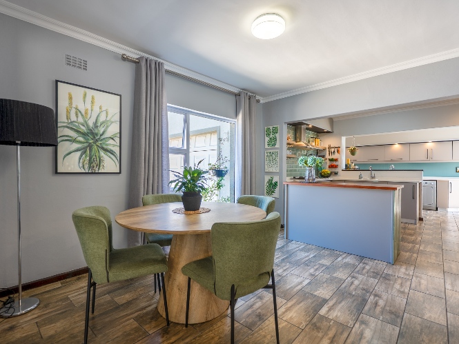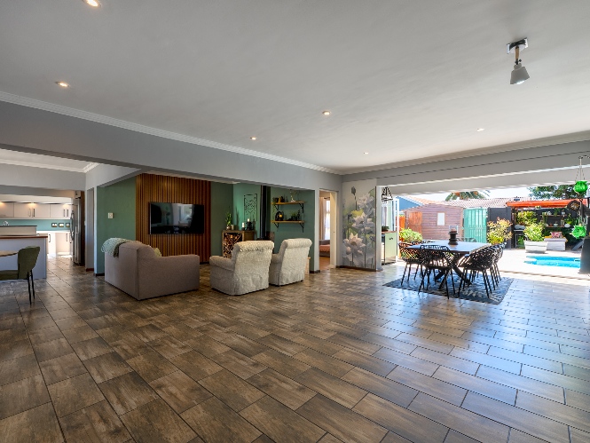 The main home features an expansive lounge, dining area and entertainment room with stylish flooring, a built-in braai and stacker doors that open onto the back garden, complete with a retractable awning and swimming pool. A cosy indoor fireplace enhances the lounge, which flows seamlessly into the modernised kitchen fitted with ample cupboard space, quartz countertops, a gas hob, oven and space for a double-door fridge. Adjacent to the kitchen is a well-appointed laundry and scullery with plumbing points, a double sink and additional cabinetry for extra storage.
