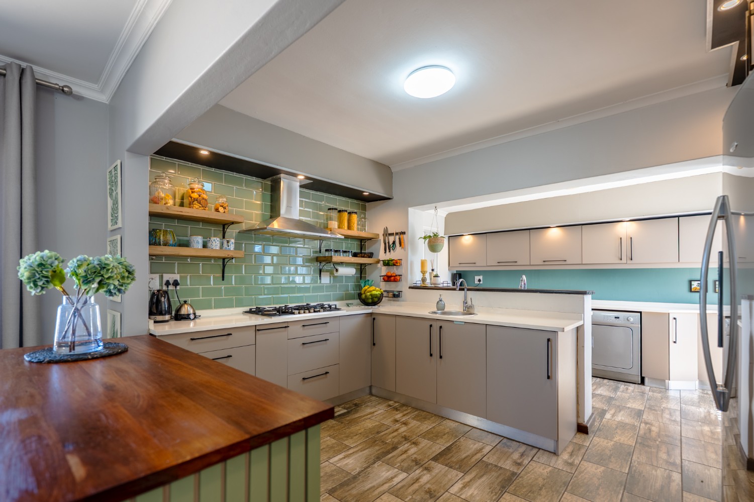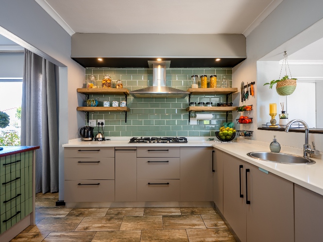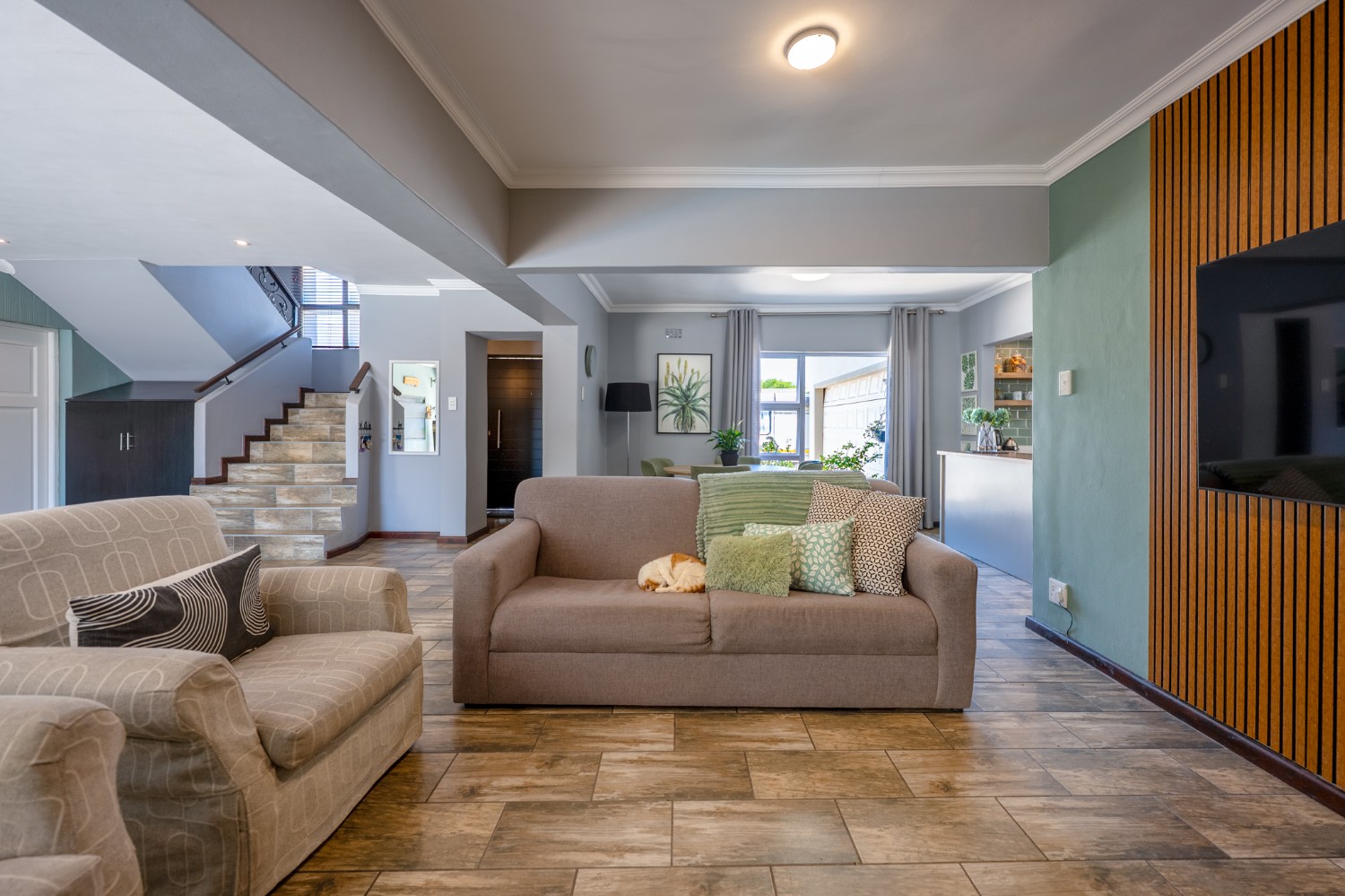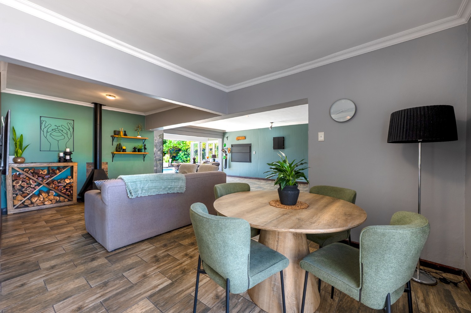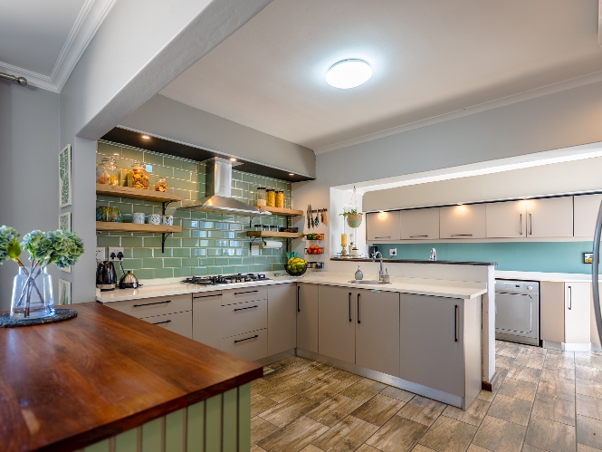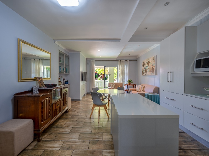 The main home features an expansive lounge, dining area and entertainment room with stylish flooring, a built-in braai and stacker doors that open onto the back garden, complete with a retractable awning and swimming pool. A cosy indoor fireplace enhances the lounge, which flows seamlessly into the modernised kitchen fitted with ample cupboard space, quartz countertops, a gas hob, oven and space for a double-door fridge. Adjacent to the kitchen is a well-appointed laundry and scullery with plumbing points, a double sink and additional cabinetry for extra storage.