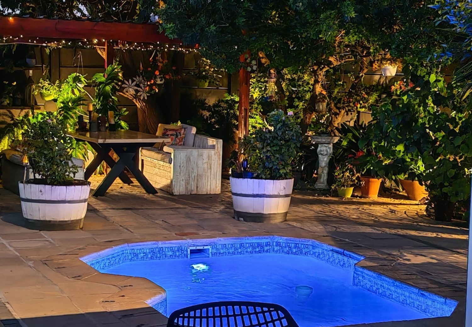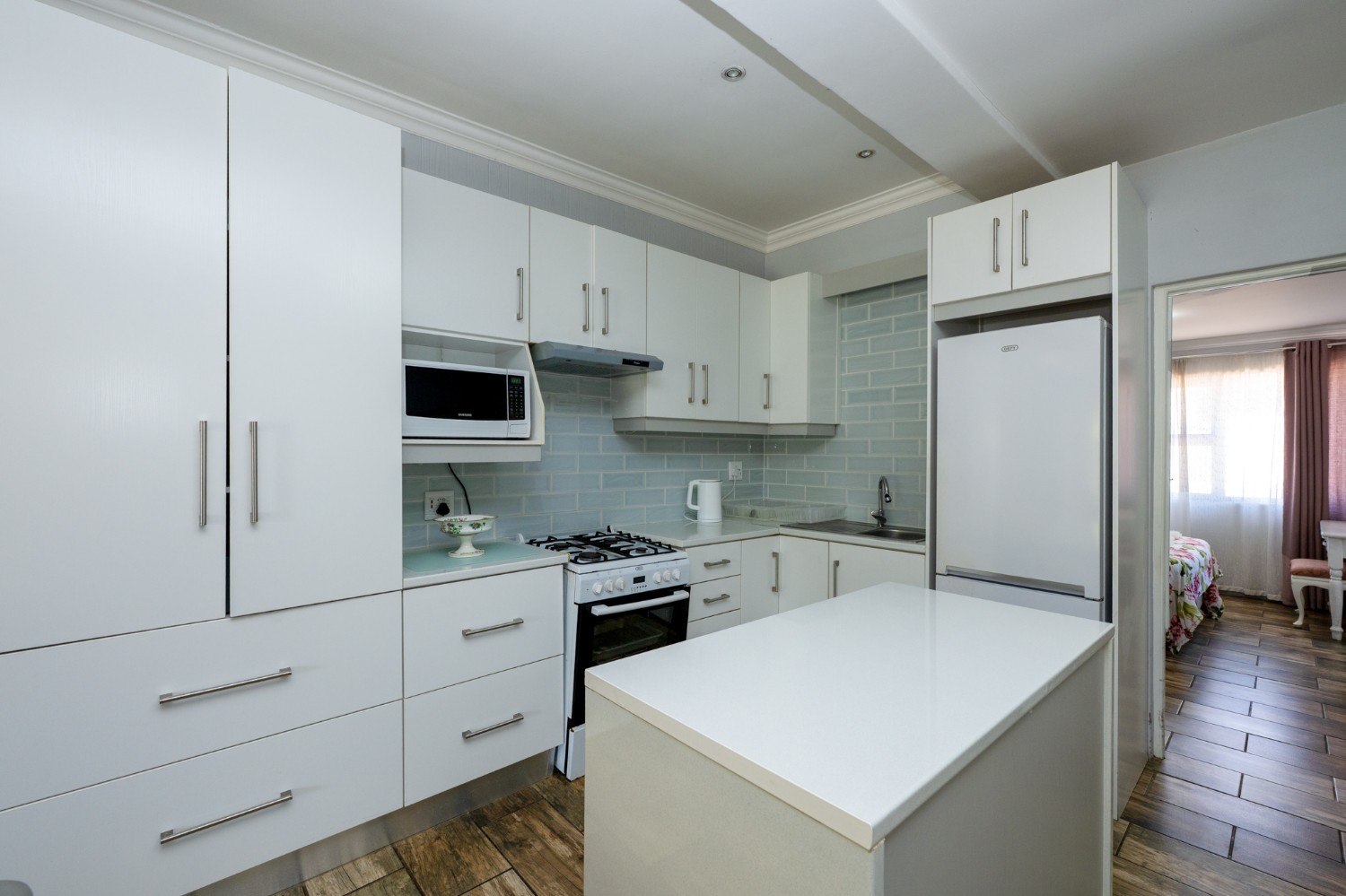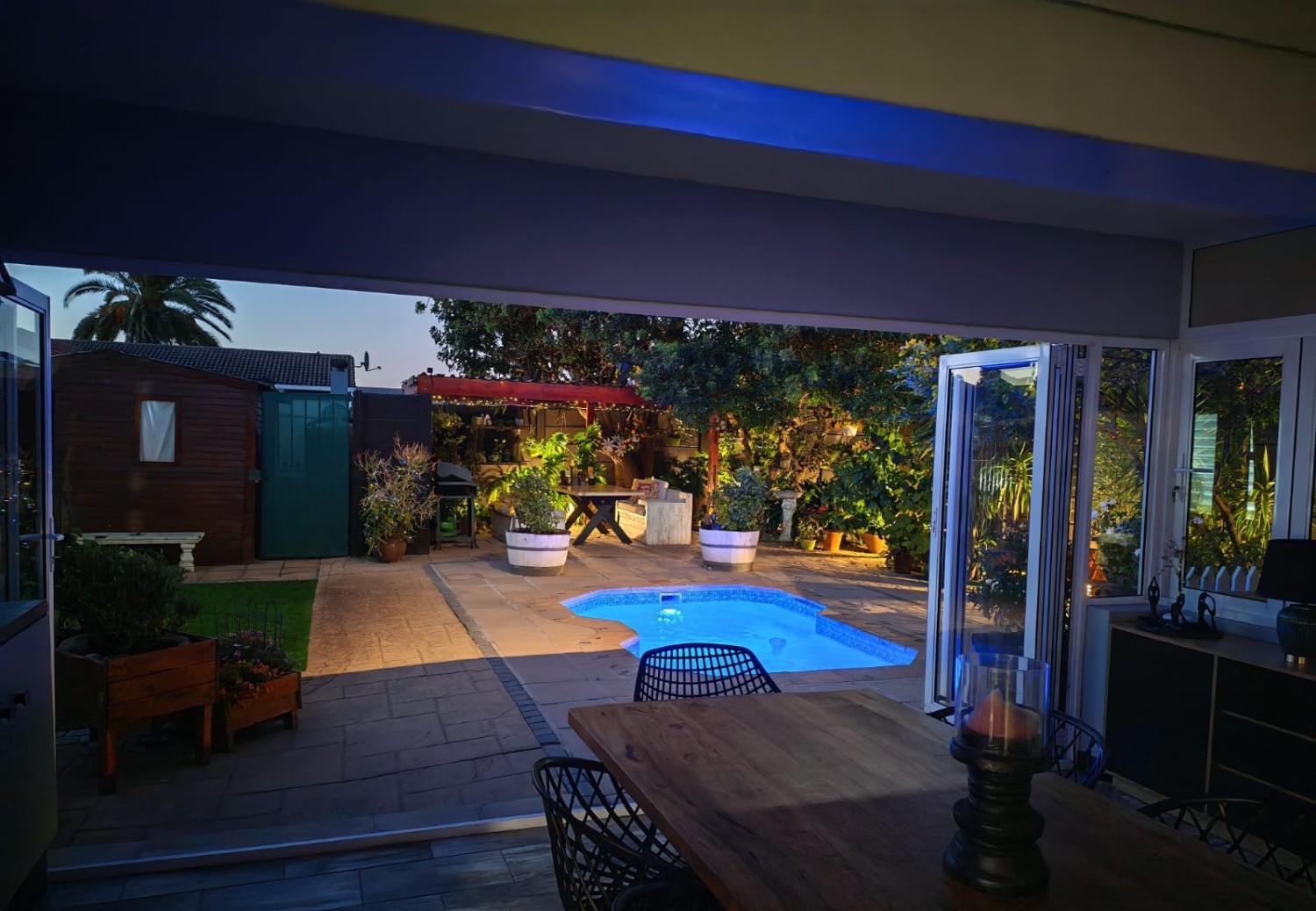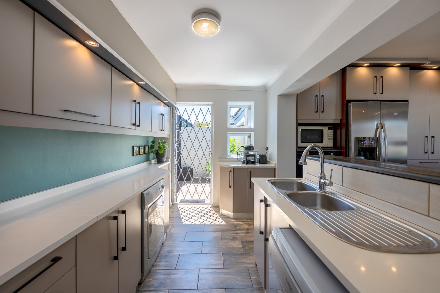 The main home features an expansive lounge, dining area and entertainment room with stylish flooring, a built-in braai and stacker doors that open onto the back garden, complete with a retractable awning and swimming pool. A cosy indoor fireplace enhances the lounge, which flows seamlessly into the modernised kitchen fitted with ample cupboard space, quartz countertops, a gas hob, oven and space for a double-door fridge. Adjacent to the kitchen is a well-appointed laundry and scullery with plumbing points, a double sink and additional cabinetry for extra storage.