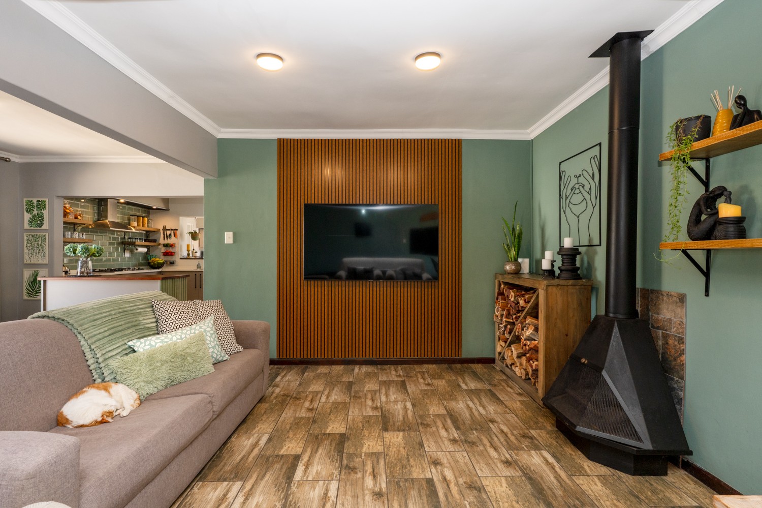 The third section features a charming lounge with a fireplace and an open-plan fitted kitchen with a double sink. The bedroom is complemented by a stylish en-suite bathroom with a walk-in shower, his-and-hers basins and a toilet.