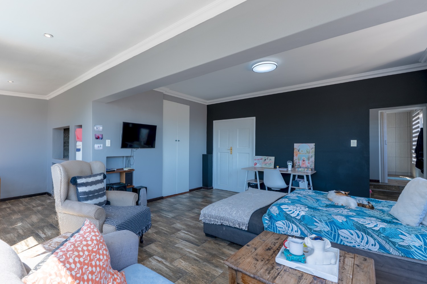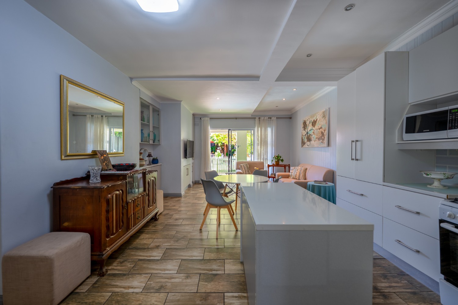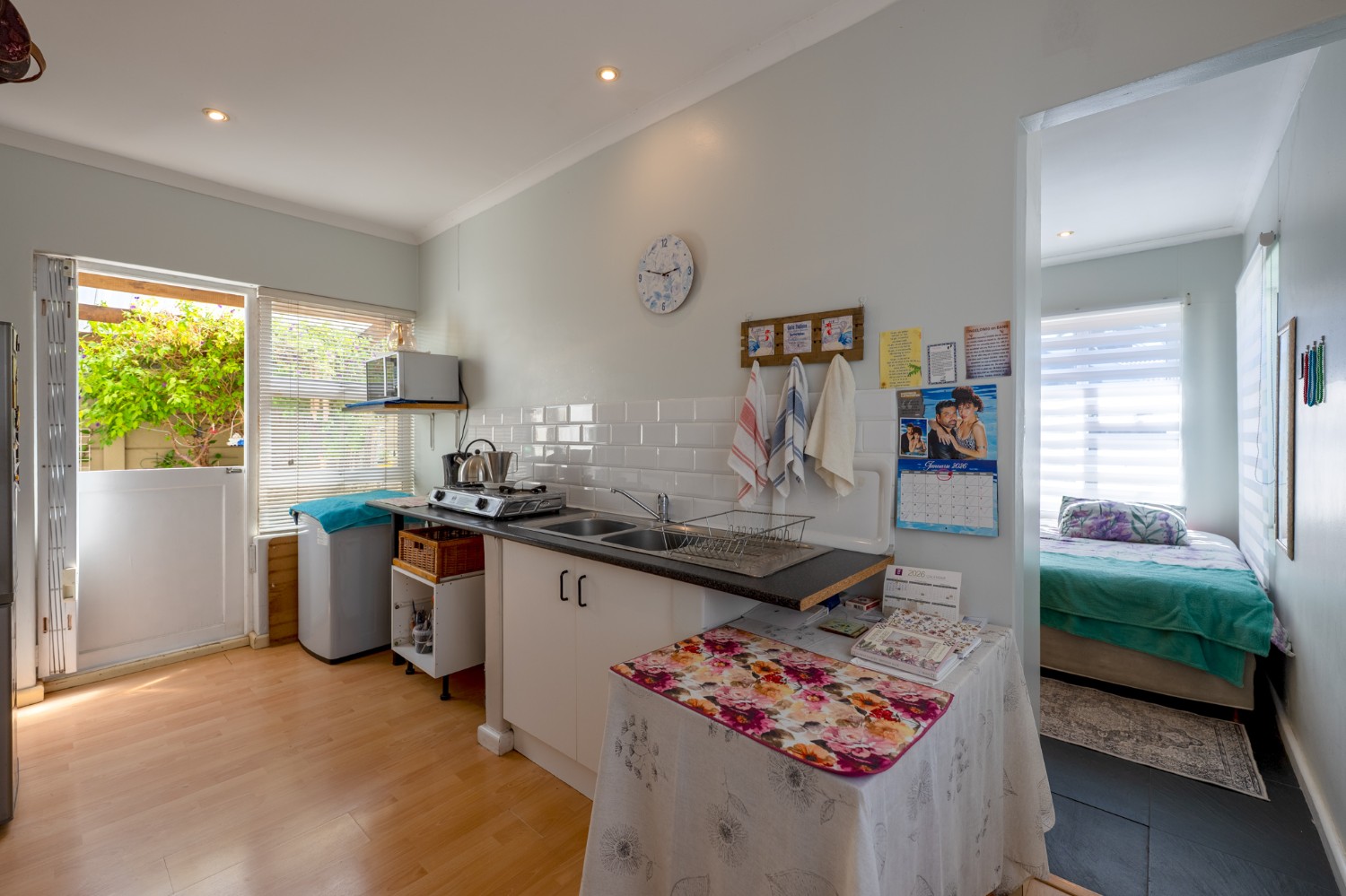 The second living unit offers an open-plan lounge, dining area and kitchen, with built-in cupboards, generous countertop space, a sink and space for a fridge. Sliding doors open onto a covered patio overlooking the garden. This unit includes a spacious bedroom with built-in cupboards and an en-suite bathroom.