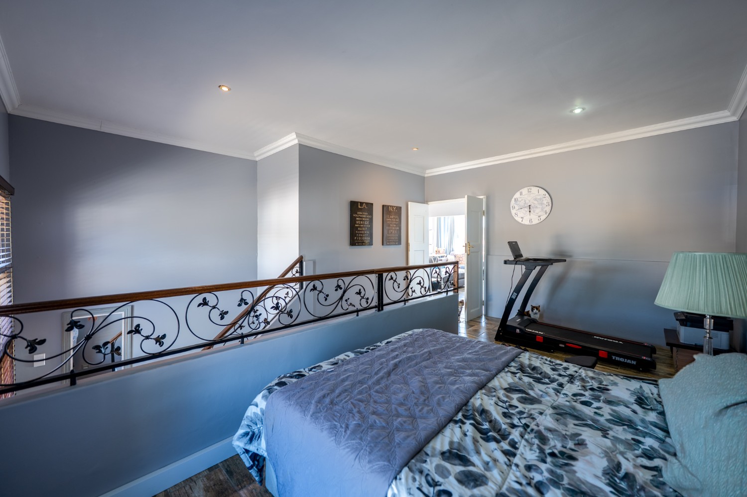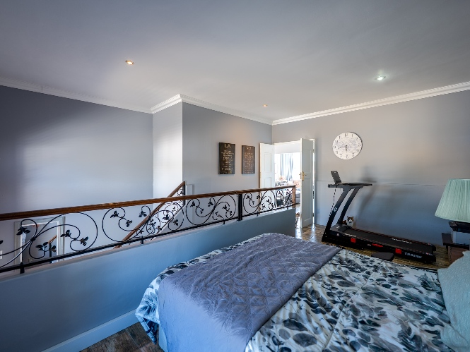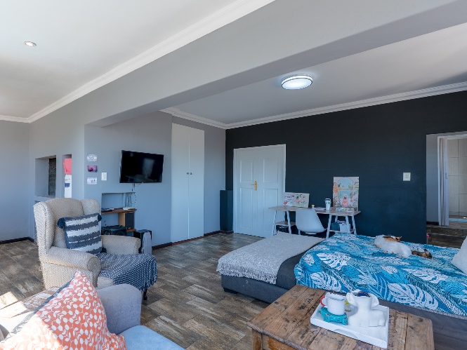Upstairs, the fourth and final section boasts a versatile landing area ideal for a study or additional living space. The expansive bedroom enjoys breathtaking Table Mountain views through large wall-to-wall windows. A fitted kitchen offers built-in cupboards, ample counter space, a sink and room for various appliances, while the bathroom includes a shower, basin and toilet.