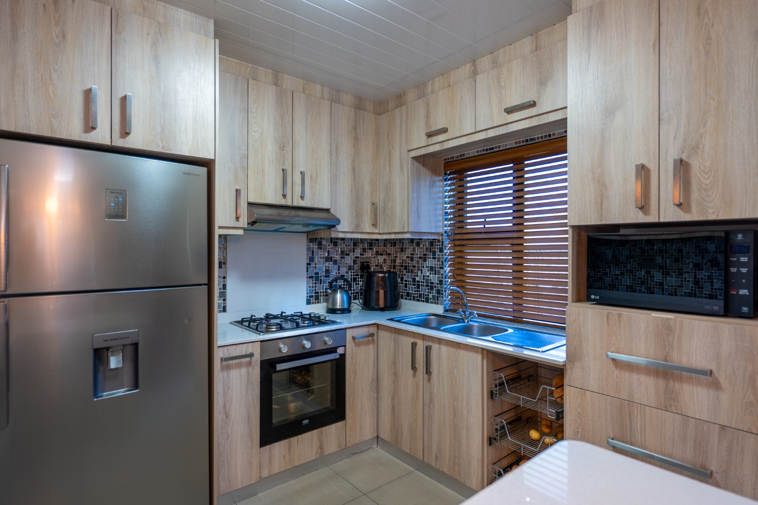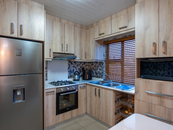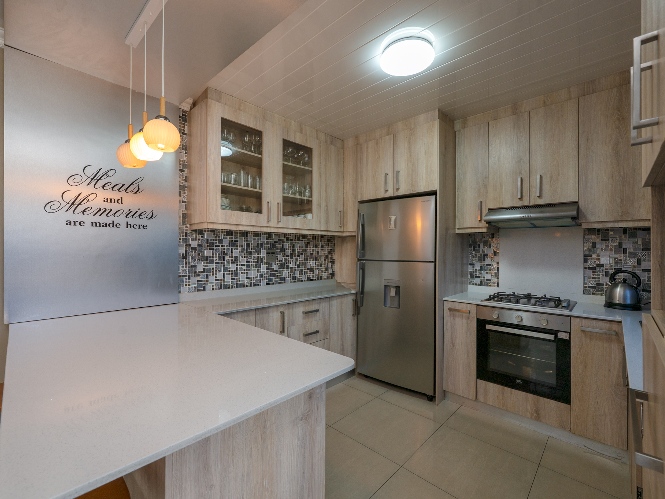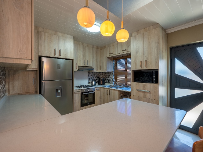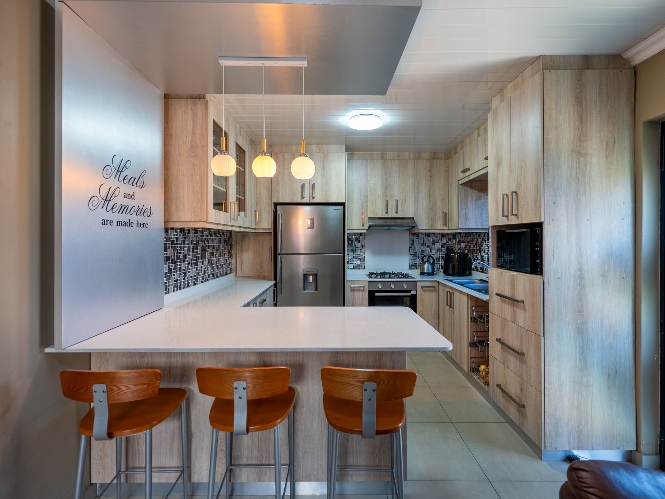 The home welcomes you with a brightly lit lounge featuring tiled flooring, creating a clean and contemporary living space. The modern kitchen is finished with gorgeous light wood cupboards, quartz countertops and includes a gas stove top, an electric oven, and ample space for a fridge.