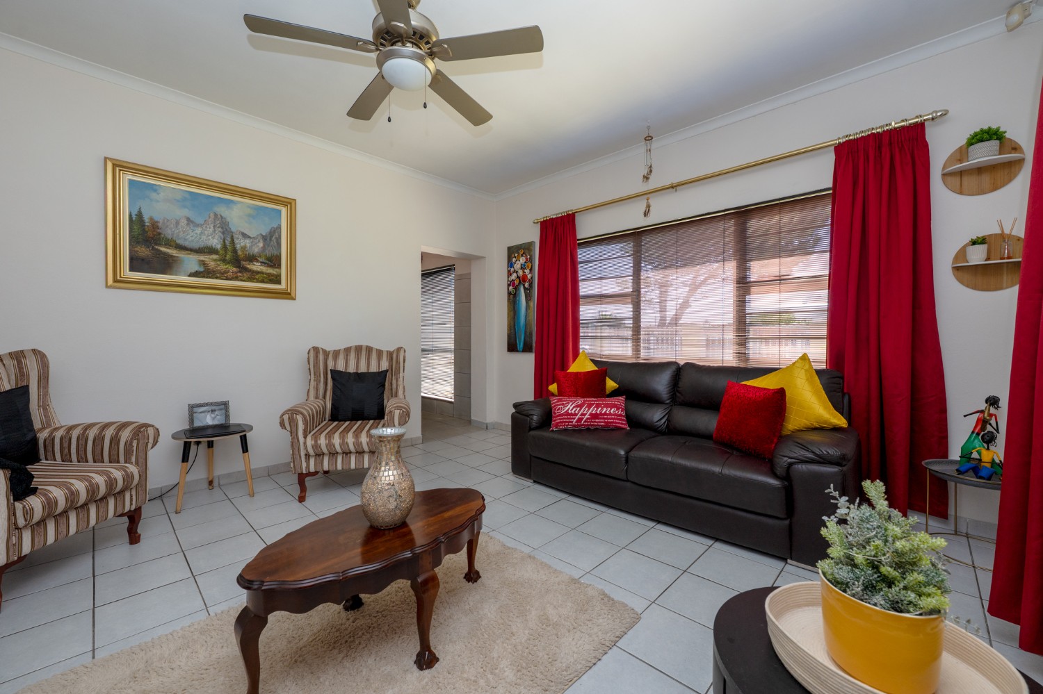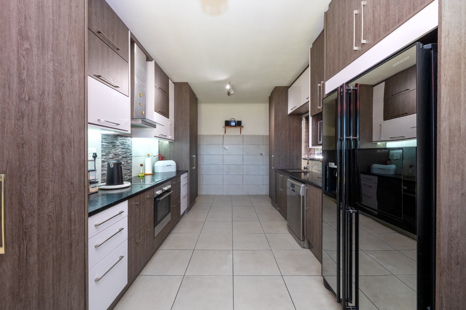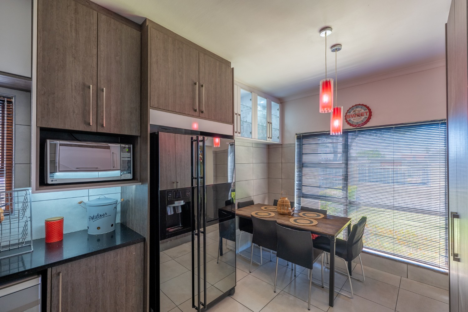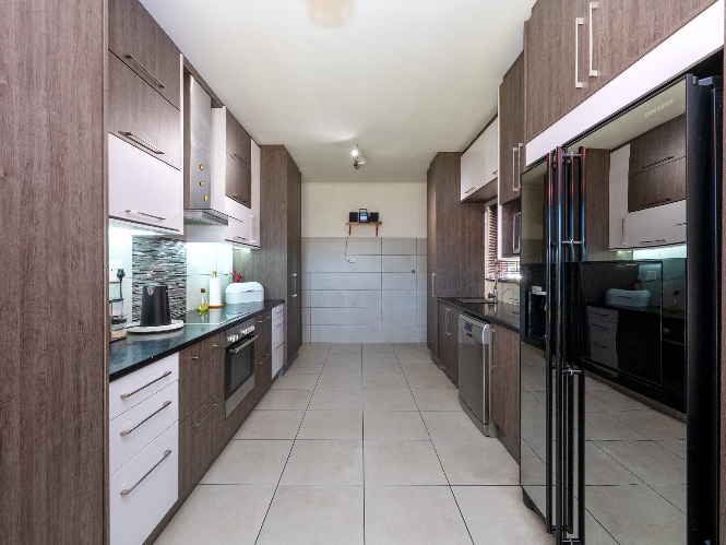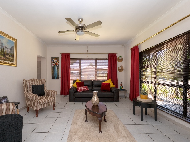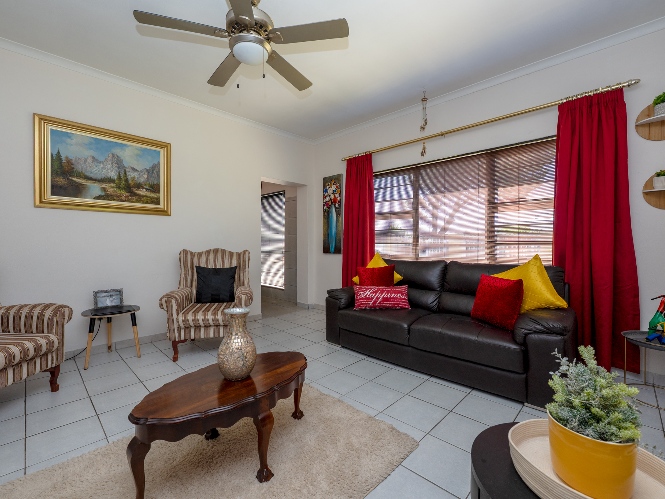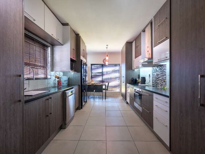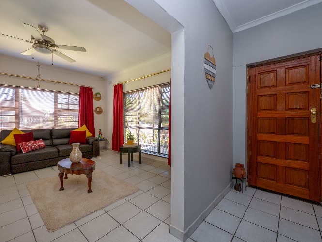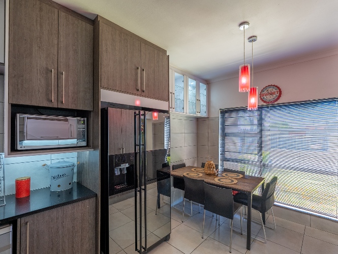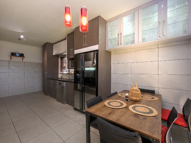 Inside, you will find a spacious, well-lit lounge with tiled flooring and a ceiling fan, creating a relaxed and airy living space ideal for everyday comfort. The modern kitchen is fitted with stylish dark wood cupboards and includes an under-counter oven and hob, one plumbing point, and a dining nook with ample space for a dining room table, making it perfect for family meals and entertaining.
