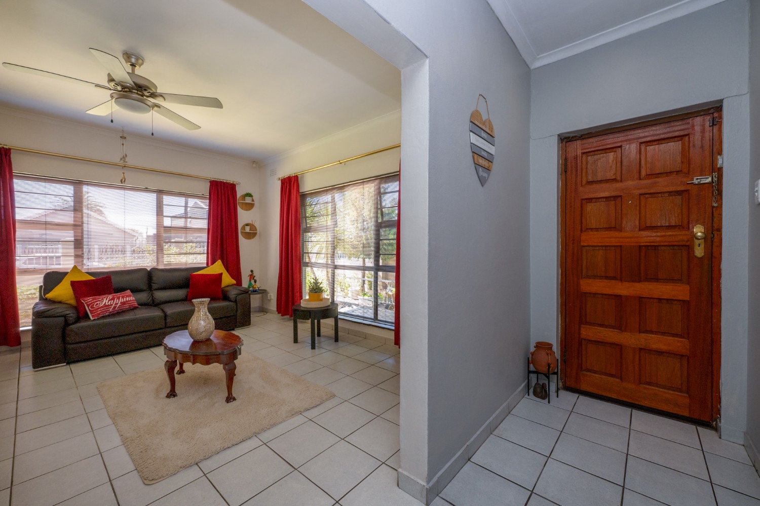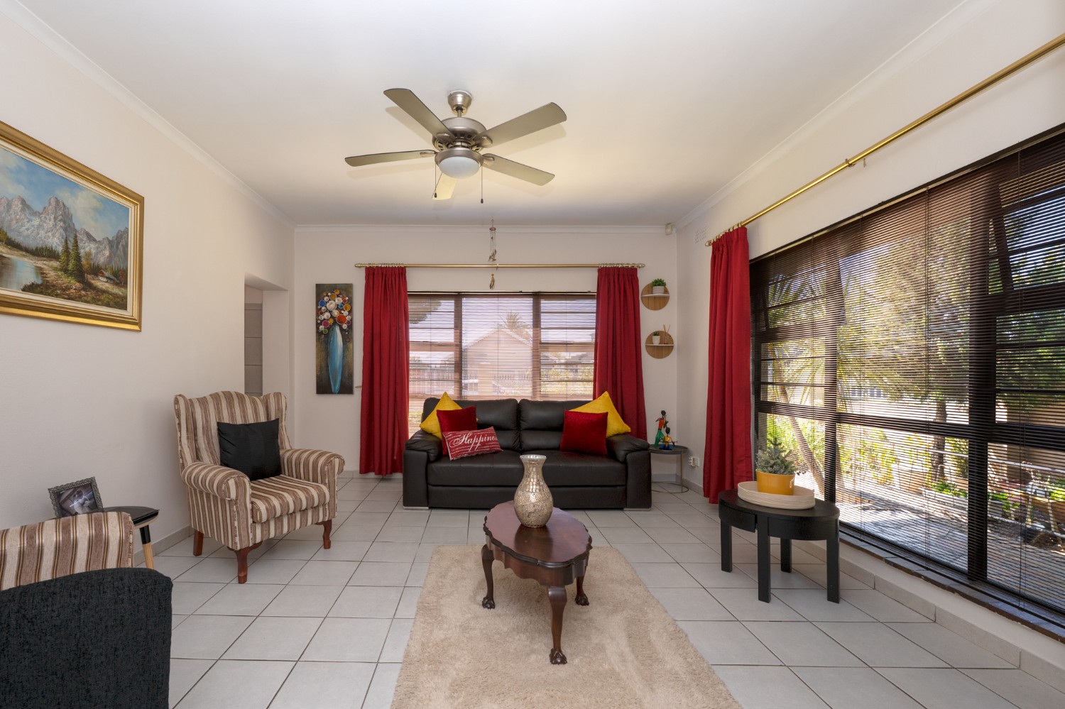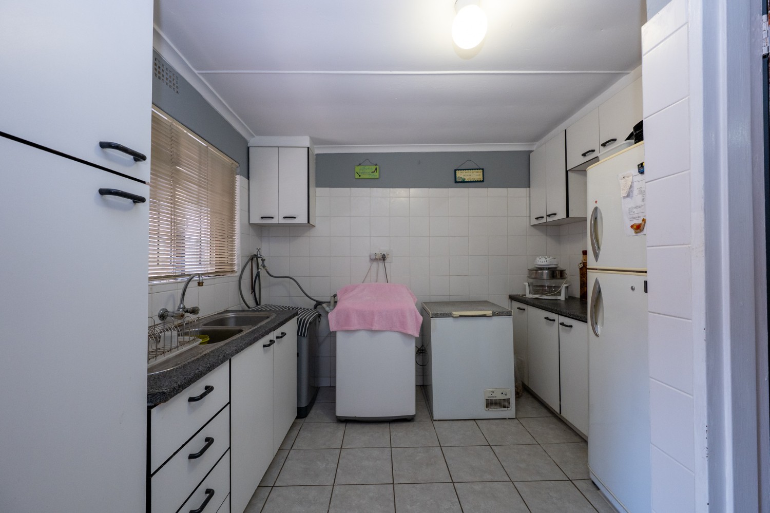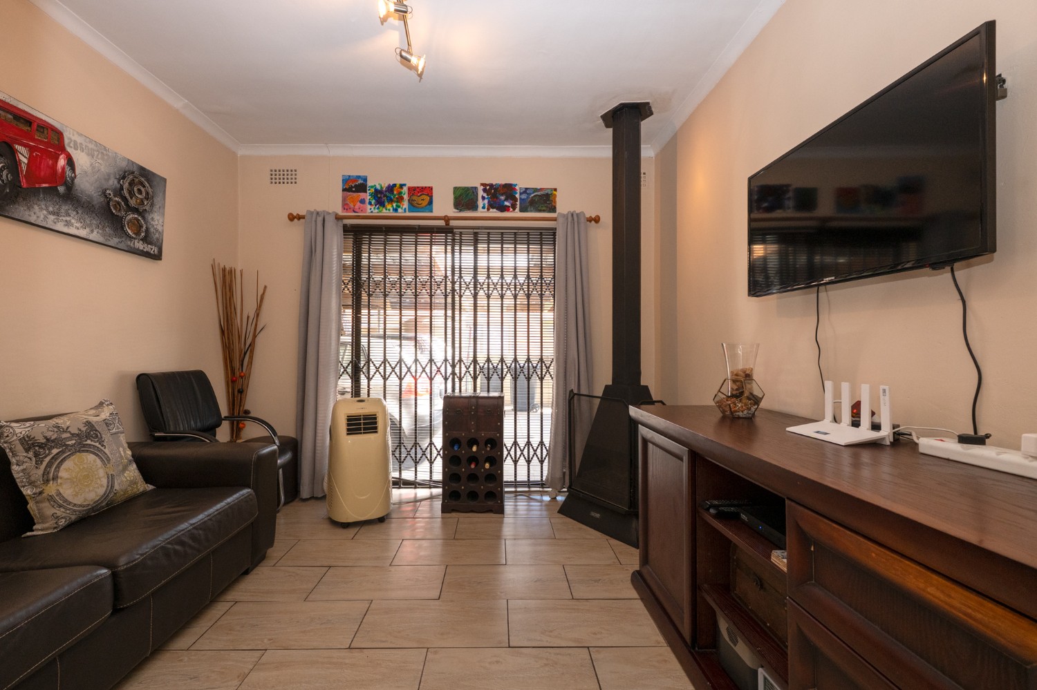Inside, you will find a spacious, well-lit lounge with tiled flooring and a ceiling fan, creating a relaxed and airy living space ideal for everyday comfort. The modern kitchen is fitted with stylish dark wood cupboards and includes an under-counter oven and hob, one plumbing point, and a dining nook with ample space for a dining room table, making it perfect for family meals and entertaining.