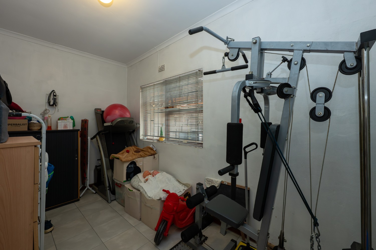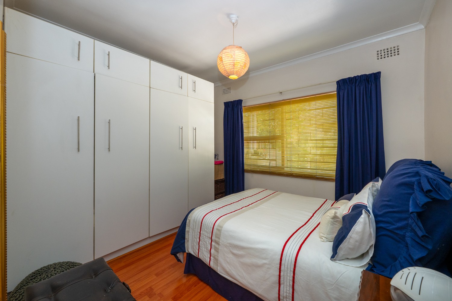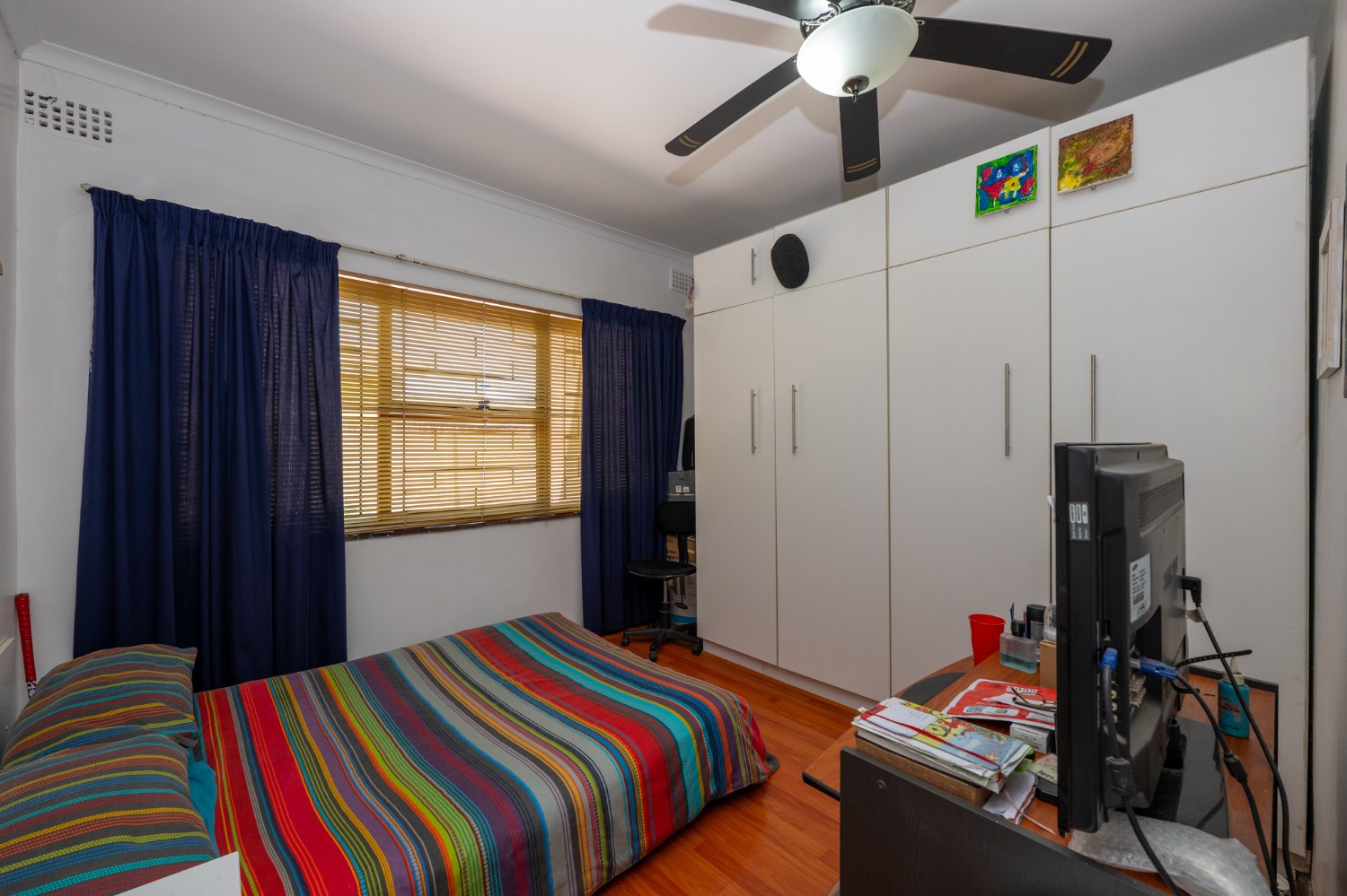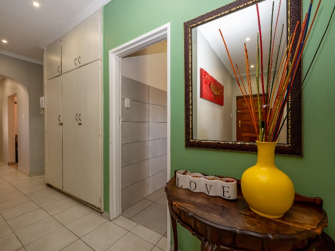 There are three well-sized bedrooms, all with built-in cupboards. The main bedroom boasts a modern en-suite bathroom with a corner bathtub, basin and toilet. The family bathroom is fitted with a bathtub, shower, basin, and toilet. A separate study offers flexibility and can easily be used as a fourth bedroom if needed.