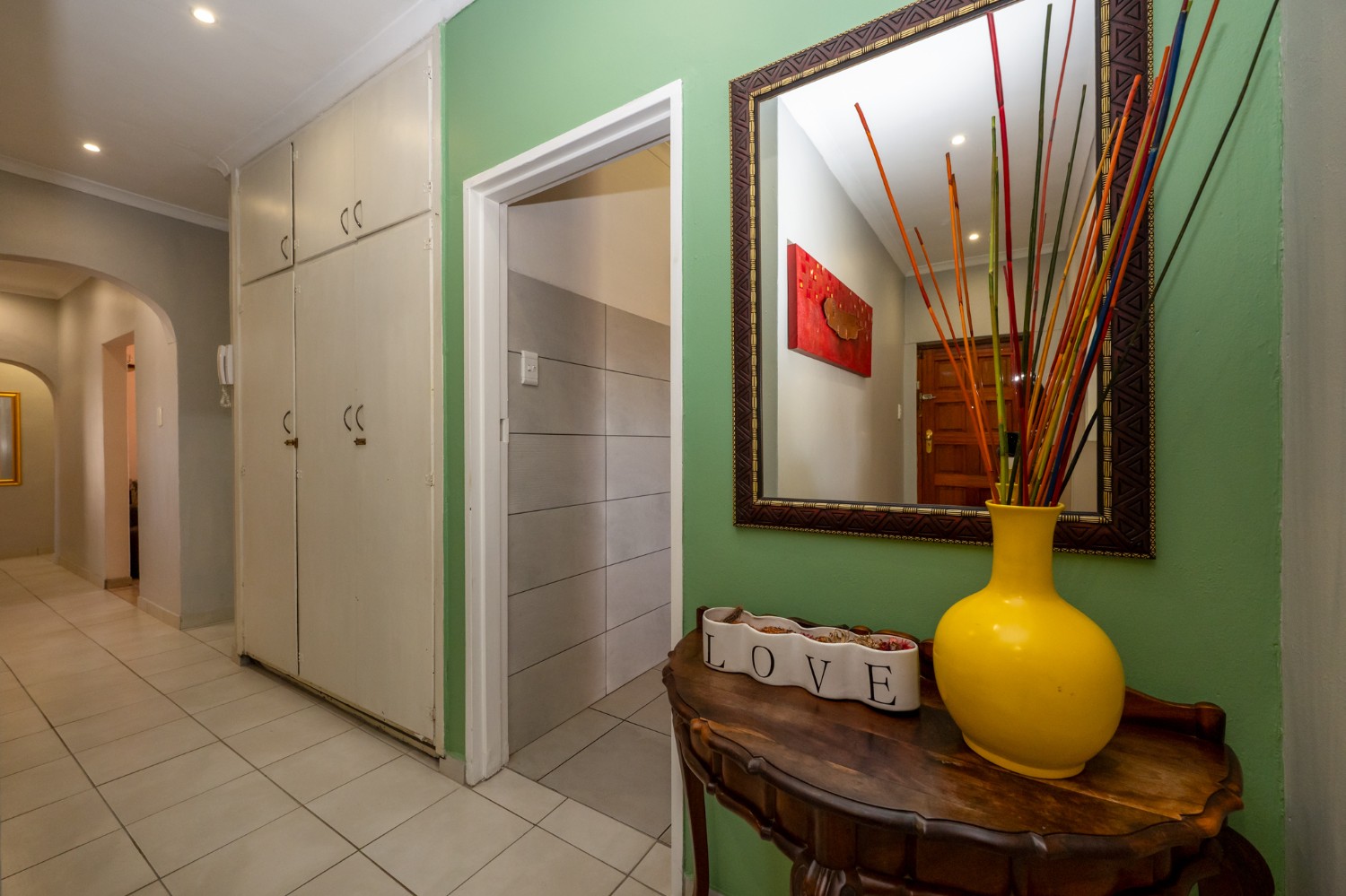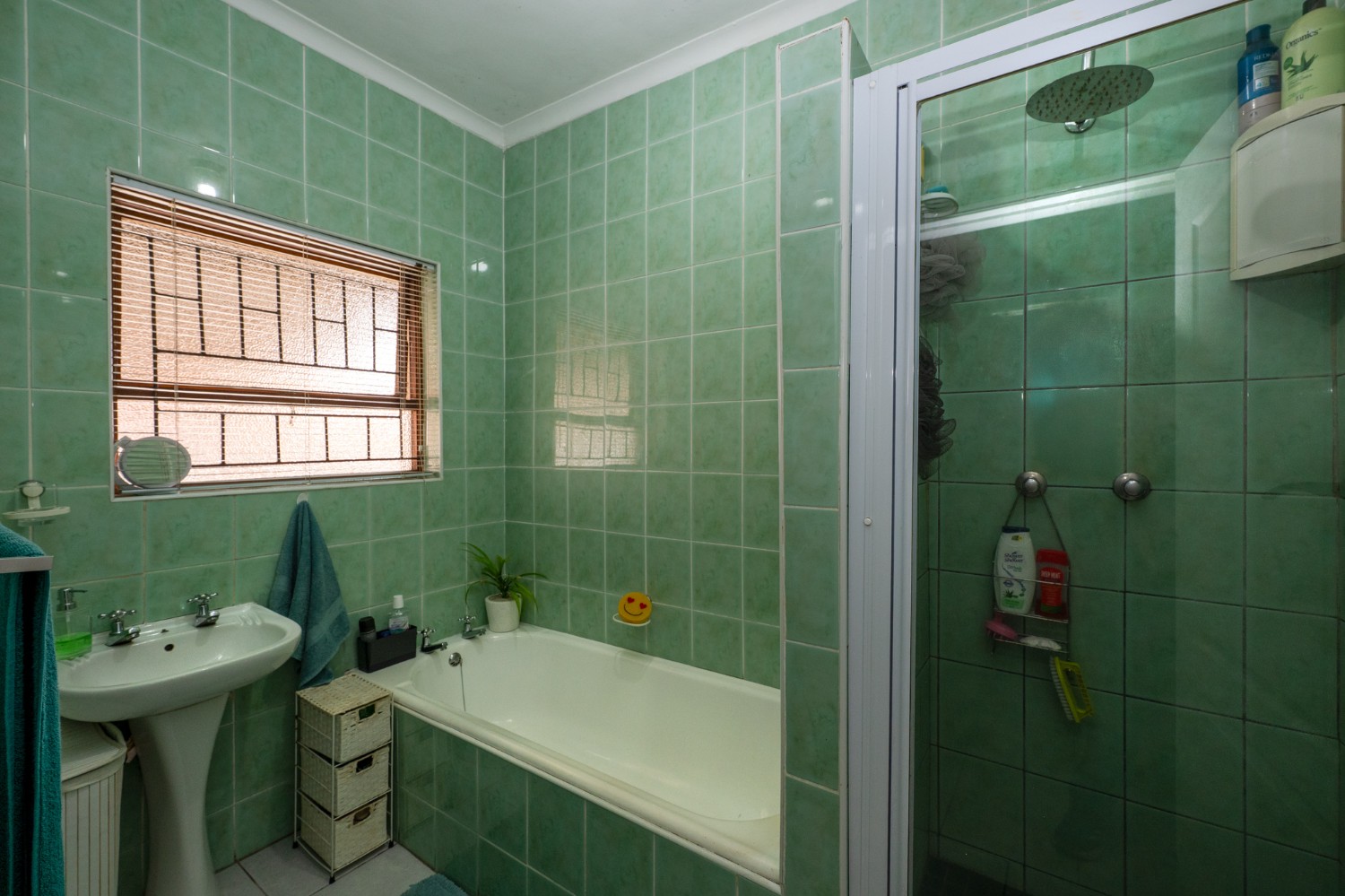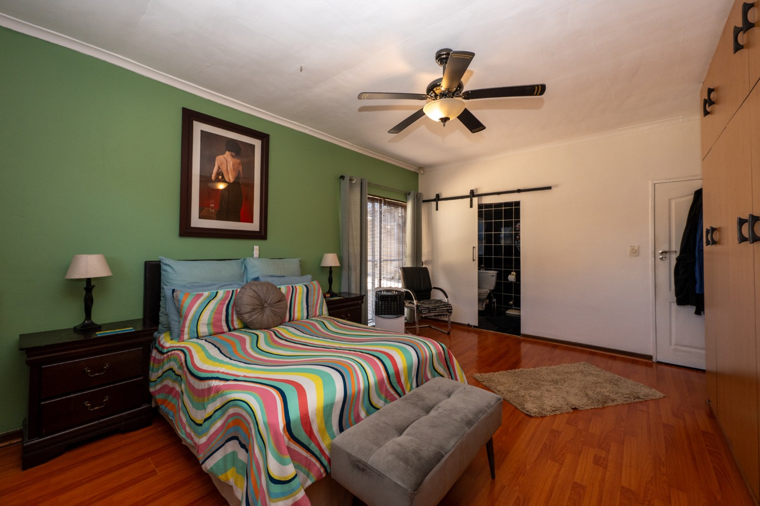 There are three well-sized bedrooms, all with built-in cupboards. The main bedroom boasts a modern en-suite bathroom with a corner bathtub, basin and toilet. The family bathroom is fitted with a bathtub, shower, basin, and toilet. A separate study offers flexibility and can easily be used as a fourth bedroom if needed.