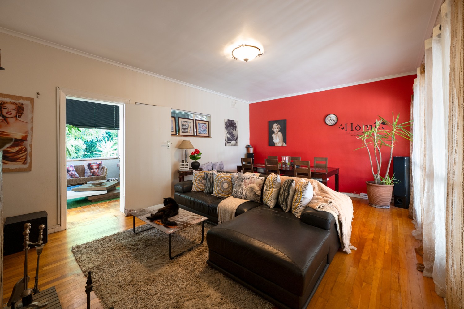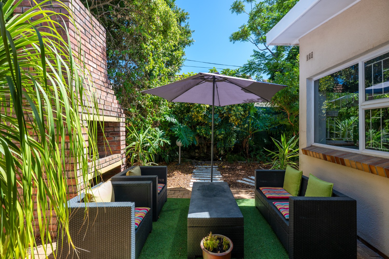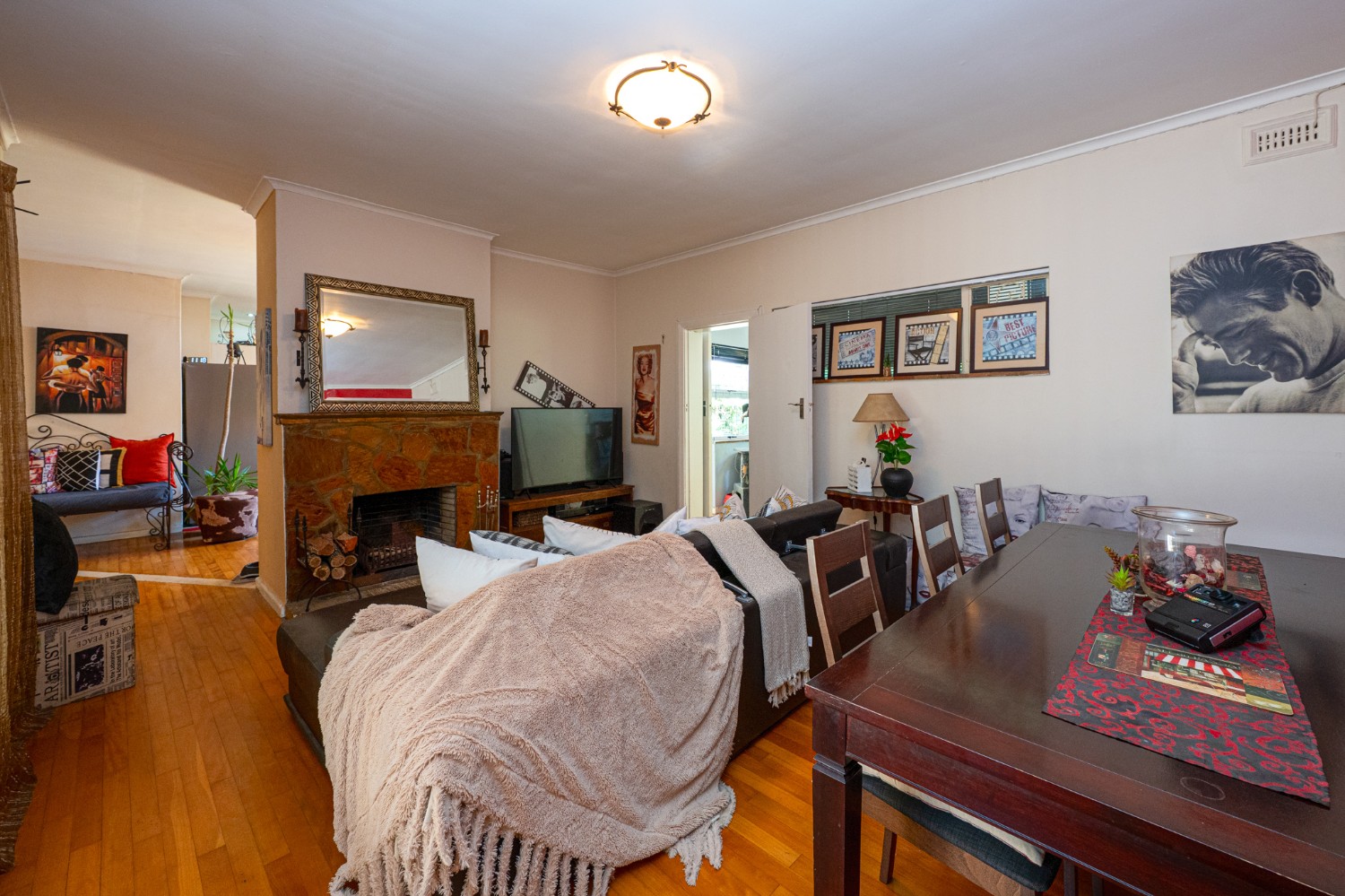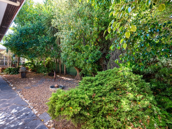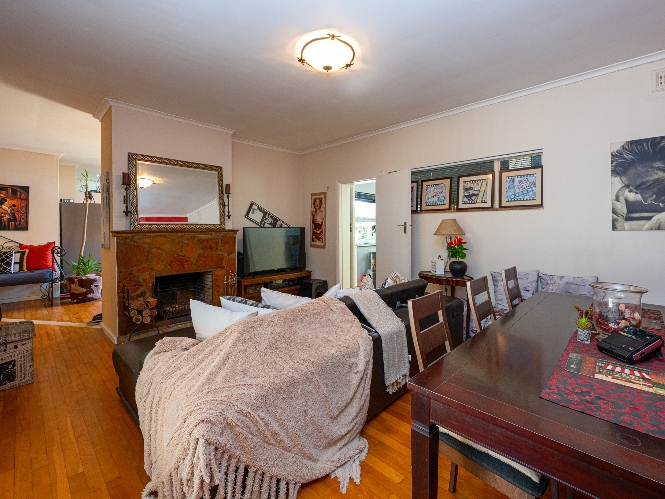 The property welcomes you through the generous entrance hall that leads seamlessly into the lounge and dining area, featuring wooden floors and a cosy indoor fireplace. Just off the lounge is an entertainment or sunroom, ideal for hosting guests and relaxing in a light-filled space. The kitchen is fitted with light wood cupboards, a gas stove top and eye-level oven, multiple plumbing points for a washing machine and dishwasher, and a sliding door that opens onto a lush, green backyard.