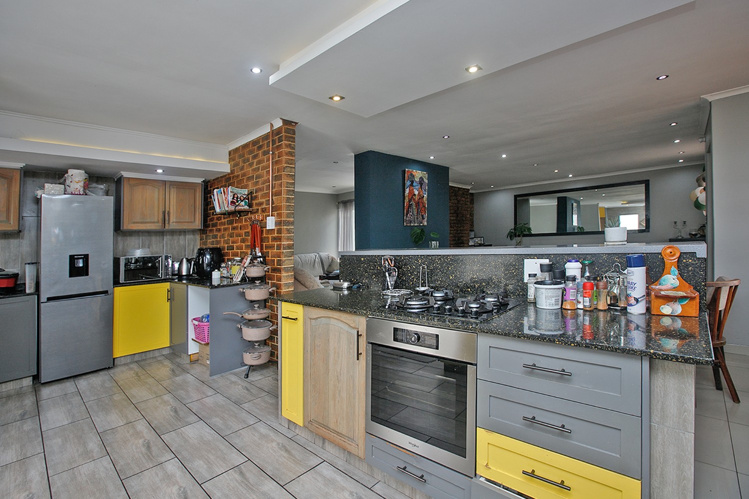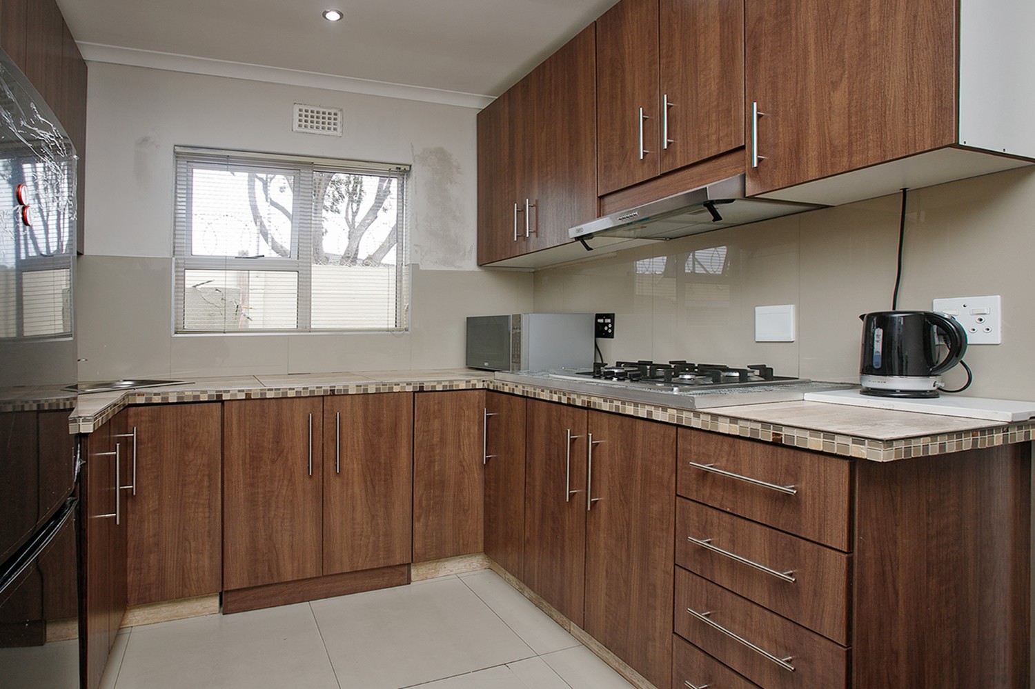 The kitchen has granite countertops, an electric oven and hob, with plumbing for two appliances.