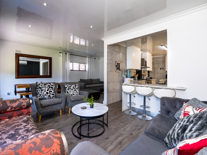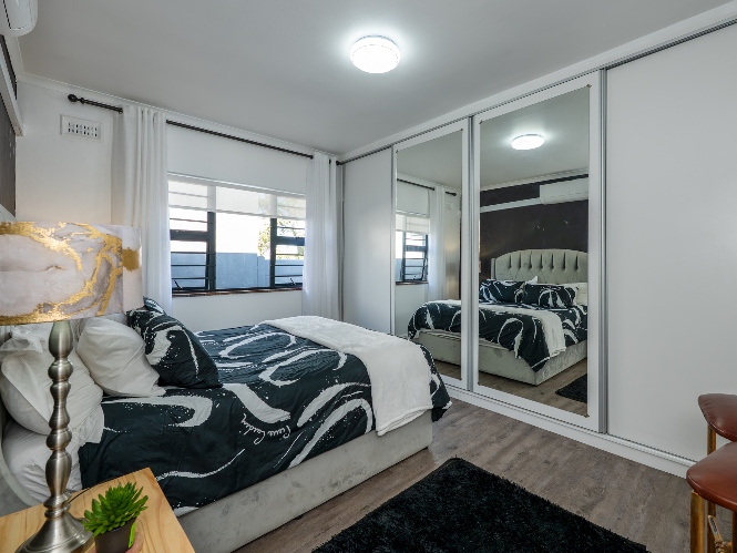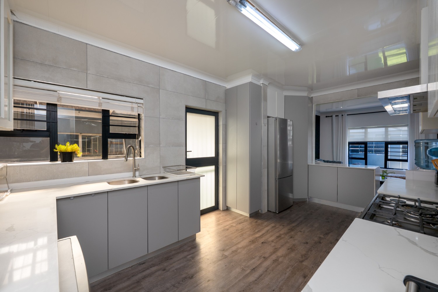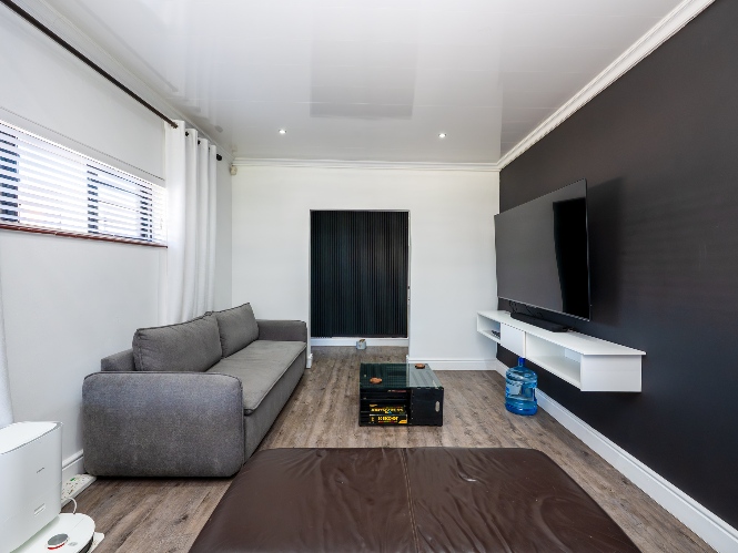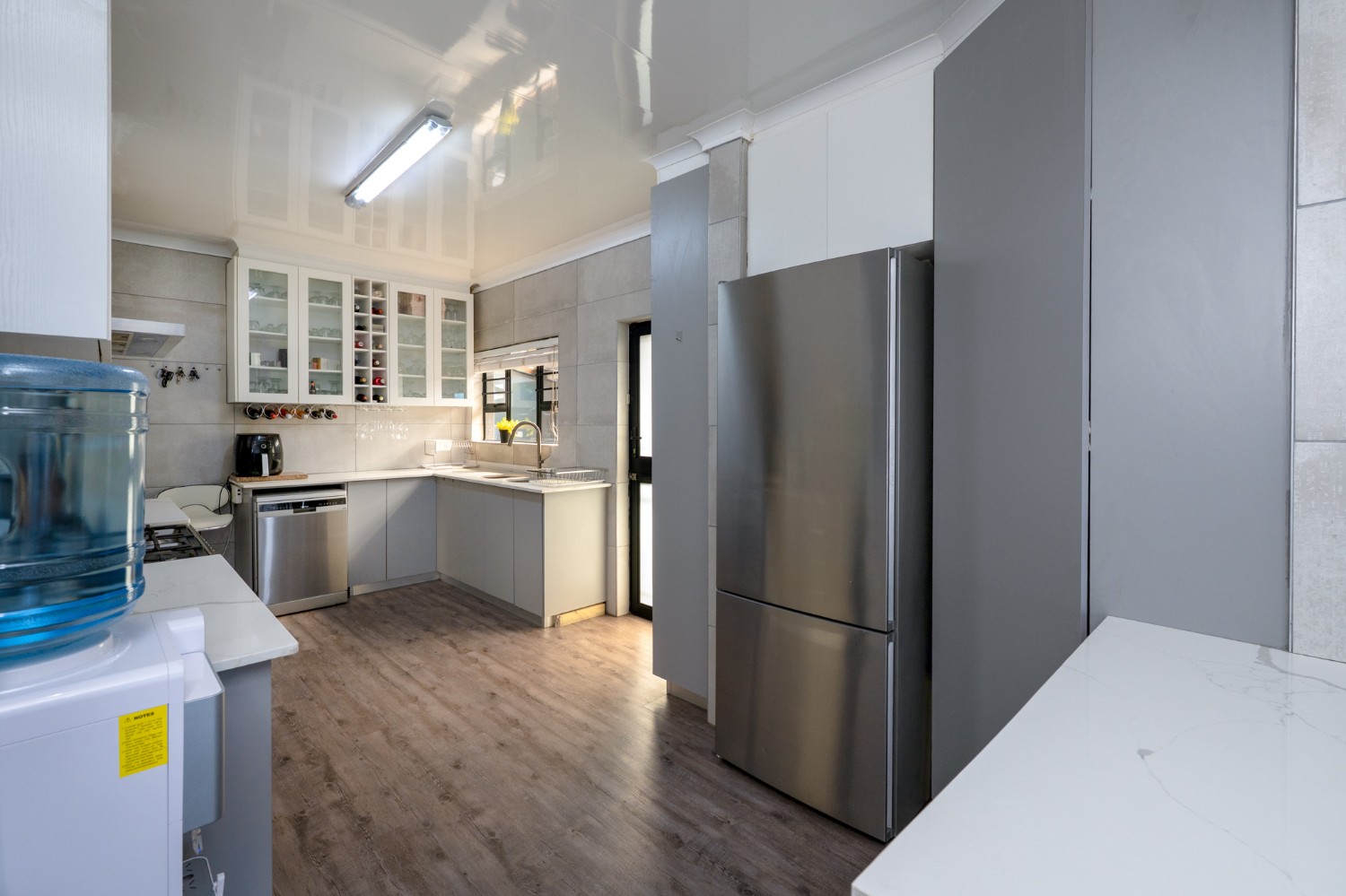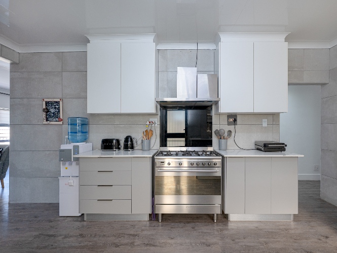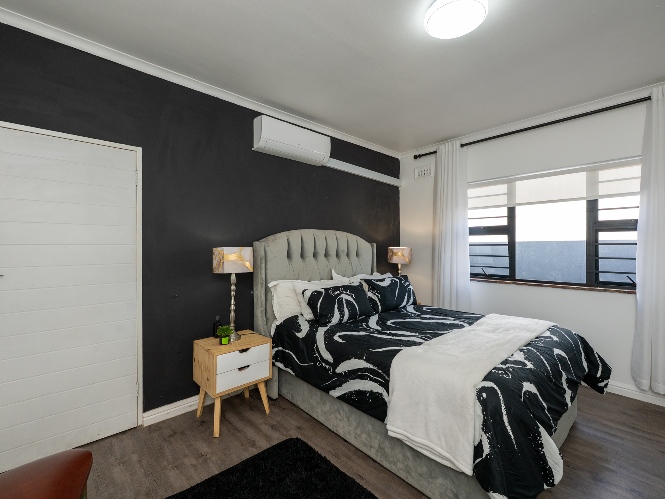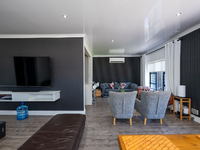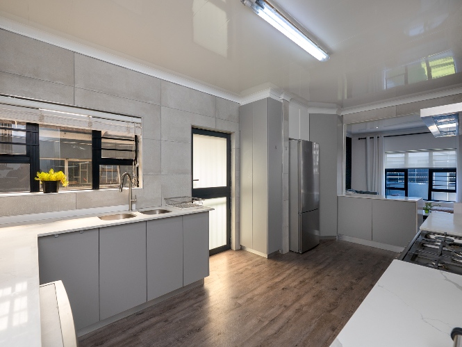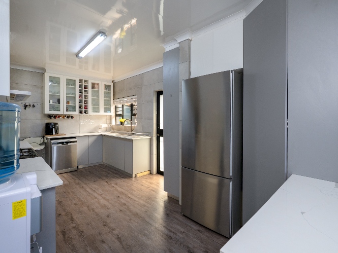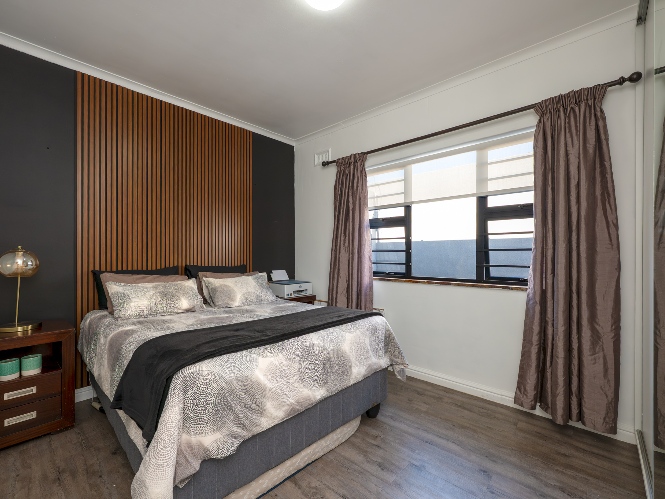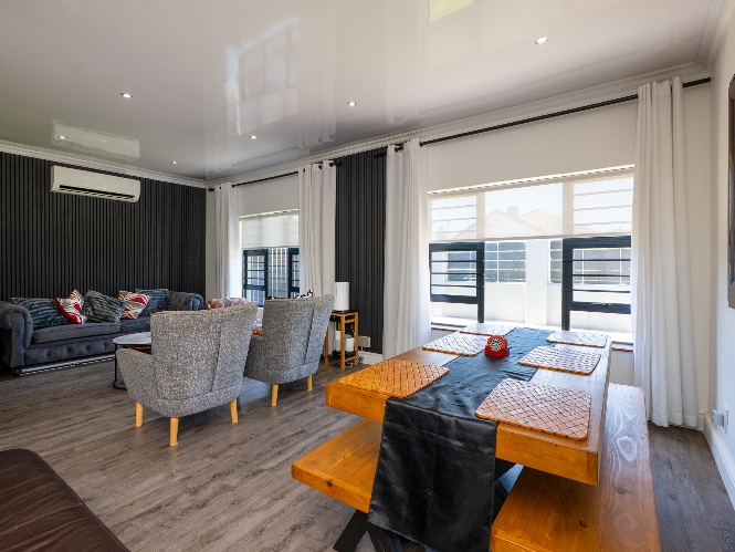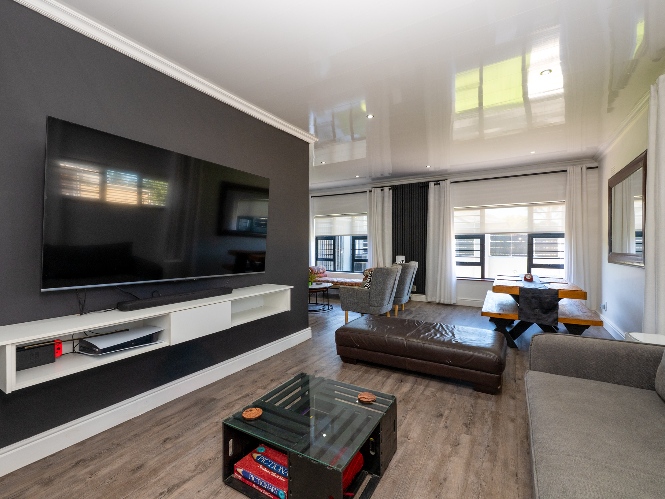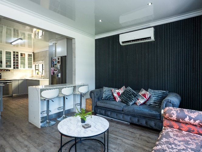 Step inside to a bright and airy open-plan lounge, TV room and dining room, designed for seamless flow and everyday comfort. The living space is fitted with air-conditioning, ensuring a pleasant atmosphere all year round. Large windows allow natural light to fill the home, enhancing the modern finishes throughout. The gorgeous kitchen features light wood cupboards and stone countertops that create a warm and contemporary feel. The kitchen also includes a double sink, a plumbing point for a washing machine or dishwasher, as well as a dedicated space for a fridge.