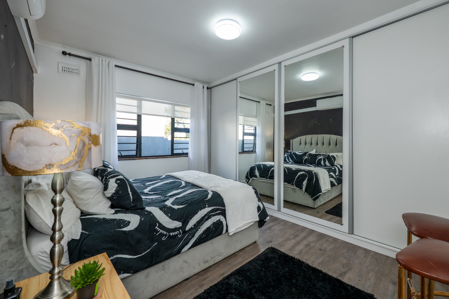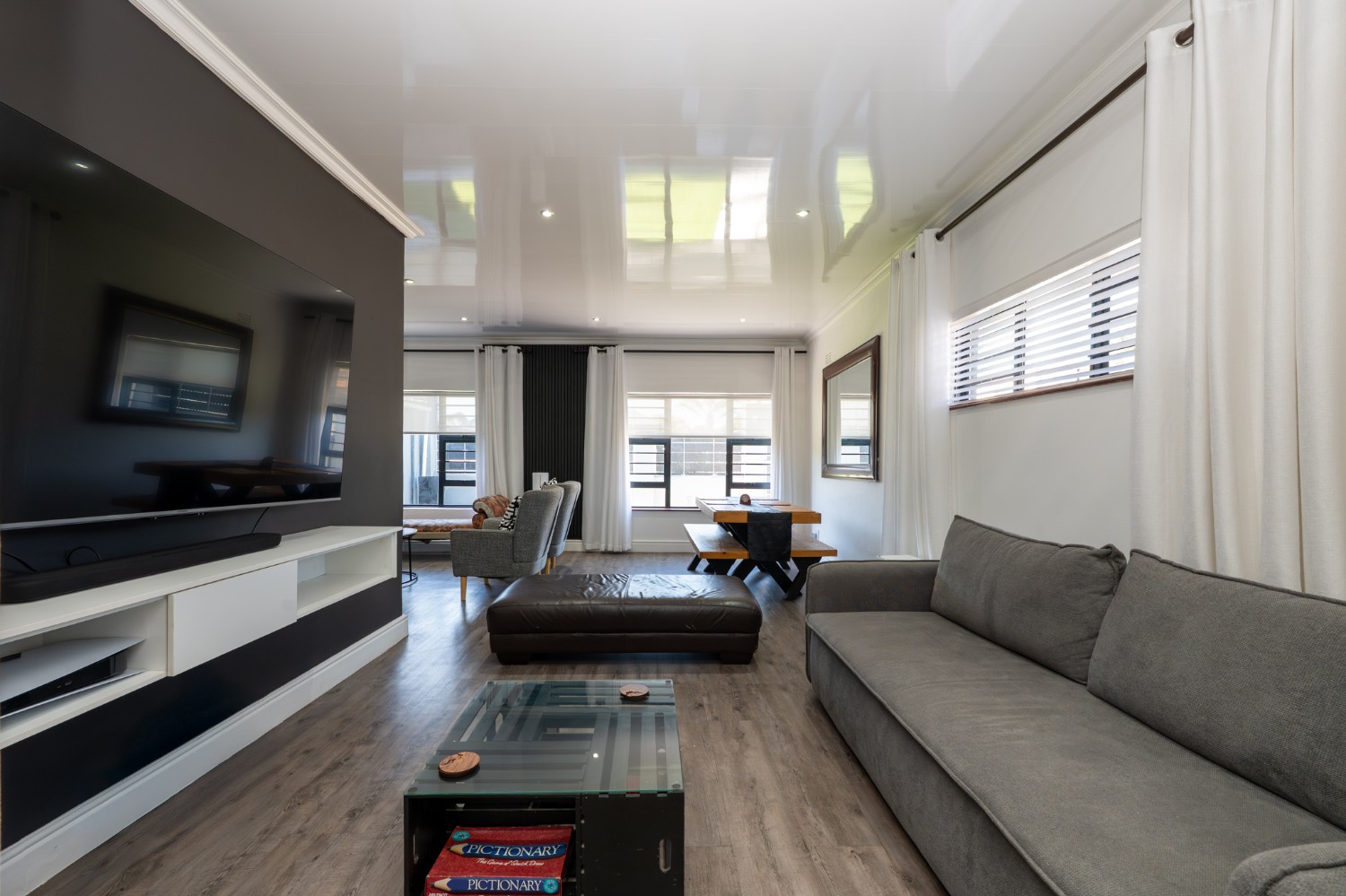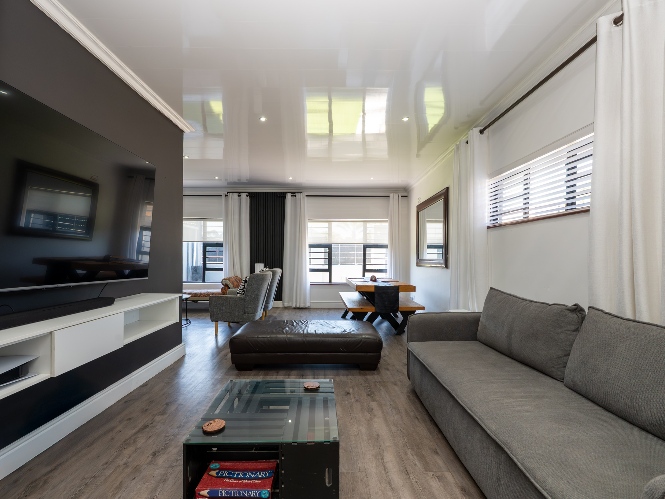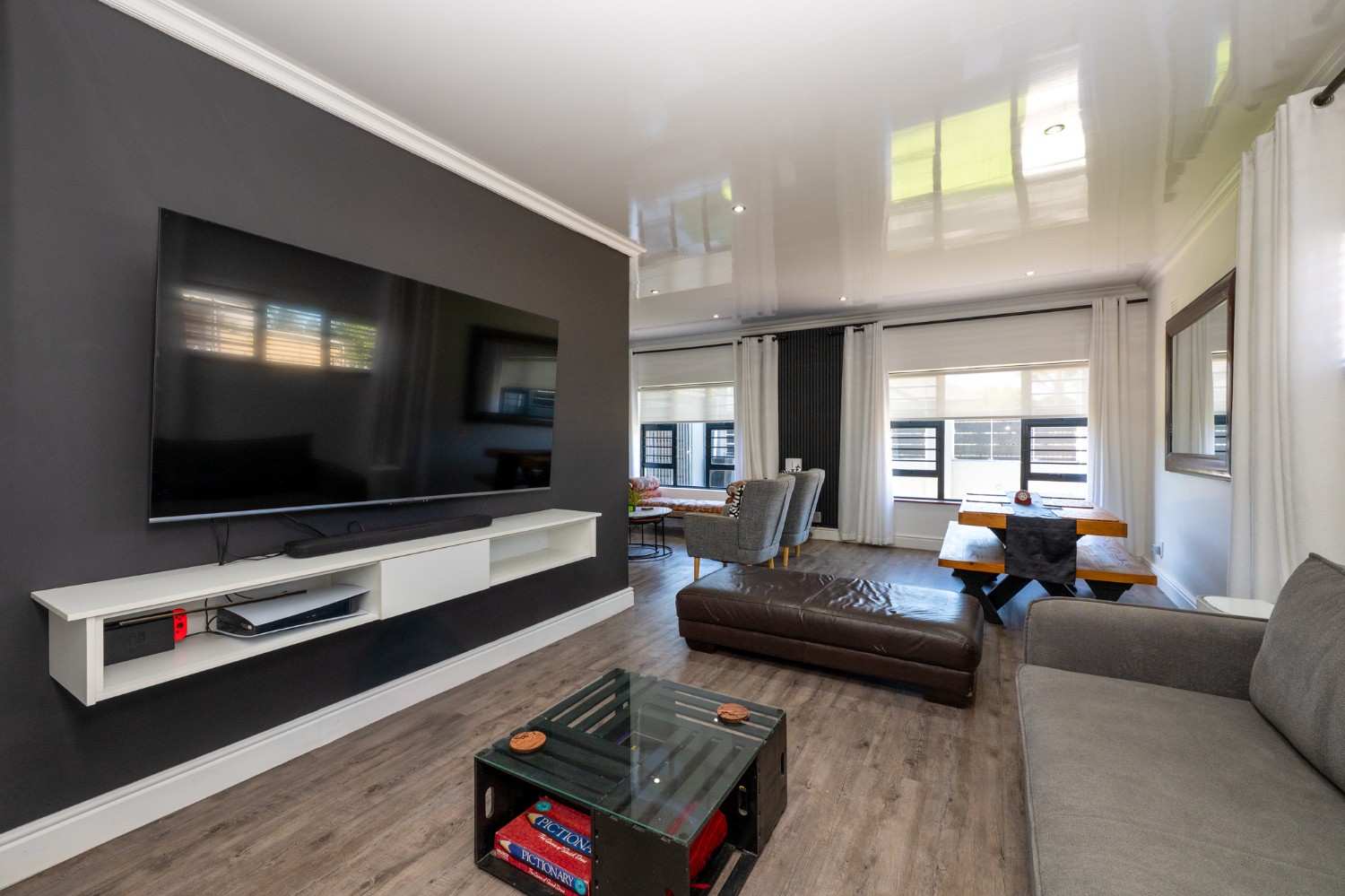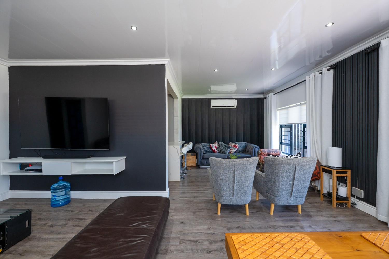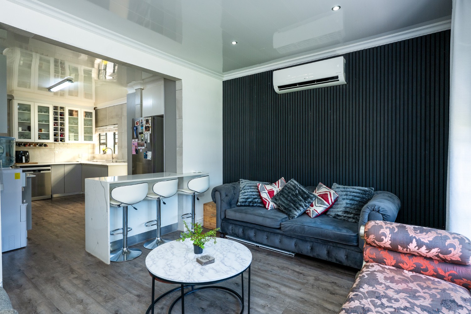 Step inside to a bright and airy open-plan lounge, TV room and dining room, designed for seamless flow and everyday comfort. The living space is fitted with air-conditioning, ensuring a pleasant atmosphere all year round. Large windows allow natural light to fill the home, enhancing the modern finishes throughout. The gorgeous kitchen features light wood cupboards and stone countertops that create a warm and contemporary feel. The kitchen also includes a double sink, a plumbing point for a washing machine or dishwasher, as well as a dedicated space for a fridge.