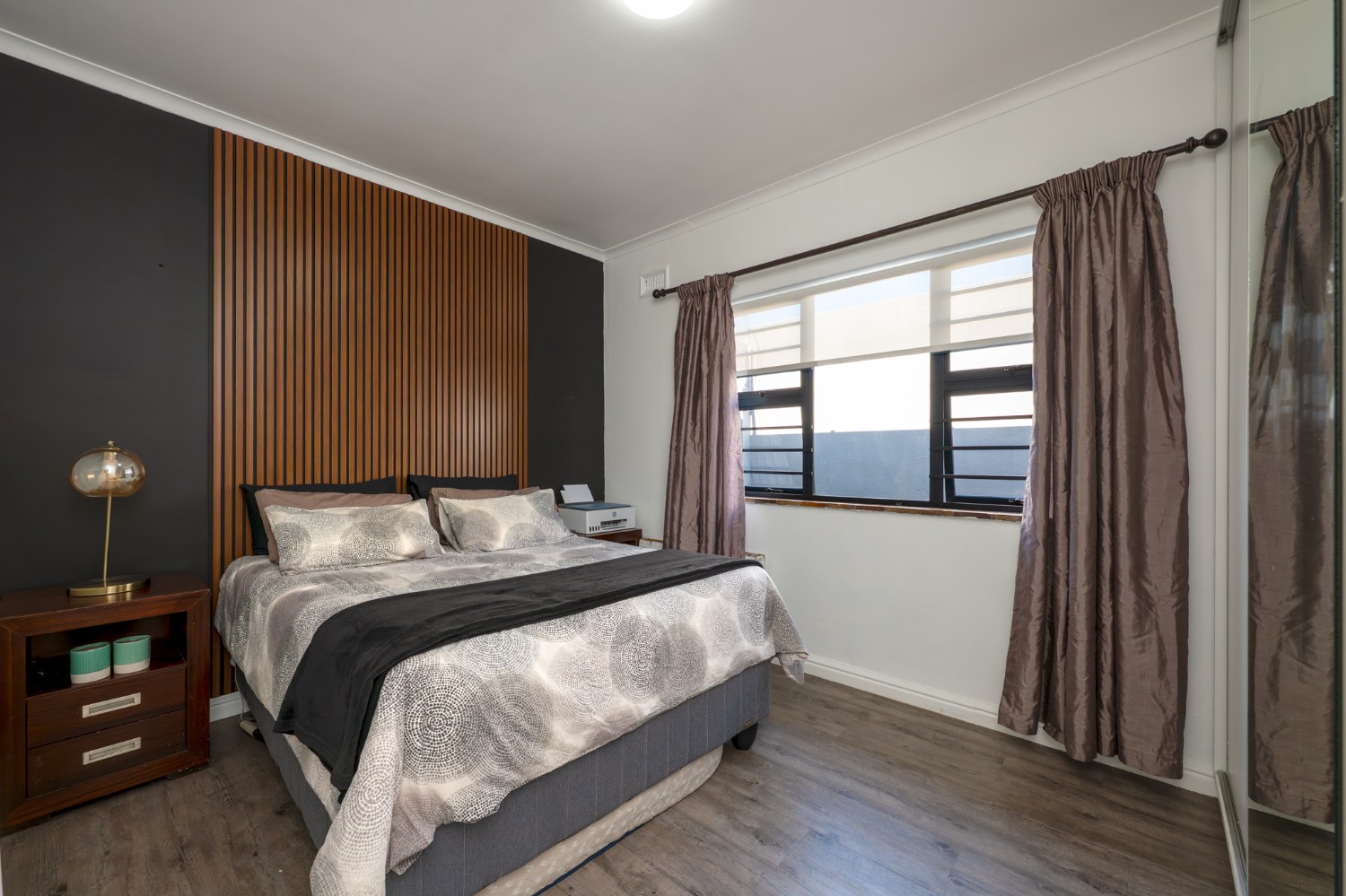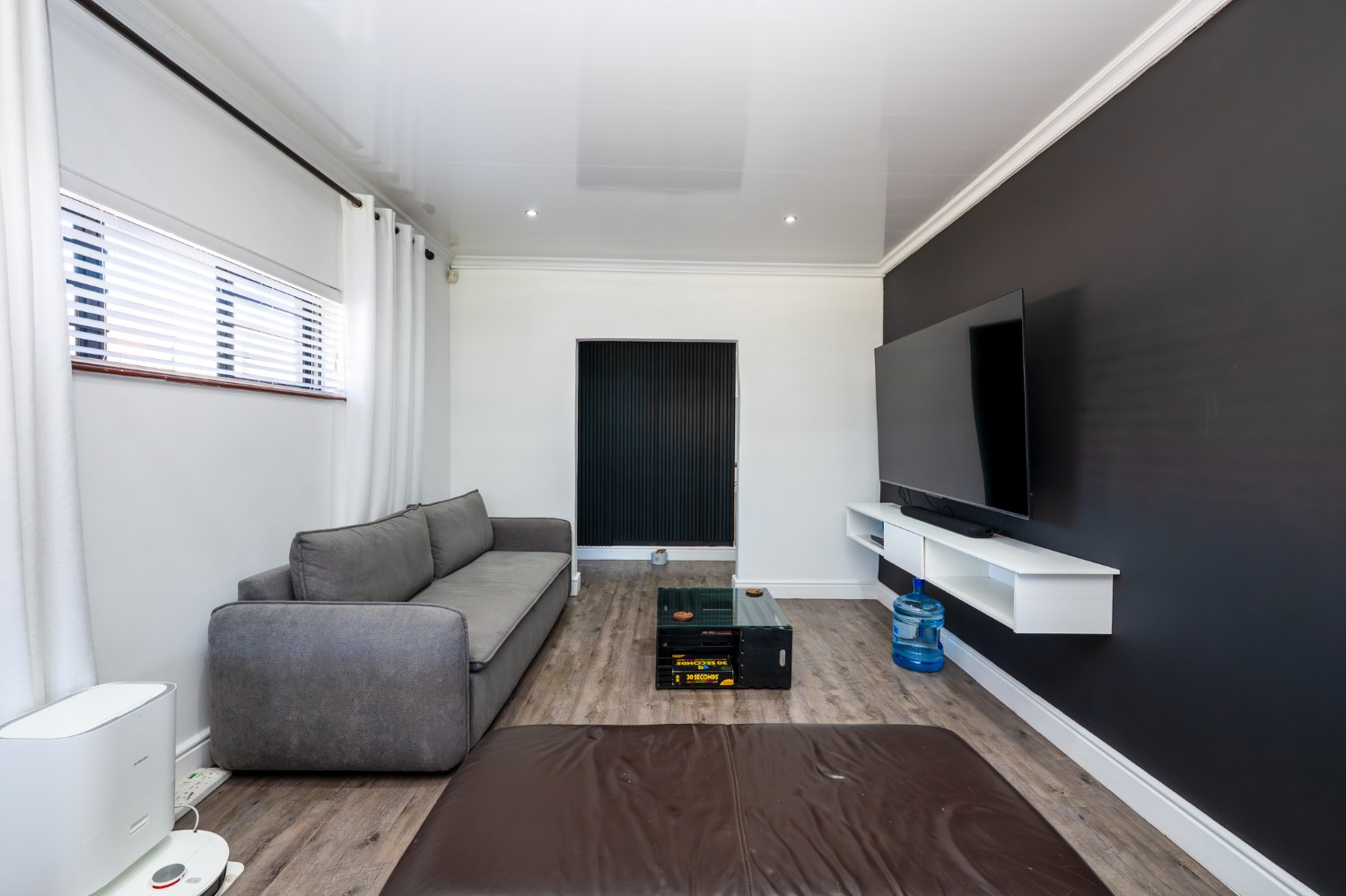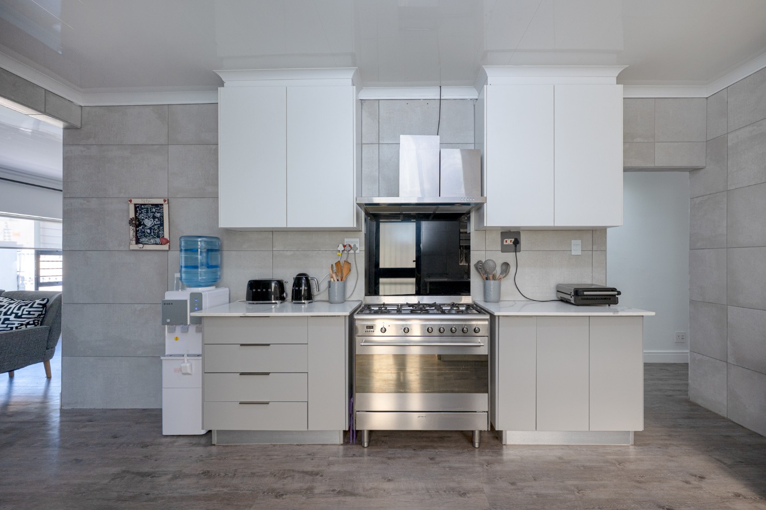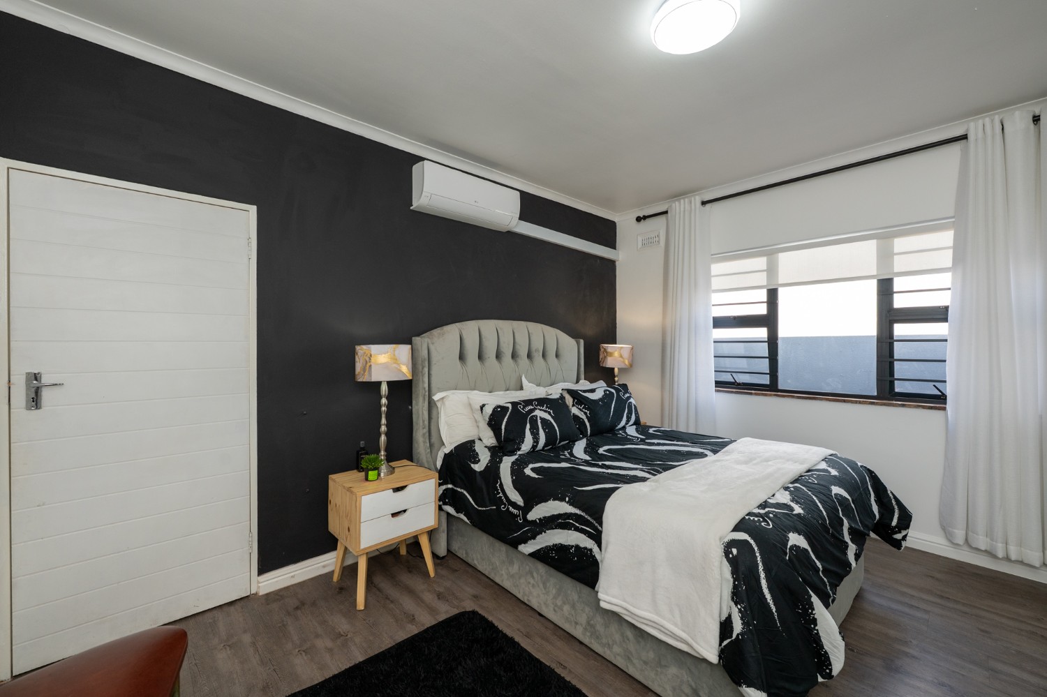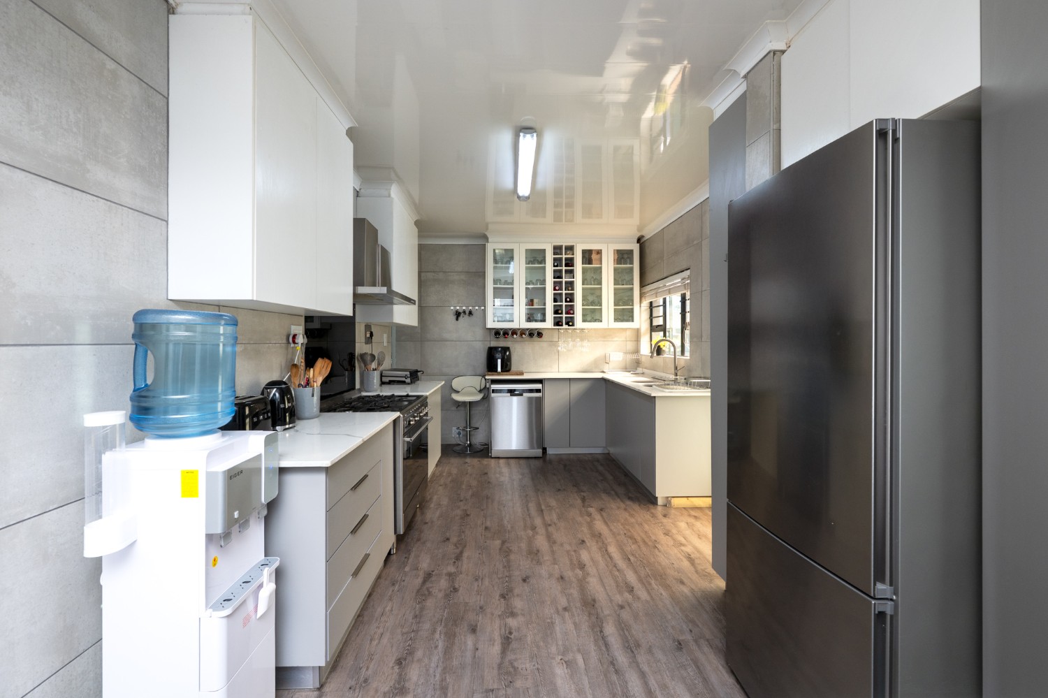 Step inside to a bright and airy open-plan lounge, TV room and dining room, designed for seamless flow and everyday comfort. The living space is fitted with air-conditioning, ensuring a pleasant atmosphere all year round. Large windows allow natural light to fill the home, enhancing the modern finishes throughout. The gorgeous kitchen features light wood cupboards and stone countertops that create a warm and contemporary feel. The kitchen also includes a double sink, a plumbing point for a washing machine or dishwasher, as well as a dedicated space for a fridge.