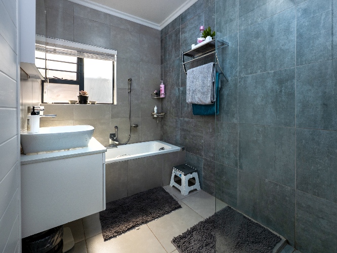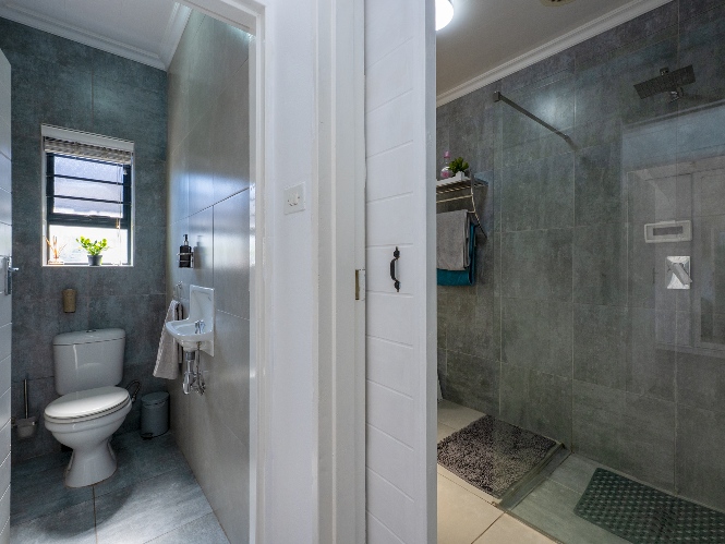 All three bedrooms are well-sized and fitted with sliding door built-in cupboards, offering neat and efficient storage solutions. The contemporary family bathroom is fully equipped with a shower, bathtub, and basin, plus a separate toilet for added convenience. In addition, there is a laundry room.