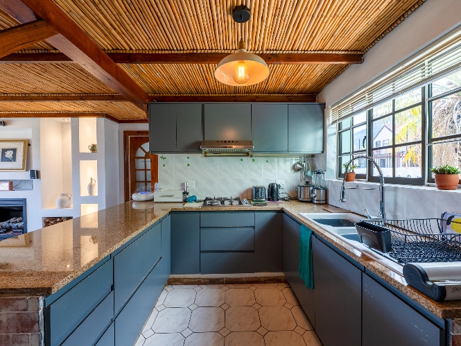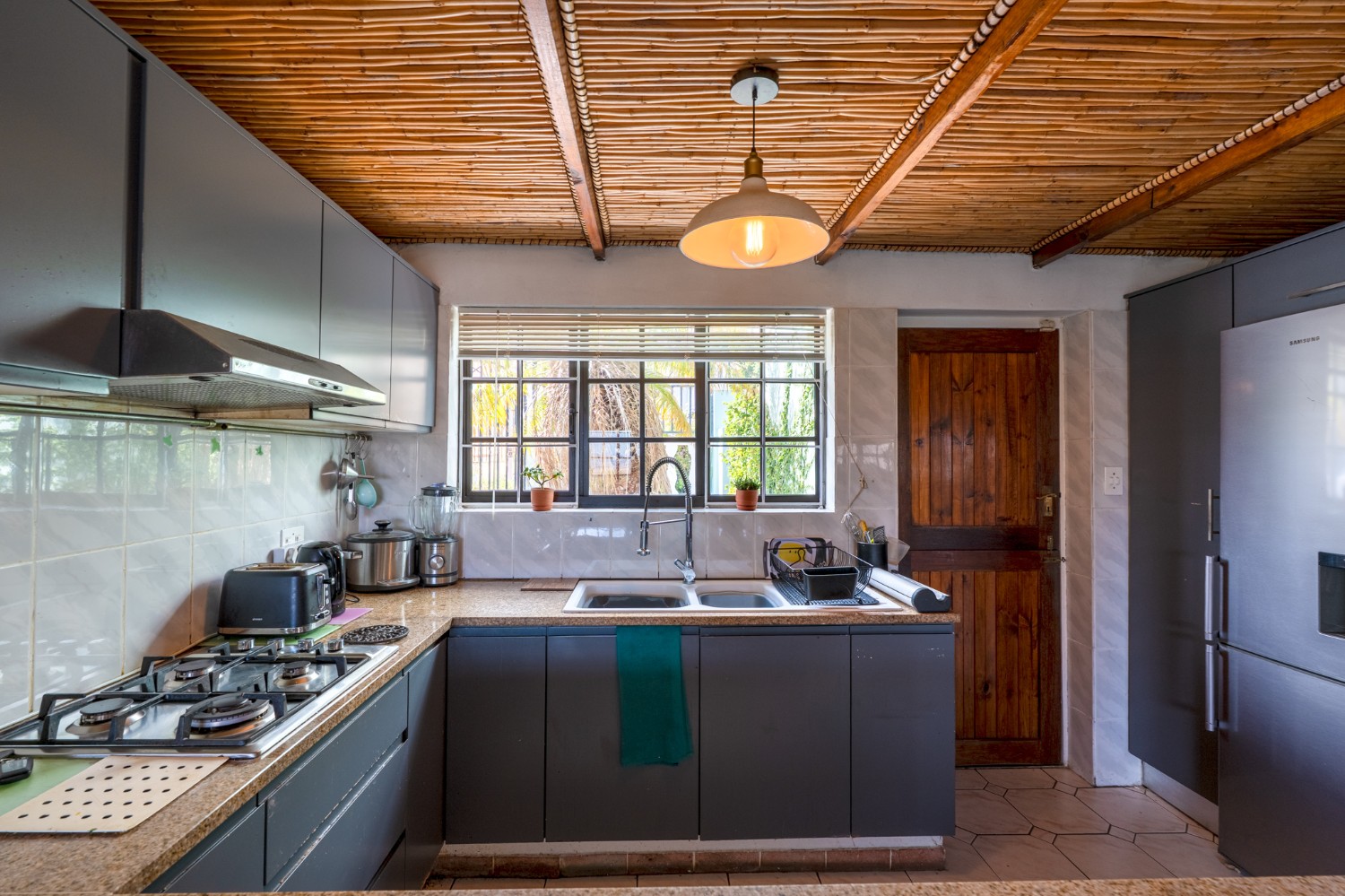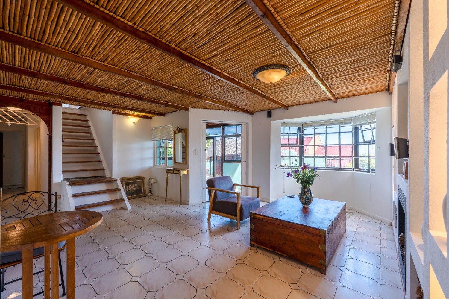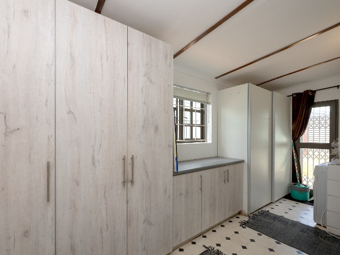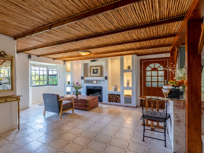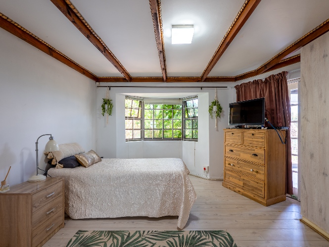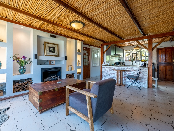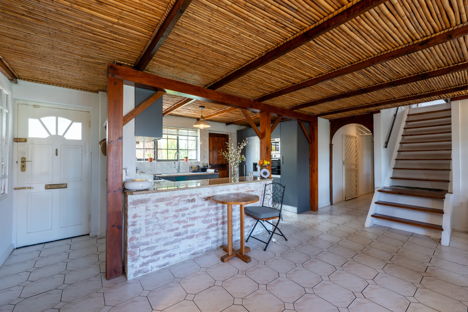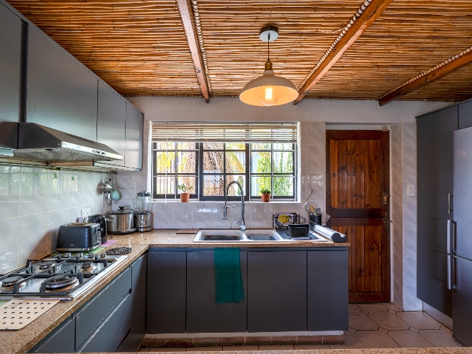 Burglar Bars, Safety GatesThe home showcases a distinctive, character-filled design that blends natural textures with relaxed contemporary living. Exposed timber beams and a beautifully detailed reed-style ceiling create warmth and visual interest, giving the living spaces a unique lodge-inspired feel.