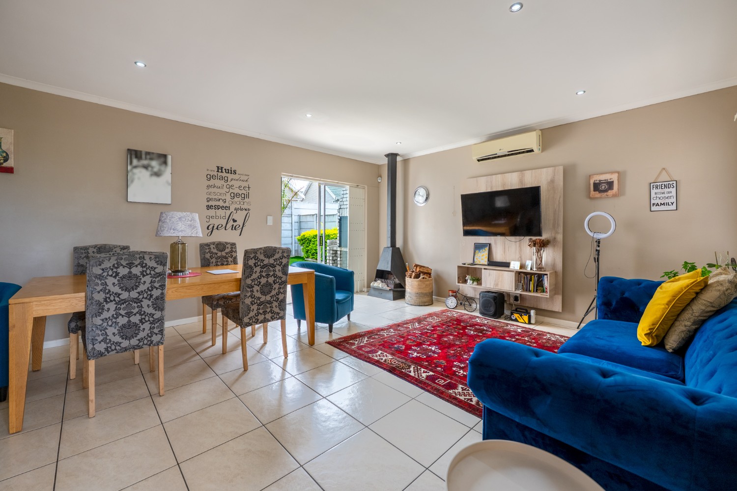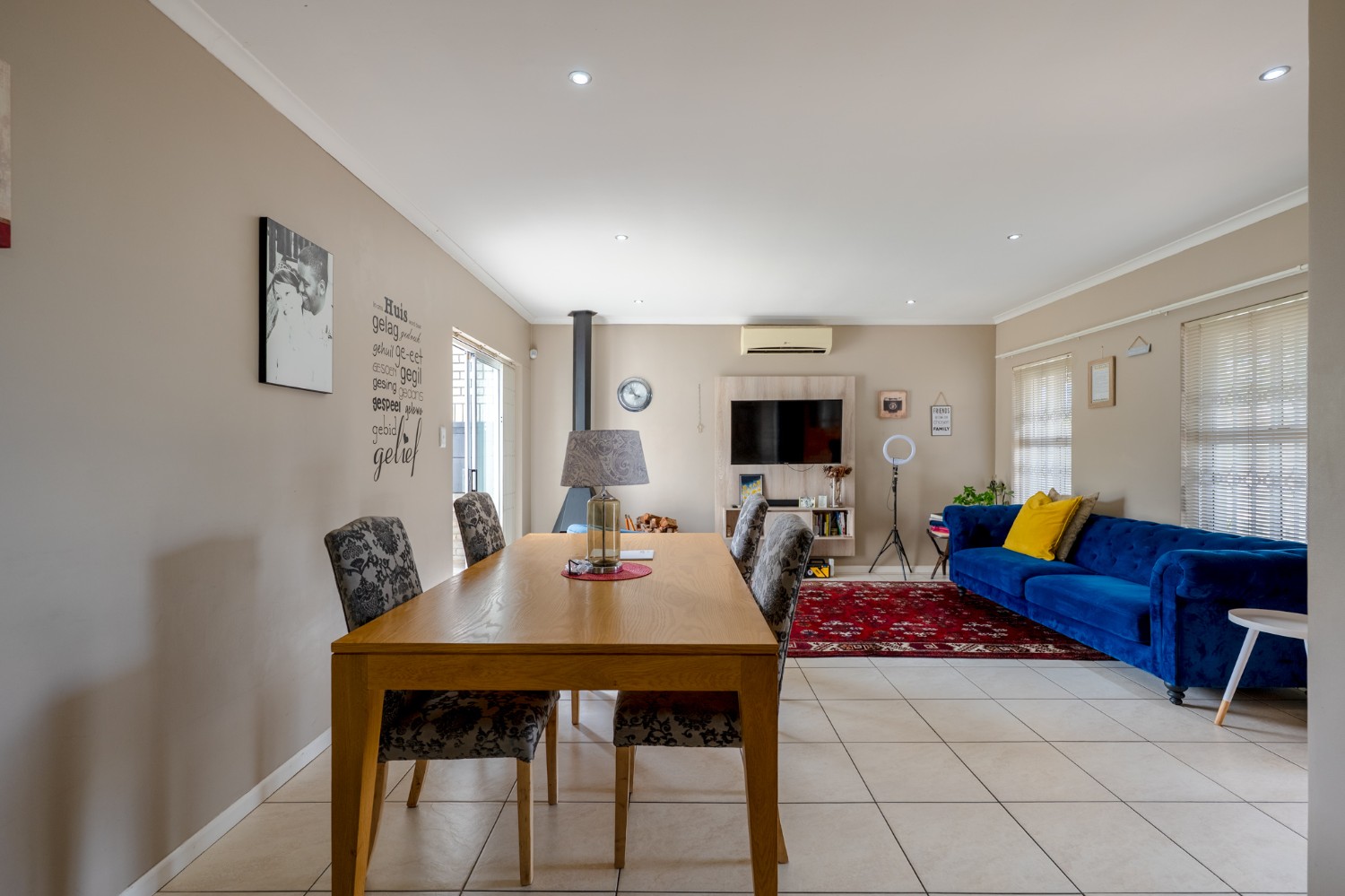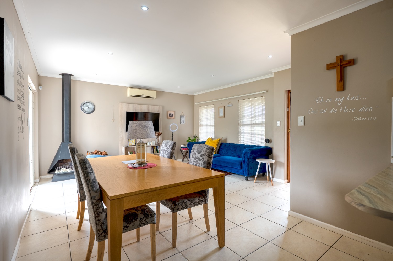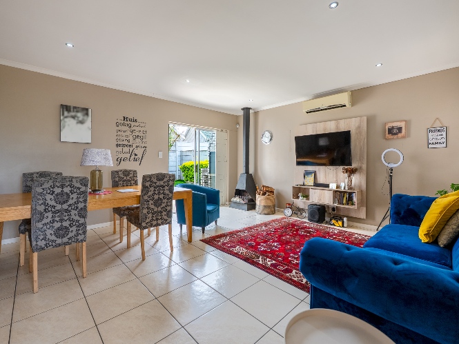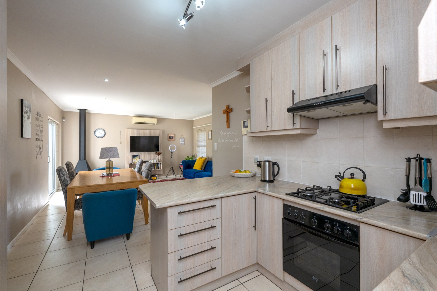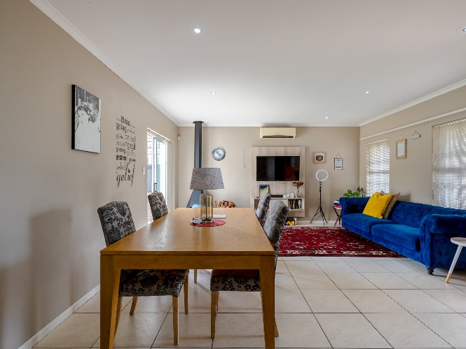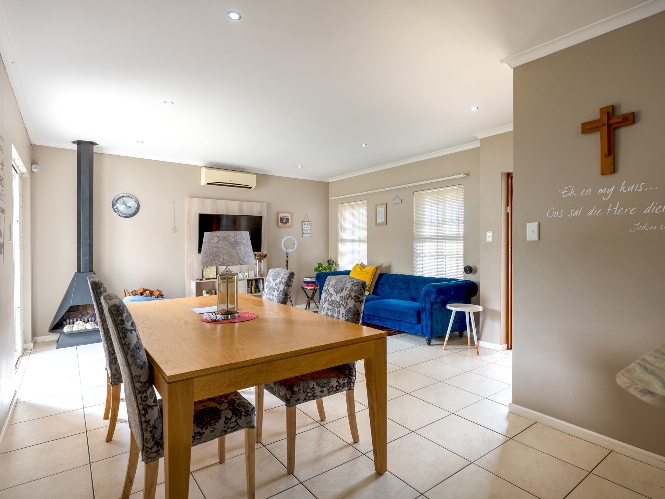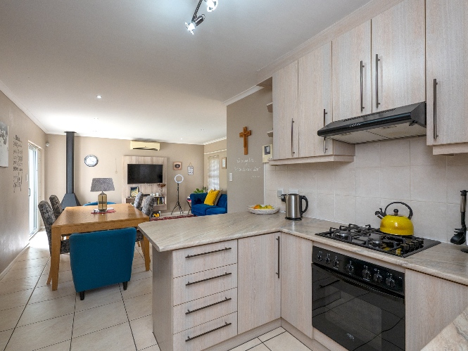 Step inside to a spacious open-plan lounge and dining room, thoughtfully finished with downlights, an indoor fireplace, and an air-conditioning unit. Large sliding doors open to the backyard, creating an easy indoor-outdoor flow with a private outdoor braai area, ideal for entertaining family and friends. The modern kitchen features light-wood cupboards, ample countertop space and an under-counter oven and hob. The separate laundry/scullery has a double sink, plumbing points and additional cupboard space to keep the space neat and functional.