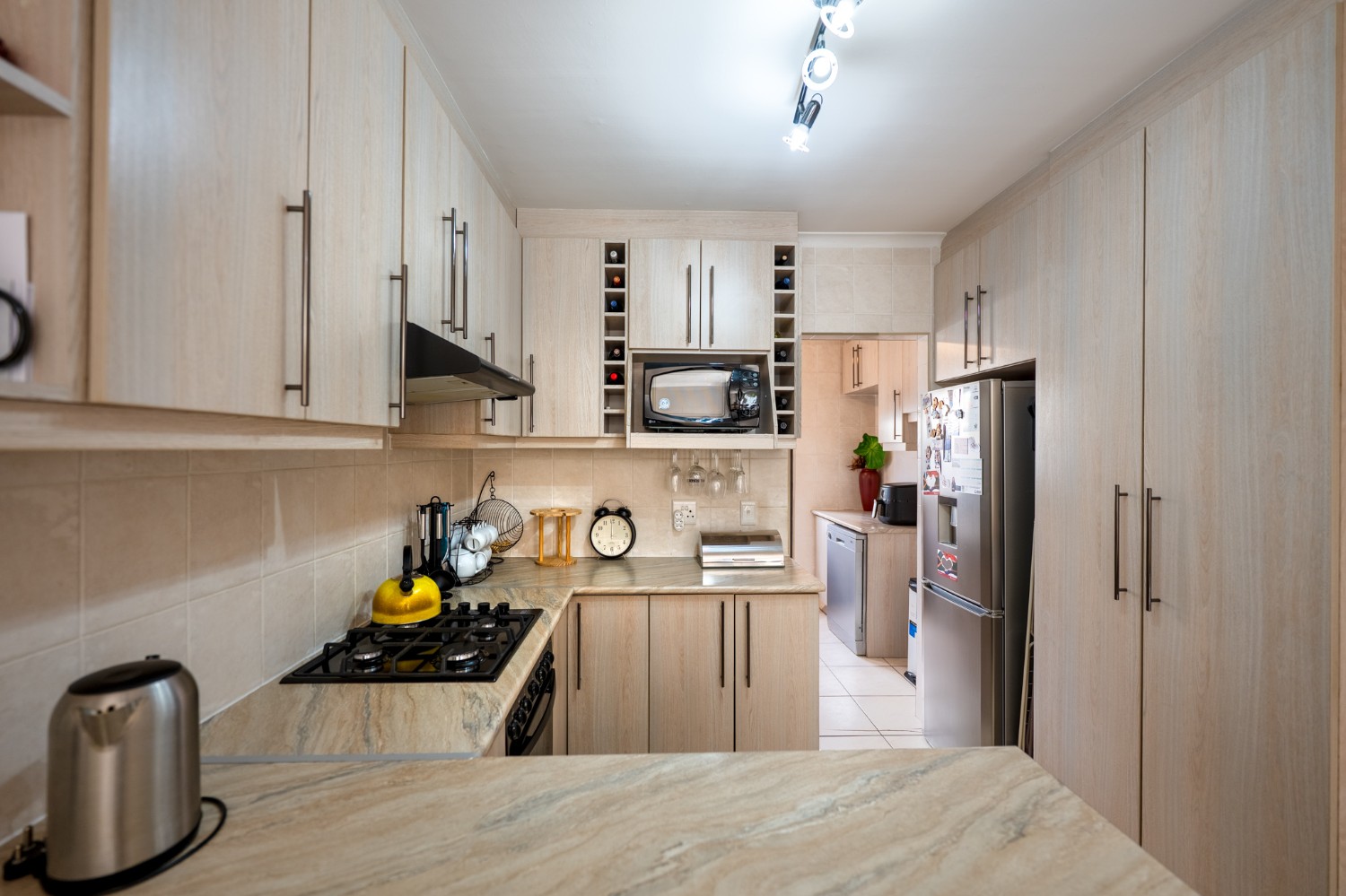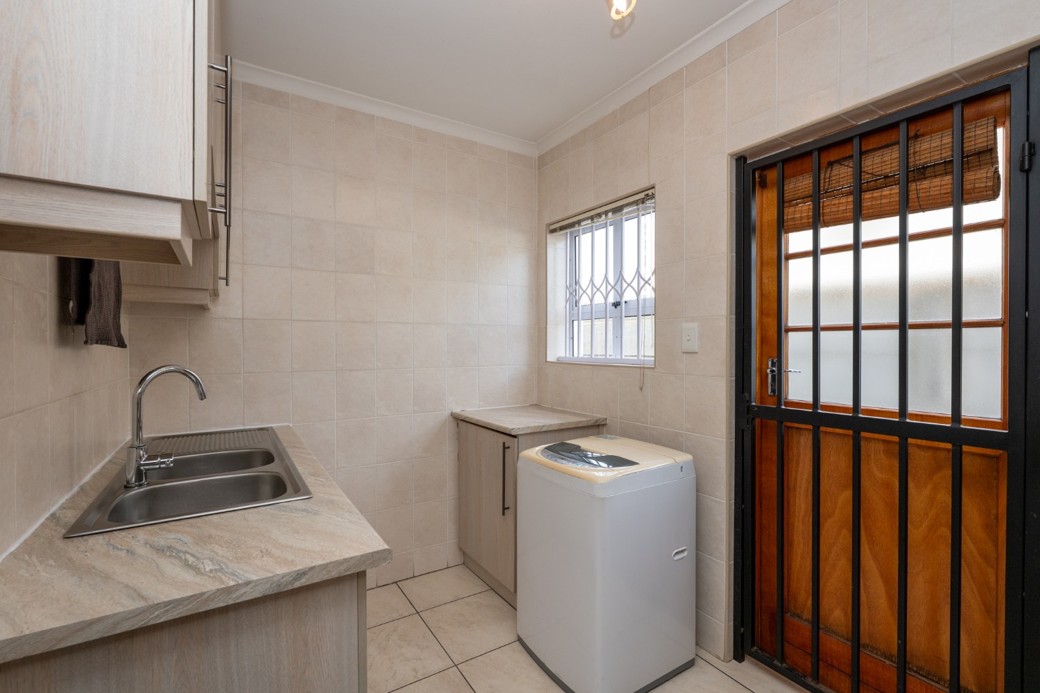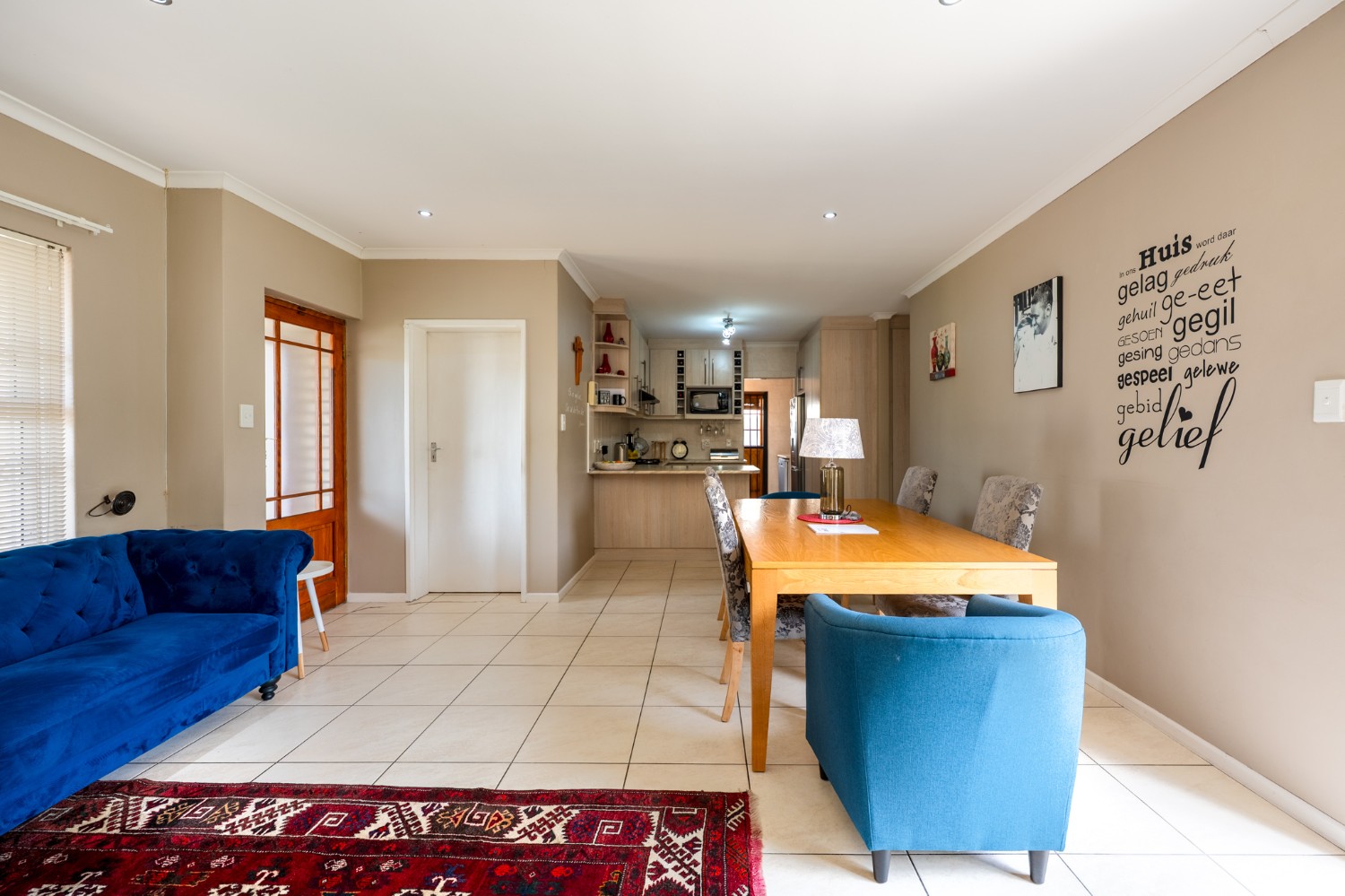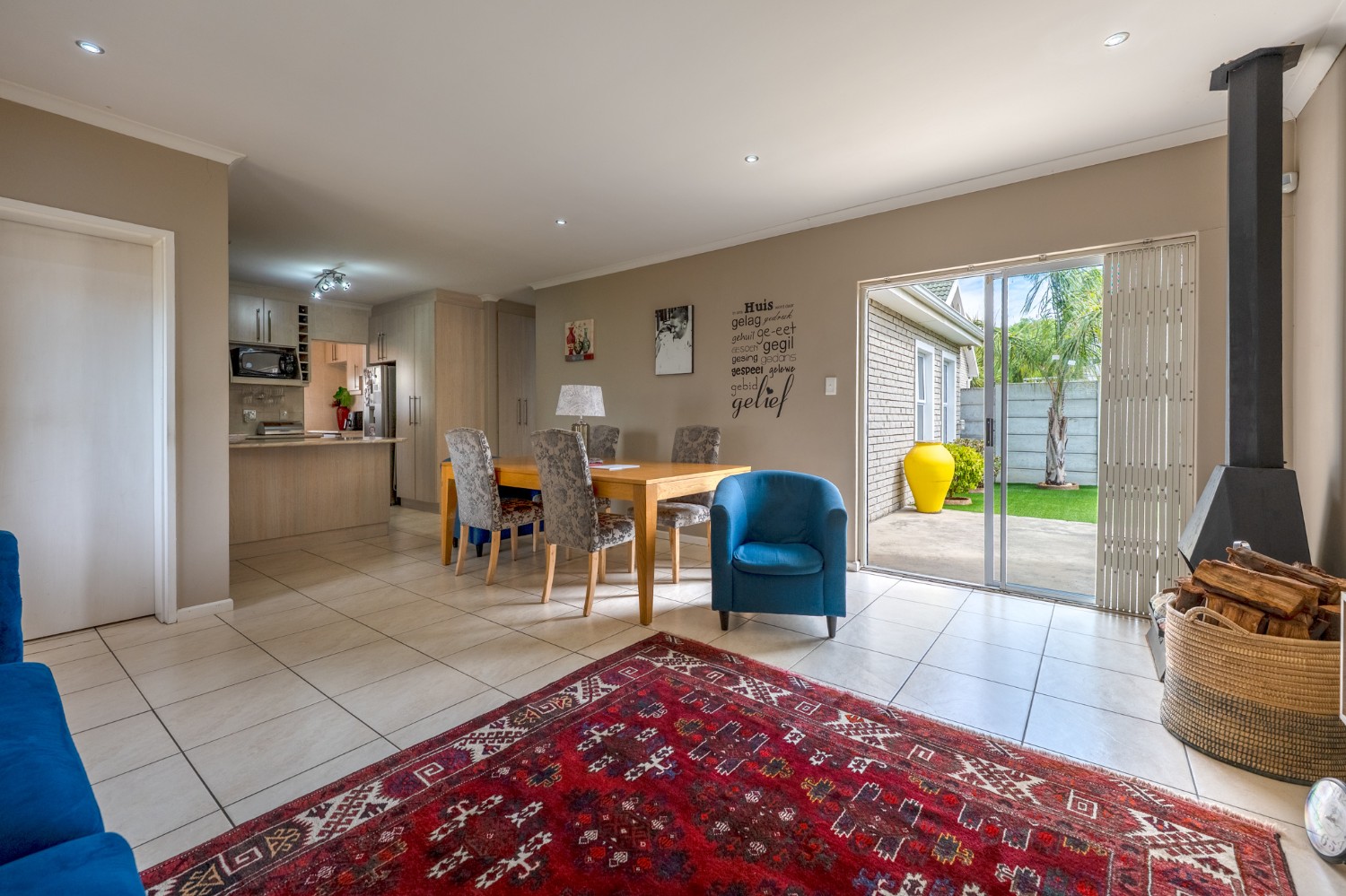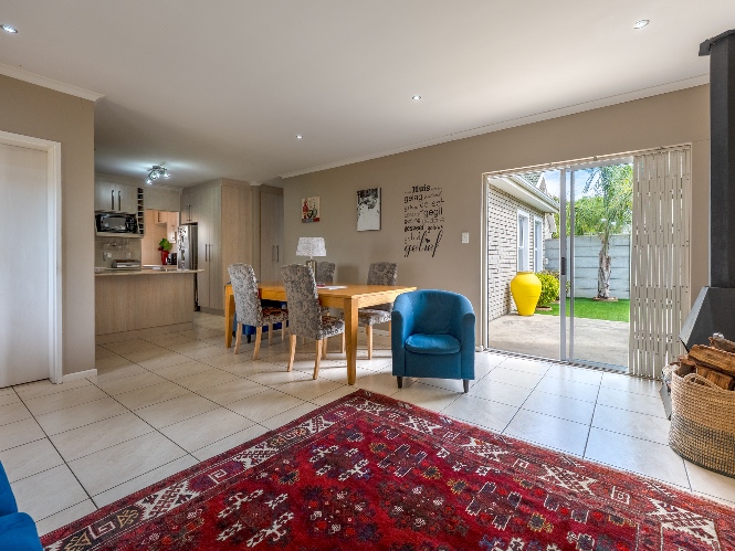 Step inside to a spacious open-plan lounge and dining room, thoughtfully finished with downlights, an indoor fireplace, and an air-conditioning unit. Large sliding doors open to the backyard, creating an easy indoor-outdoor flow with a private outdoor braai area, ideal for entertaining family and friends. The modern kitchen features light-wood cupboards, ample countertop space and an under-counter oven and hob. The separate laundry/scullery has a double sink, plumbing points and additional cupboard space to keep the space neat and functional.
