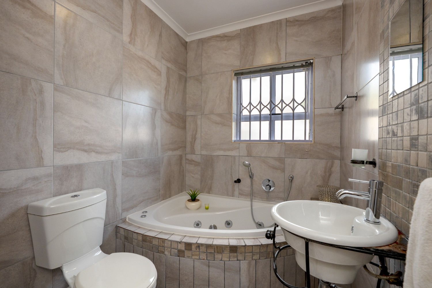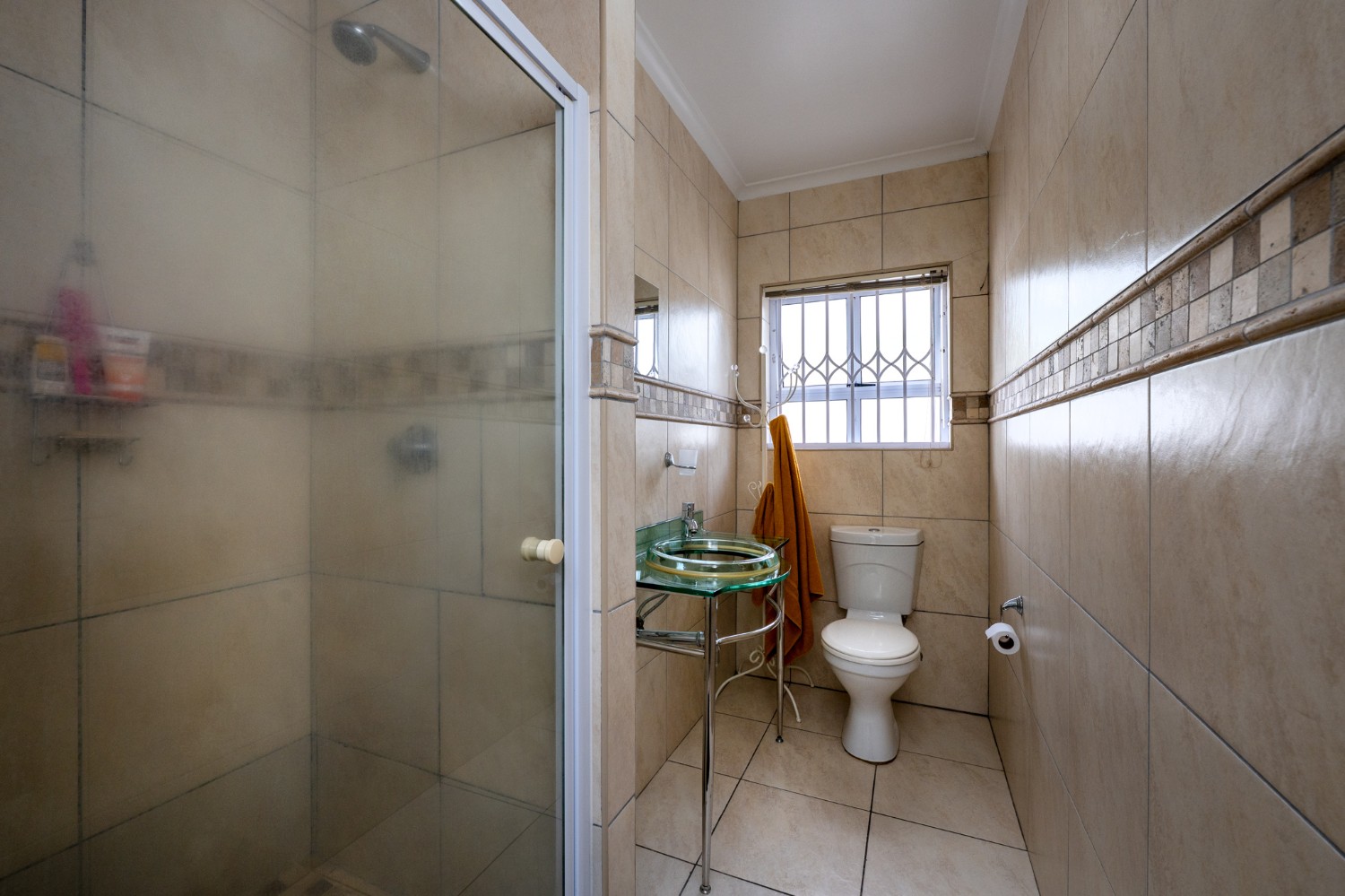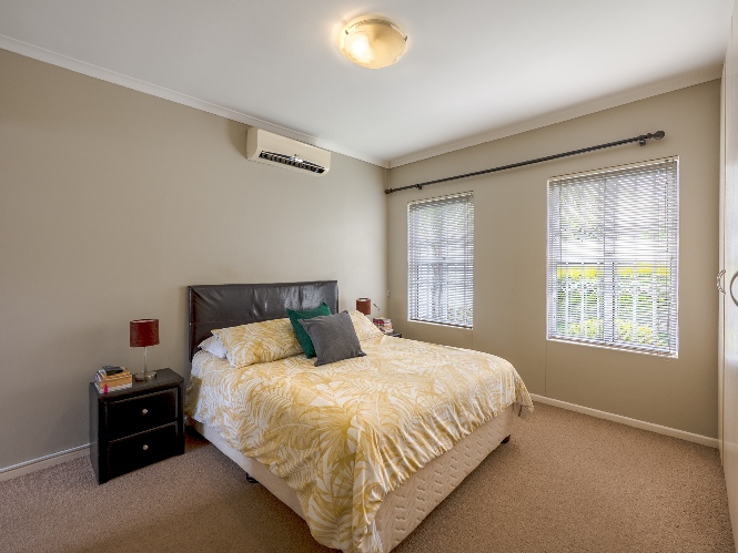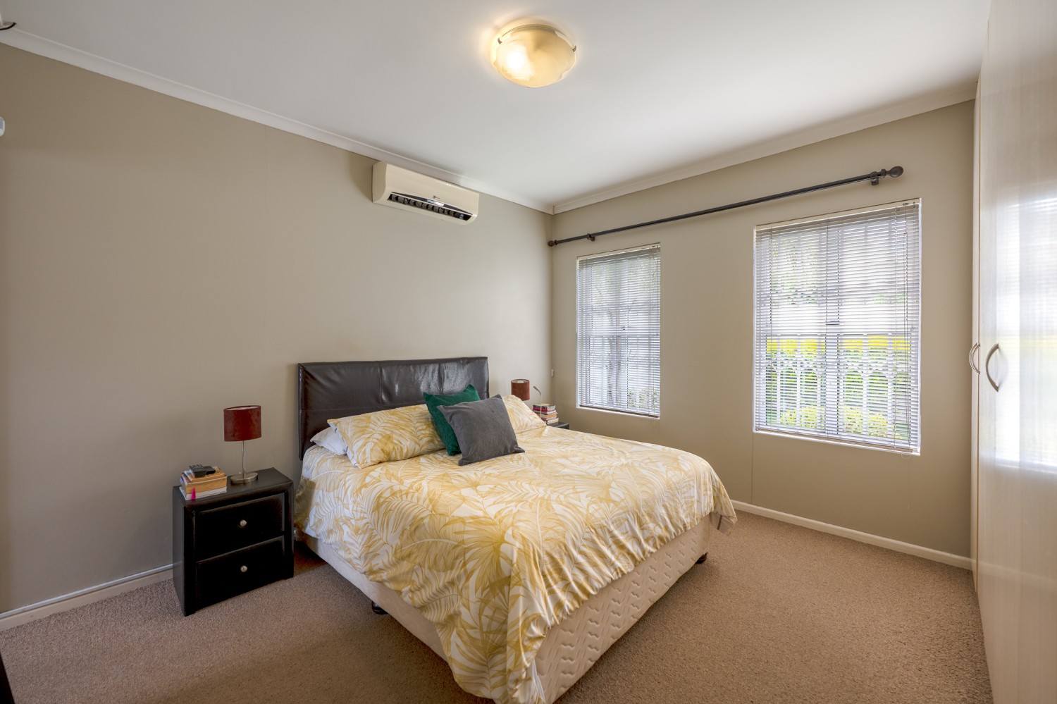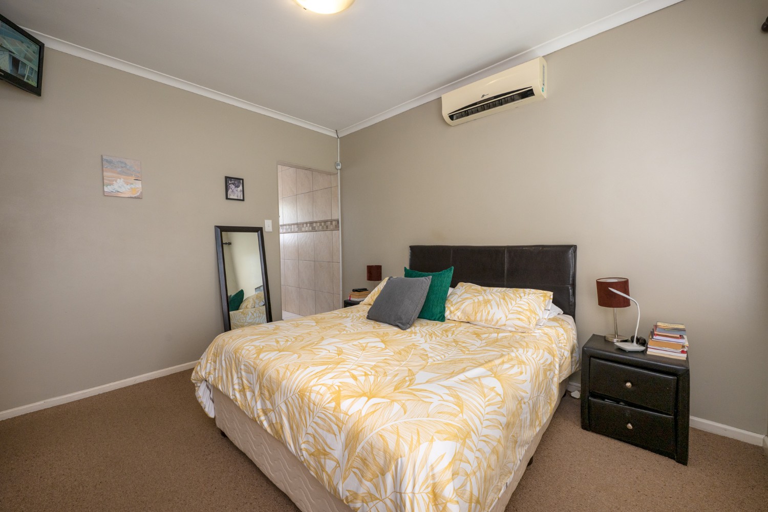 All three bedrooms are well-sized and fitted with built-in cupboards. The main bedroom offers added comfort, with an en-suite bathroom featuring a shower, basin, and toilet, as well as its own air-conditioning unit. The family bathroom is stylishly finished with a corner bathtub, basin, and toilet.
