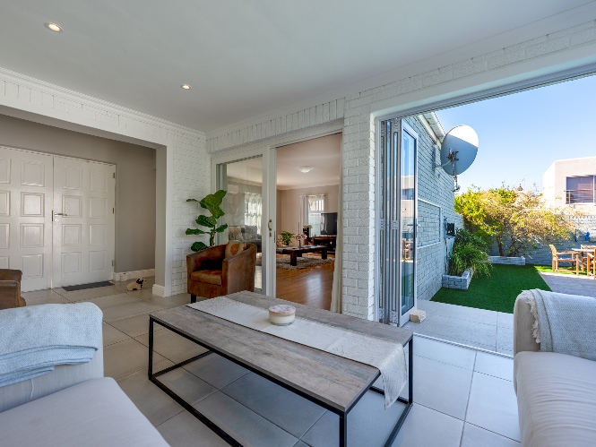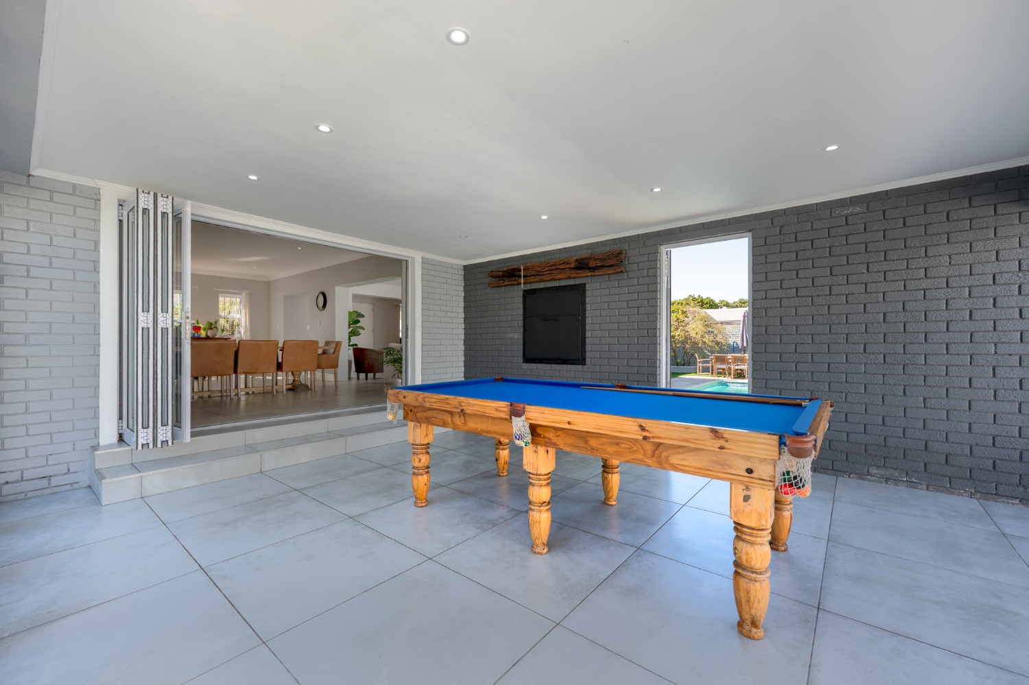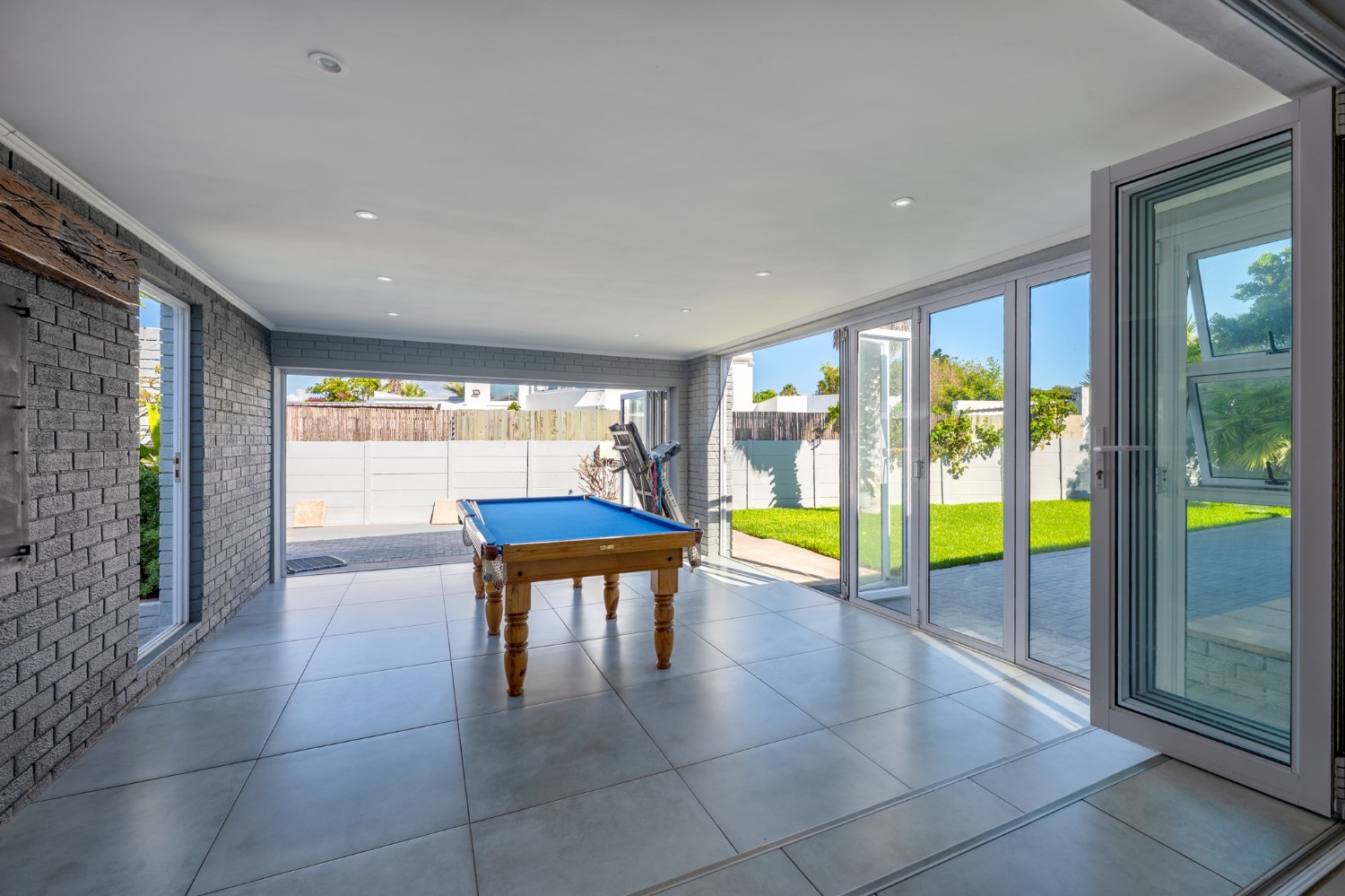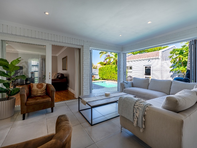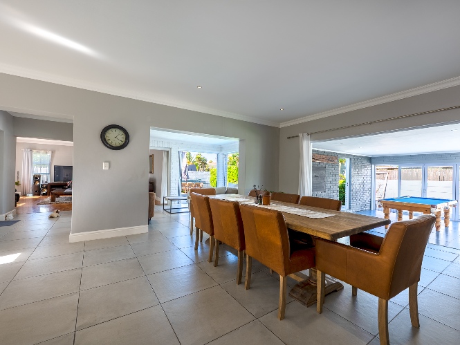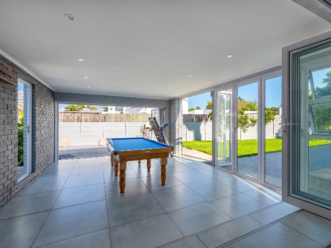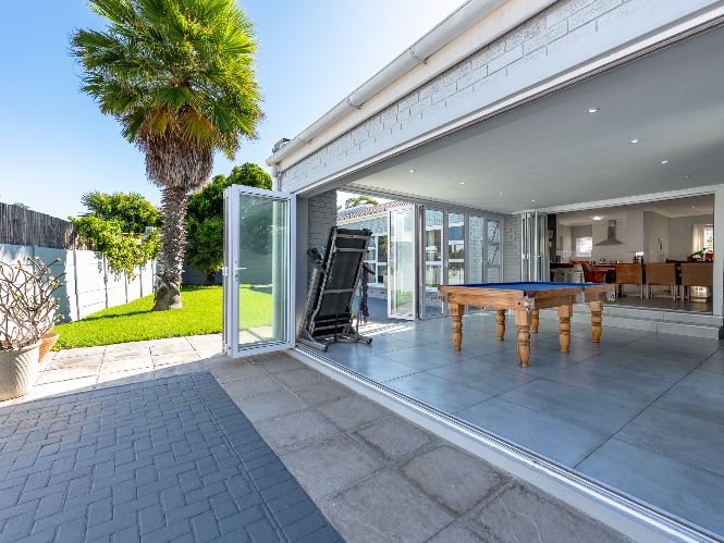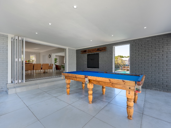 A standout feature is the enclosed entertainment area, complete with a dual-sided built-in braai and stacking doors, creating the perfect connection to the landscaped garden and sparkling pool—a true entertainer’s delight.
