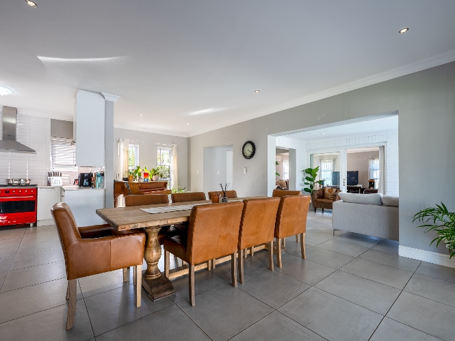 The expansive open-plan living and dining areas flow effortlessly into a contemporary kitchen with a separate scullery, ideal for both everyday living and entertaining on a grand scale.