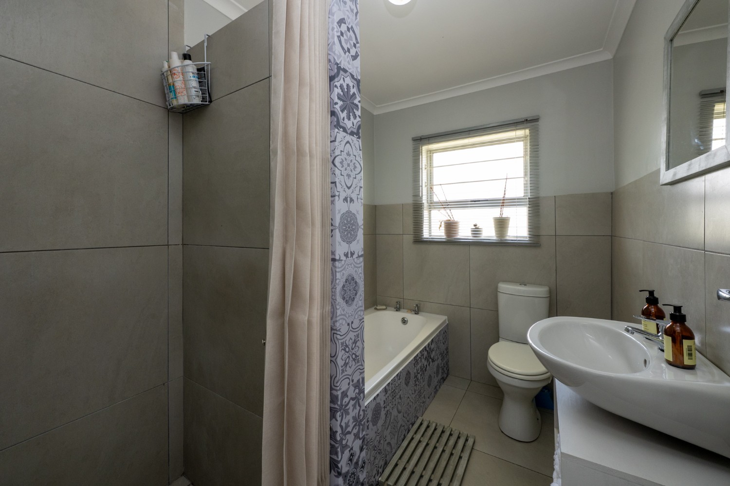 Both bedrooms are well-sized and fitted with built-in cupboards for convenient storage. The main bedroom is enhanced with an air-conditioning unit, ensuring comfort throughout the warmer months. The family bathroom is tastefully tiled and features a shower, bathtub, basin, and toilet.