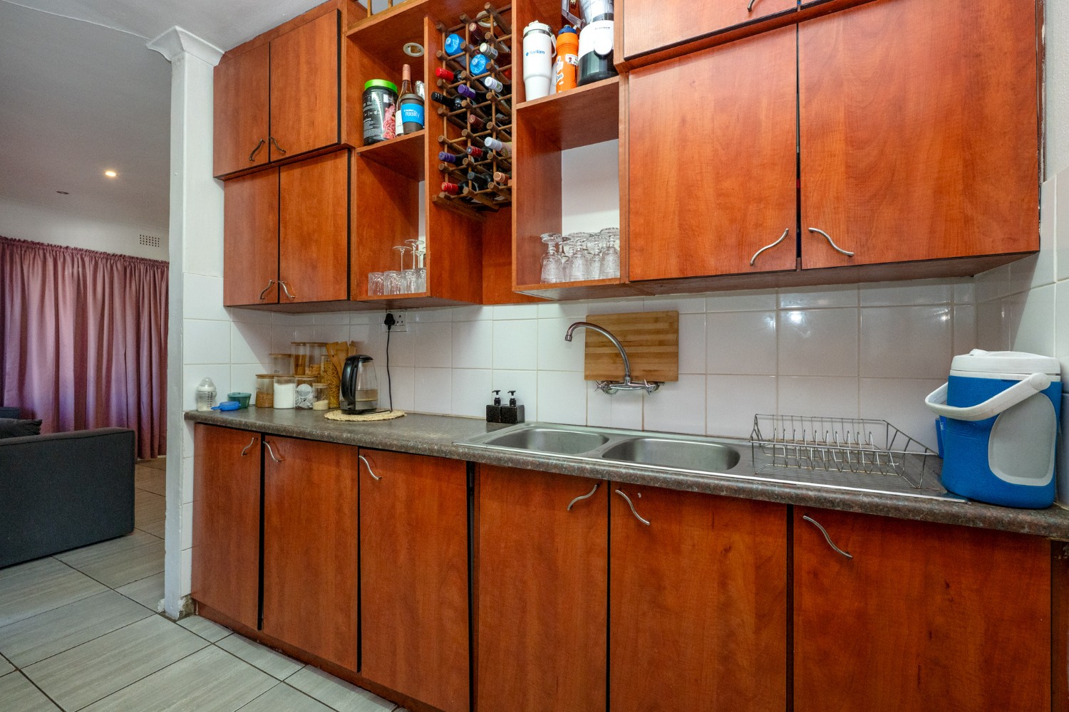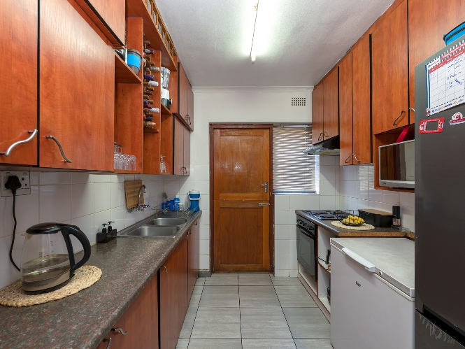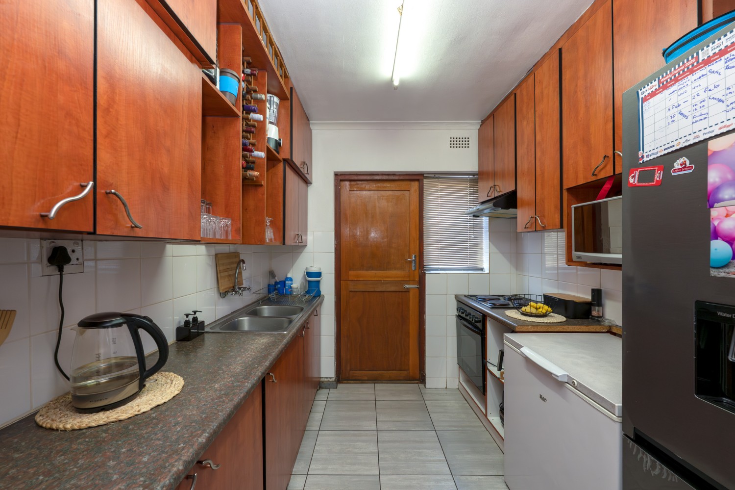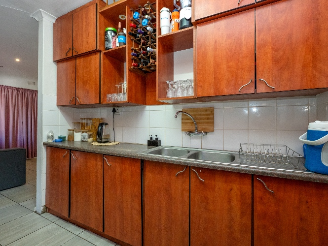 To the right of the lounge is a neat and functional kitchen, fully tiled and fitted with ample cupboard space, a double sink, a 4-plate electric stove with oven, and a dedicated microwave shelf. A stable door leads out to the backyard for added convenience.