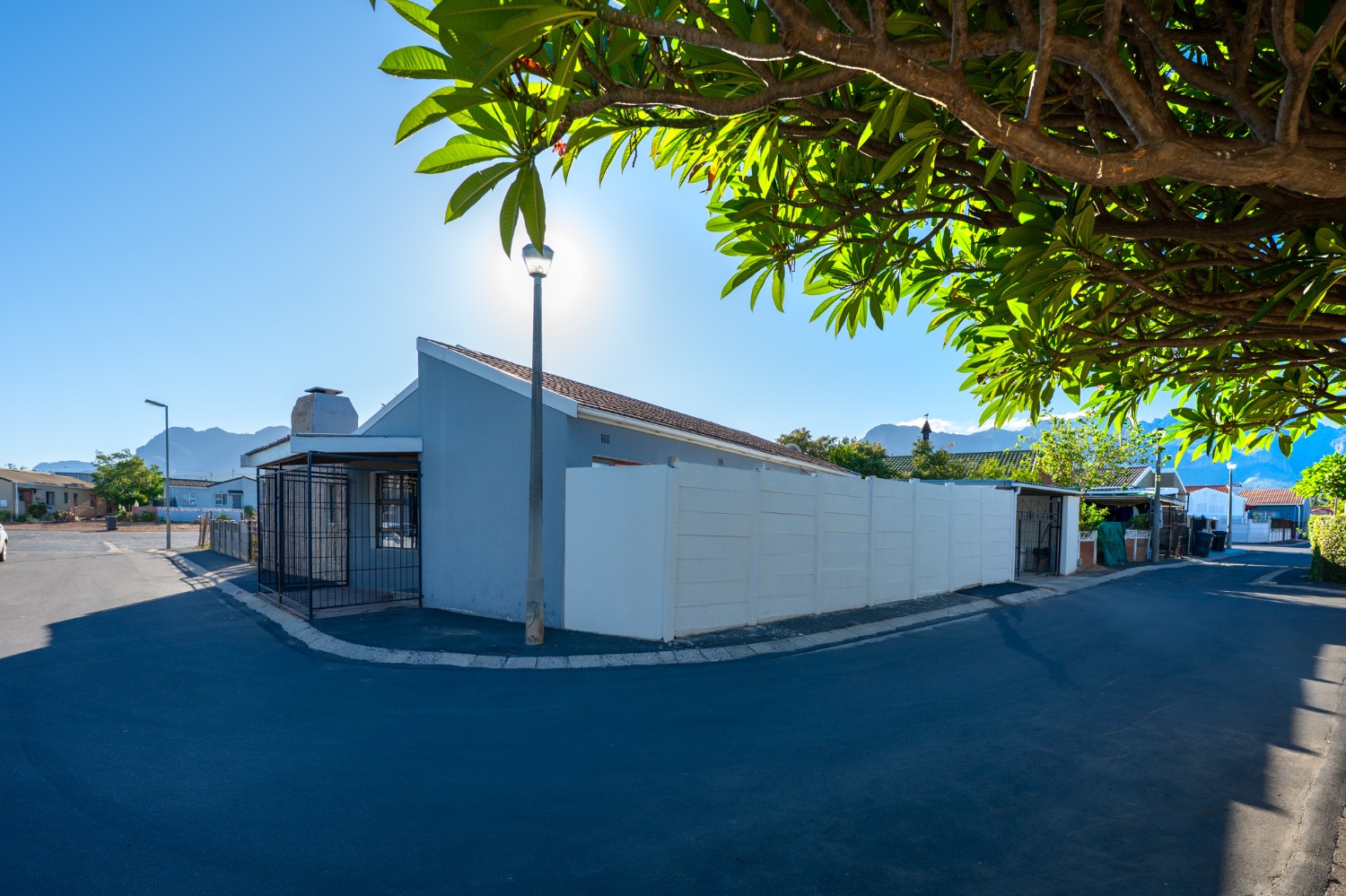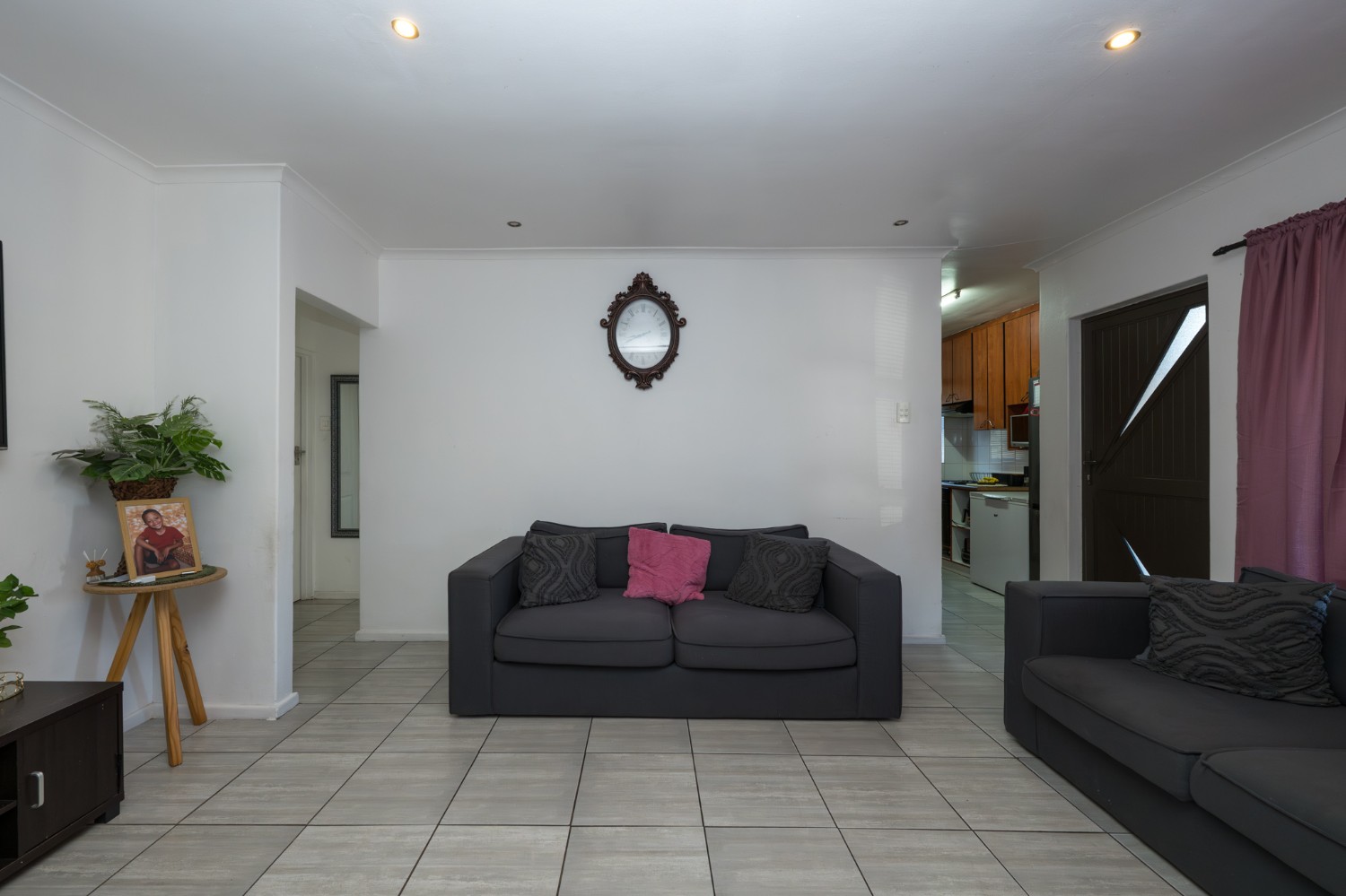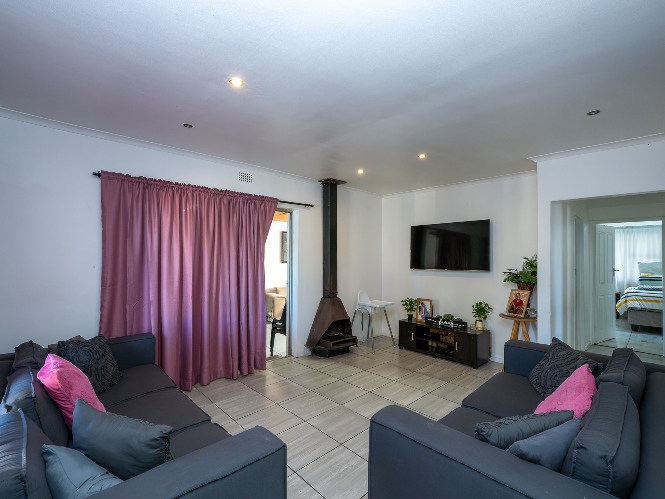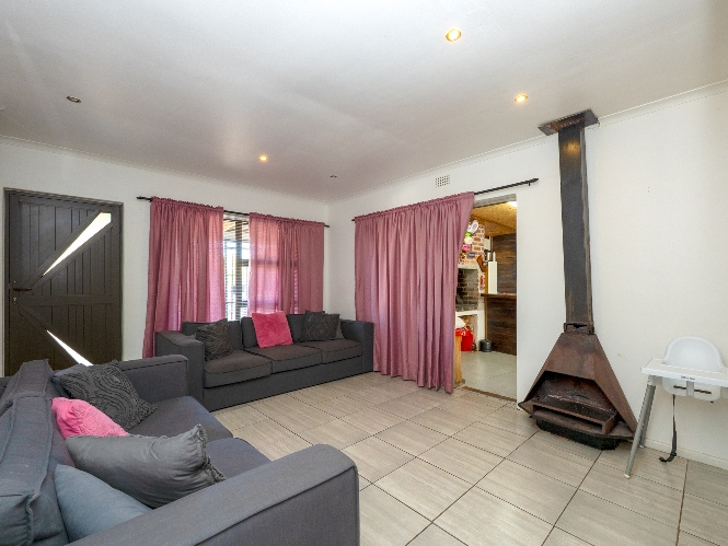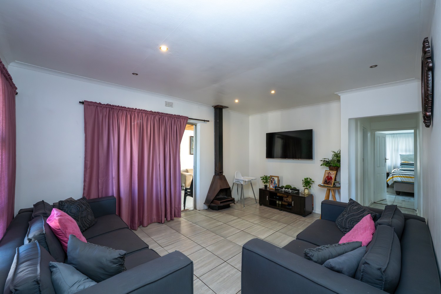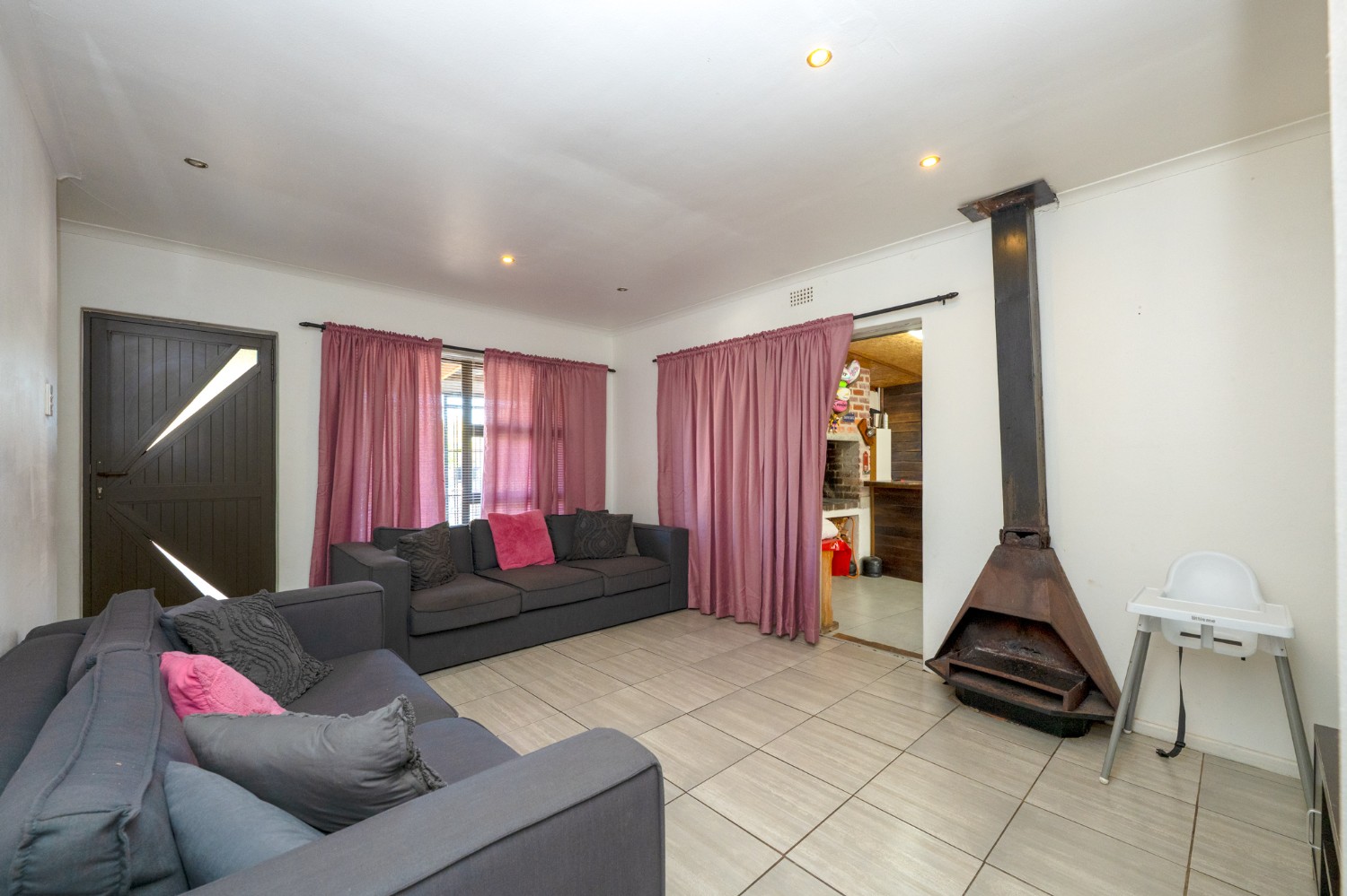 As you enter the property, you are greeted by a gated, secure entrance area before reaching the front door, adding an extra layer of privacy and security. Inside, the home opens into a fully tiled lounge, complete with a cozy indoor fireplace—perfect for relaxed evenings.