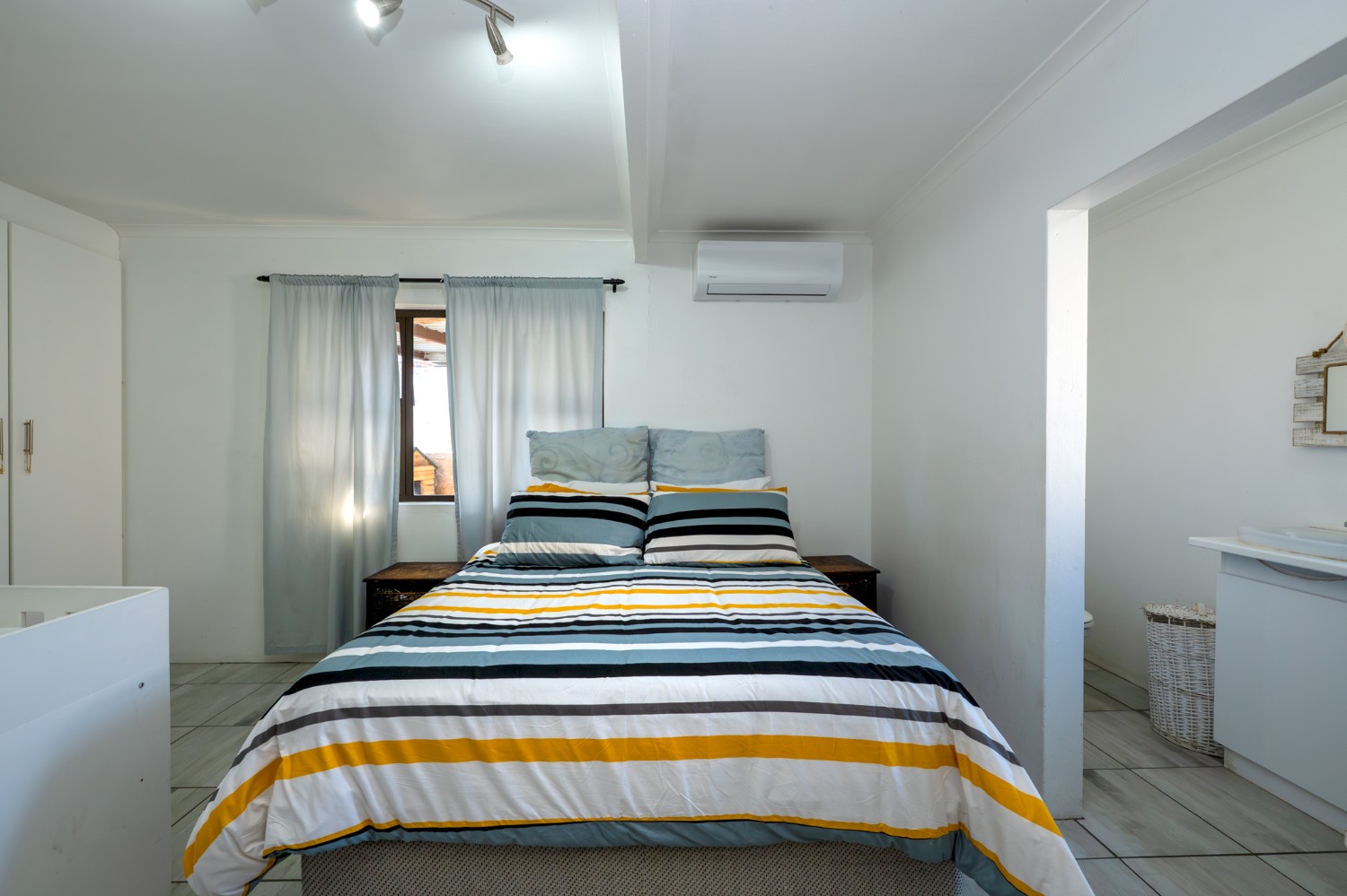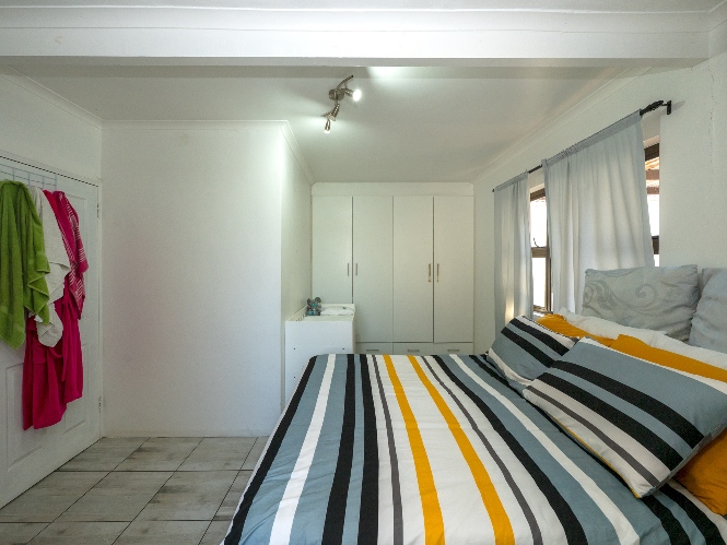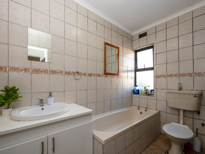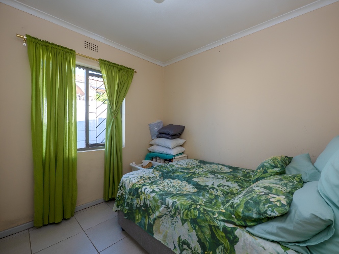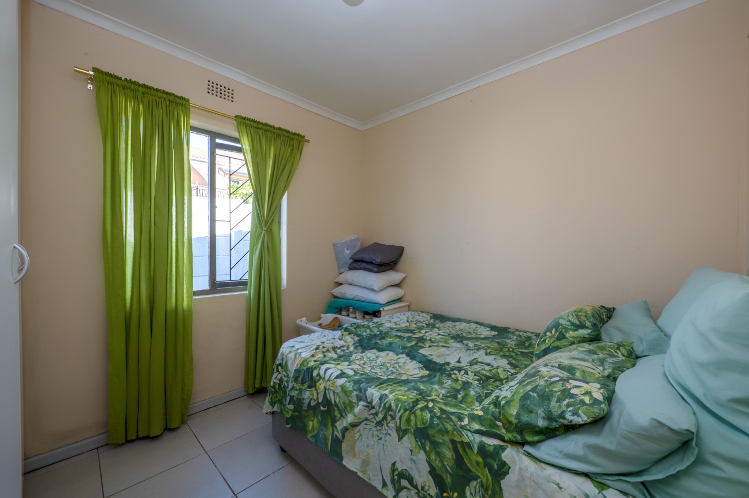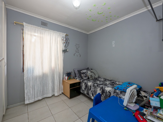 The home offers 3 well-sized, fully tiled bedrooms, all fitted with built-in cupboards. The first 2 bedrooms feature wooden window frames with burglar bars, while the main bedroom, located at the end of the passage, is generously sized with space for a queen bed and additional furnishings. It also includes an air conditioner and a private en-suite bathroom with a walk-in shower, basin, and toilet.