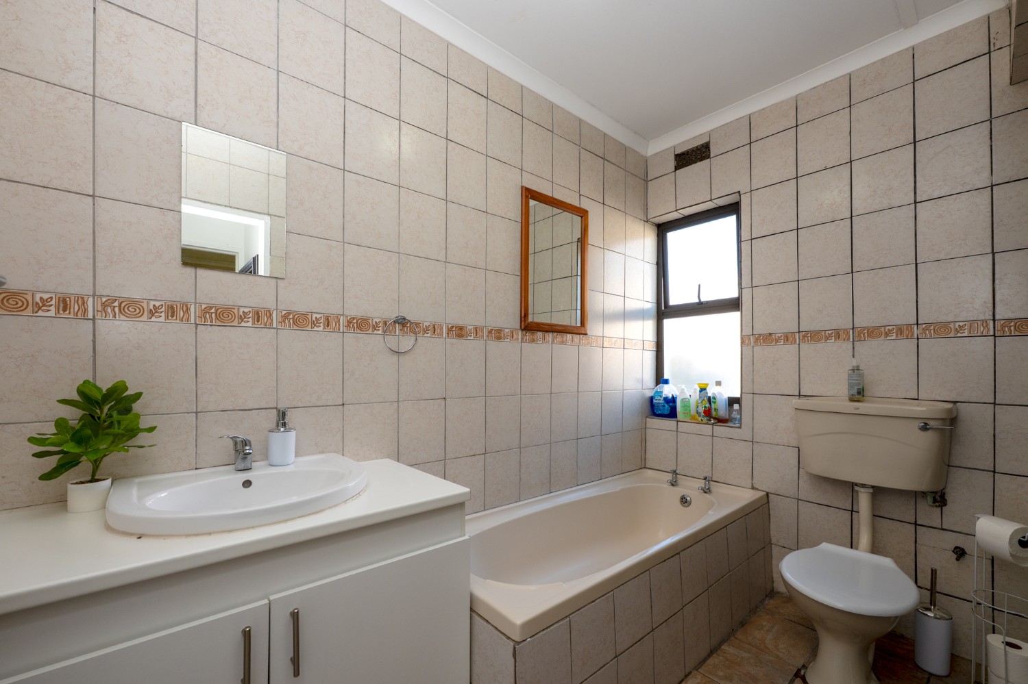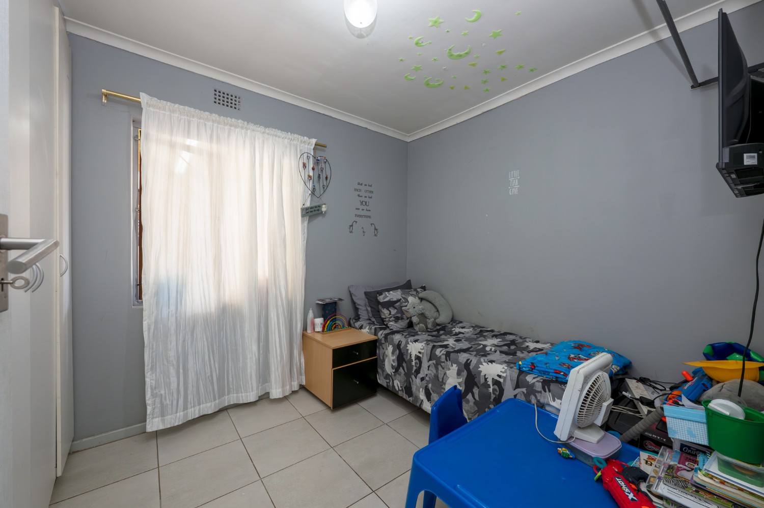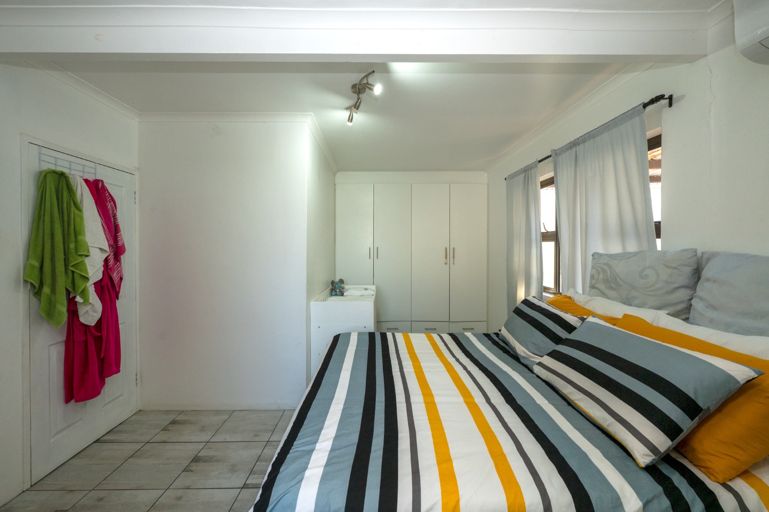 The home offers 3 well-sized, fully tiled bedrooms, all fitted with built-in cupboards. The first 2 bedrooms feature wooden window frames with burglar bars, while the main bedroom, located at the end of the passage, is generously sized with space for a queen bed and additional furnishings. It also includes an air conditioner and a private en-suite bathroom with a walk-in shower, basin, and toilet.
