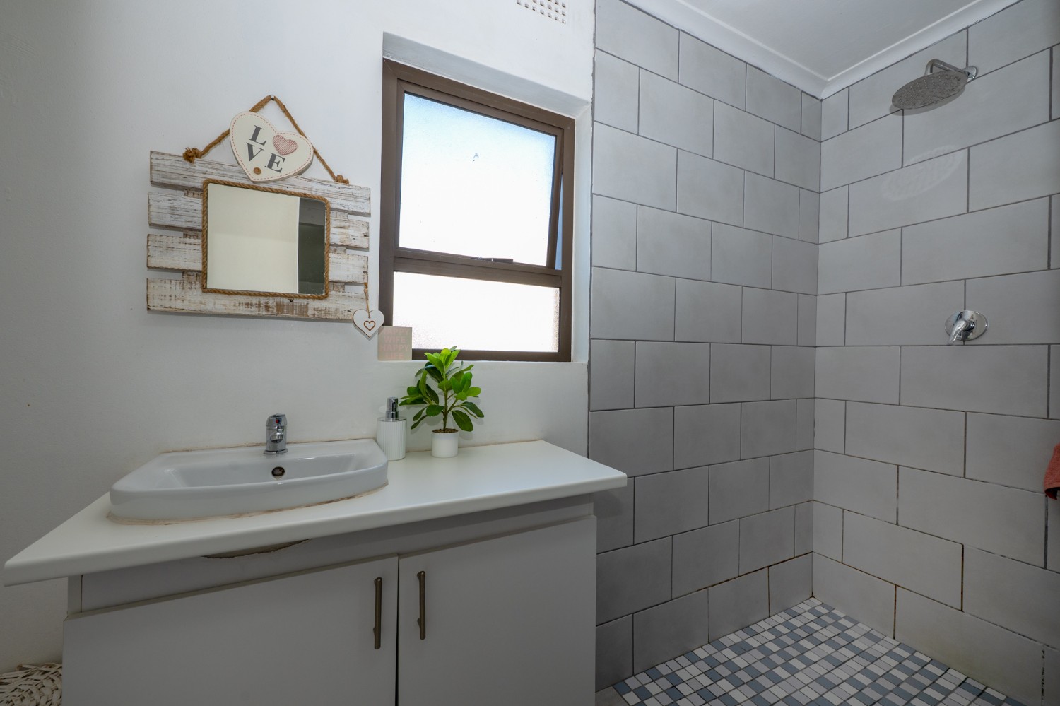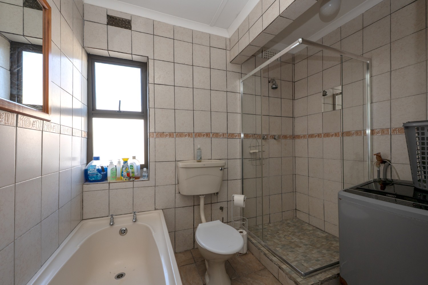 The family bathroom is fully tiled and well-appointed, offering a bath, shower, basin with cabinet, and toilet, along with a plumbing point for a washing machine.