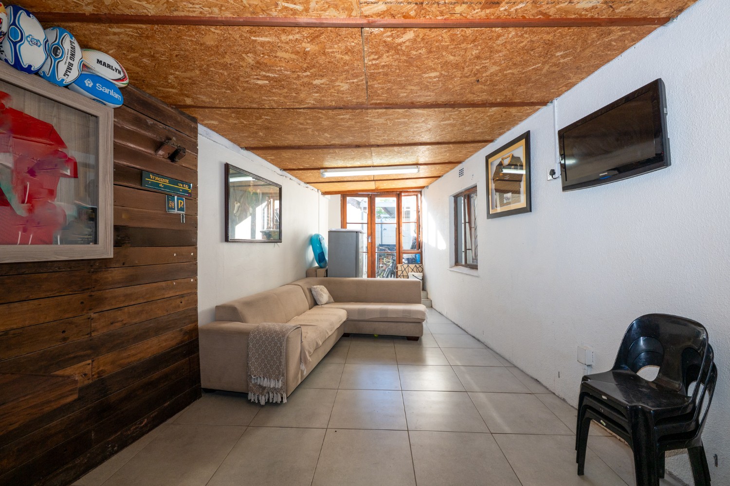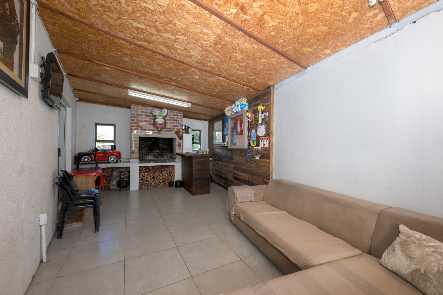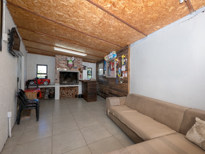 Flowing from the lounge through sliding doors, you’ll find a spacious indoor braai and entertainment room, ideal for hosting guests or creating a versatile family space. This area features a built-in braai and has ample room for a lounge suite and TV, making it the perfect man cave or second living area.