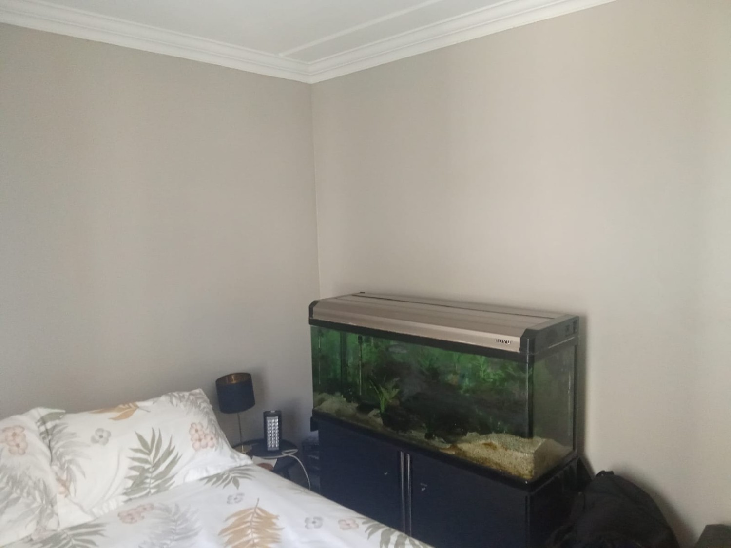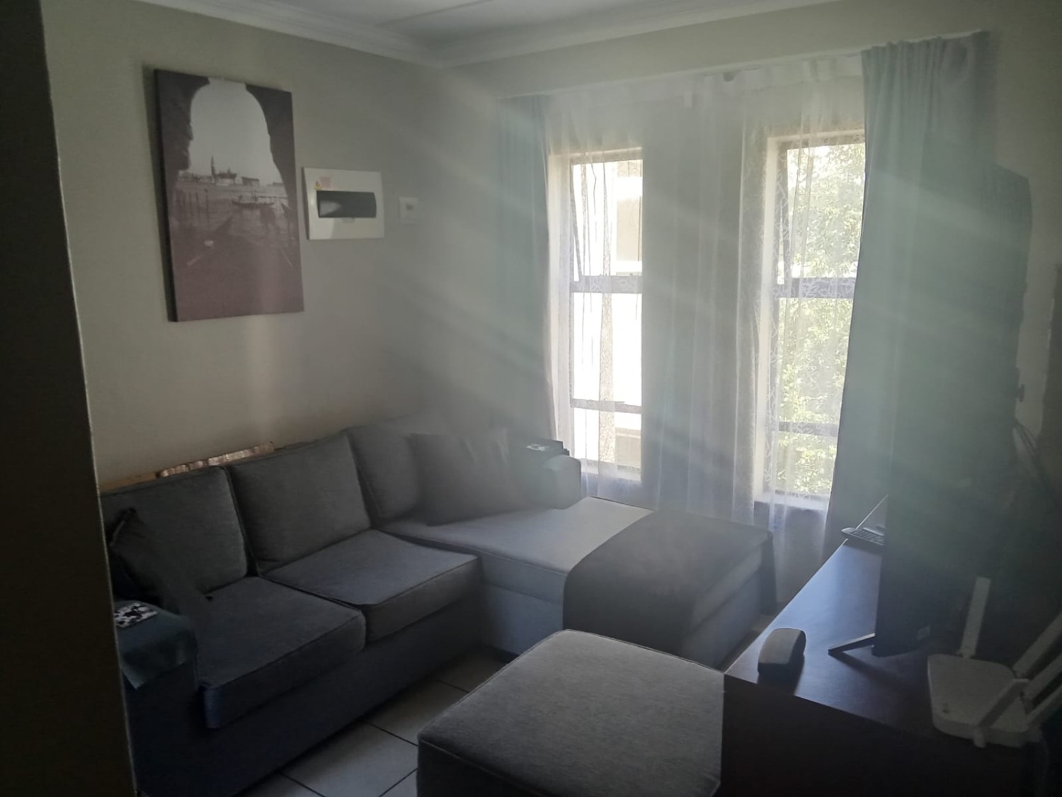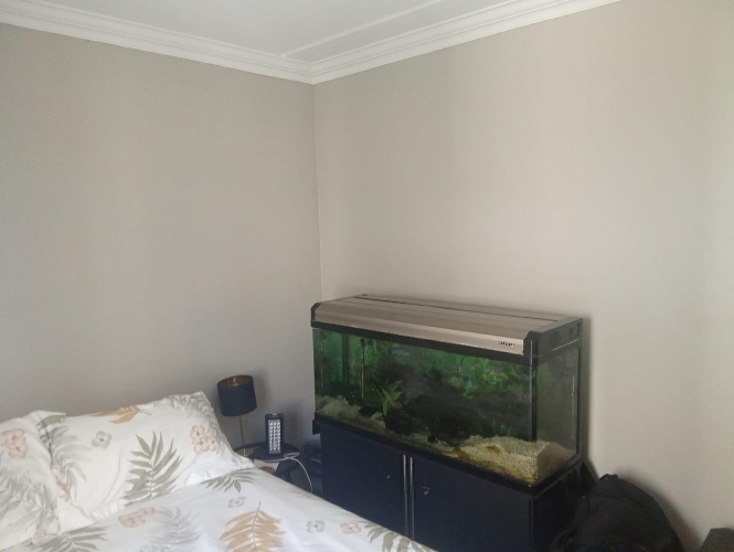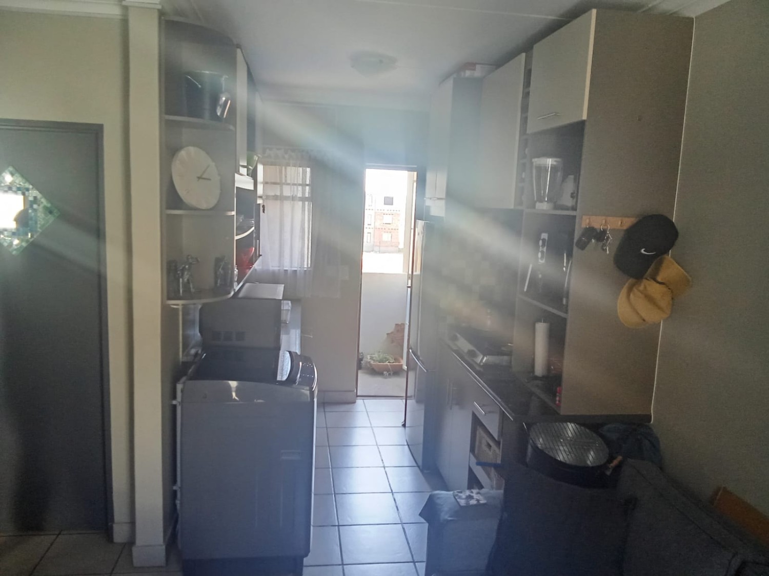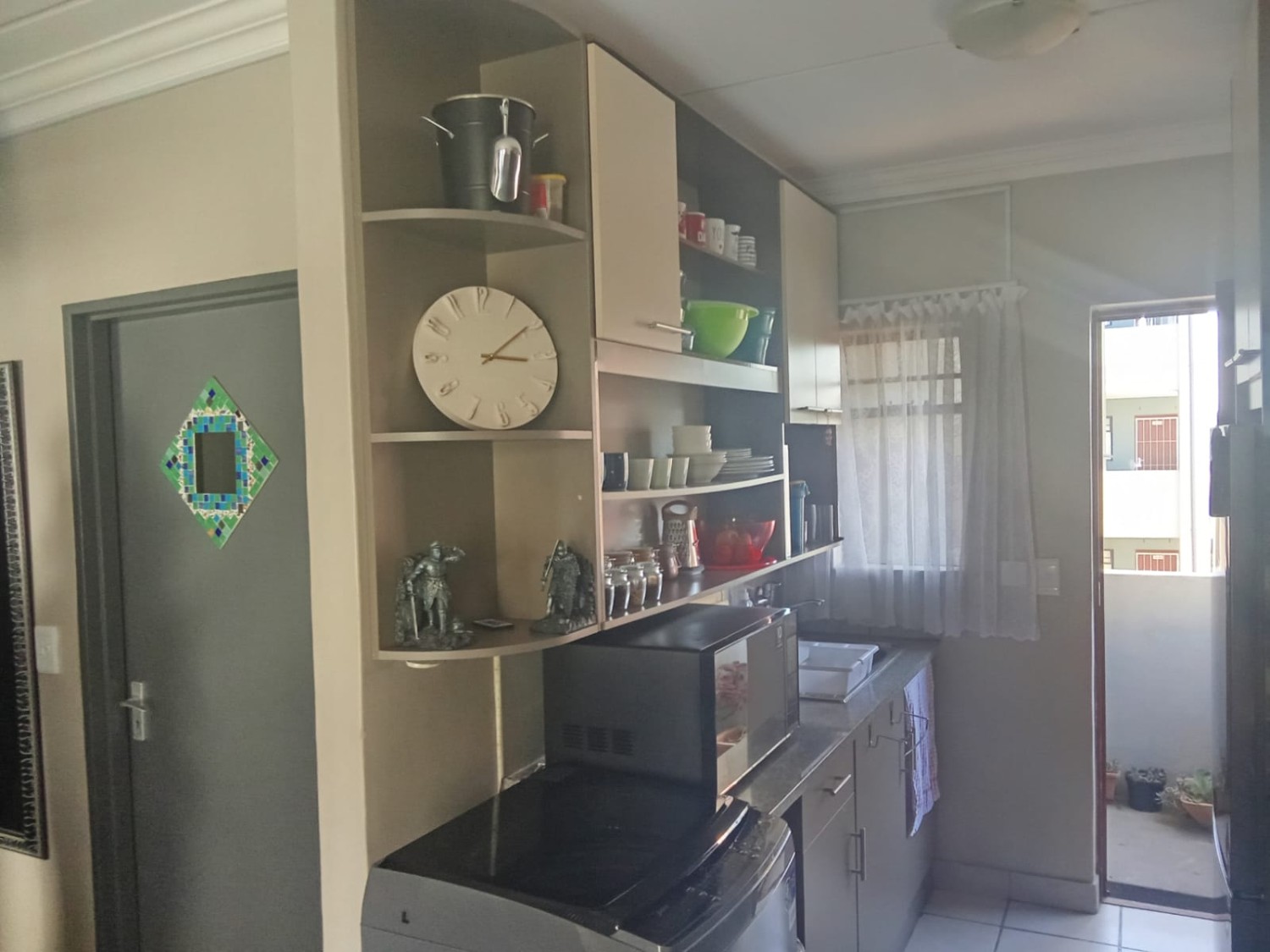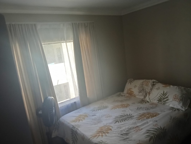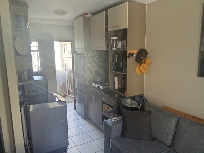 The apartment features a bright and airy lounge with tiled flooring and large windows that allow for plenty of natural light, creating a warm and welcoming atmosphere. The kitchen is fitted with built-in cupboards and includes a plumbing point, making it both practical and functional for everyday living.