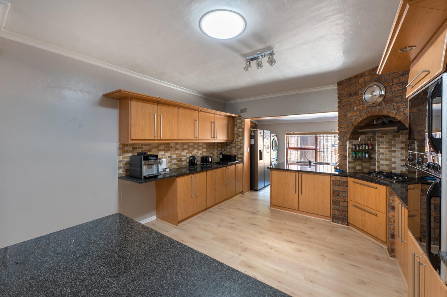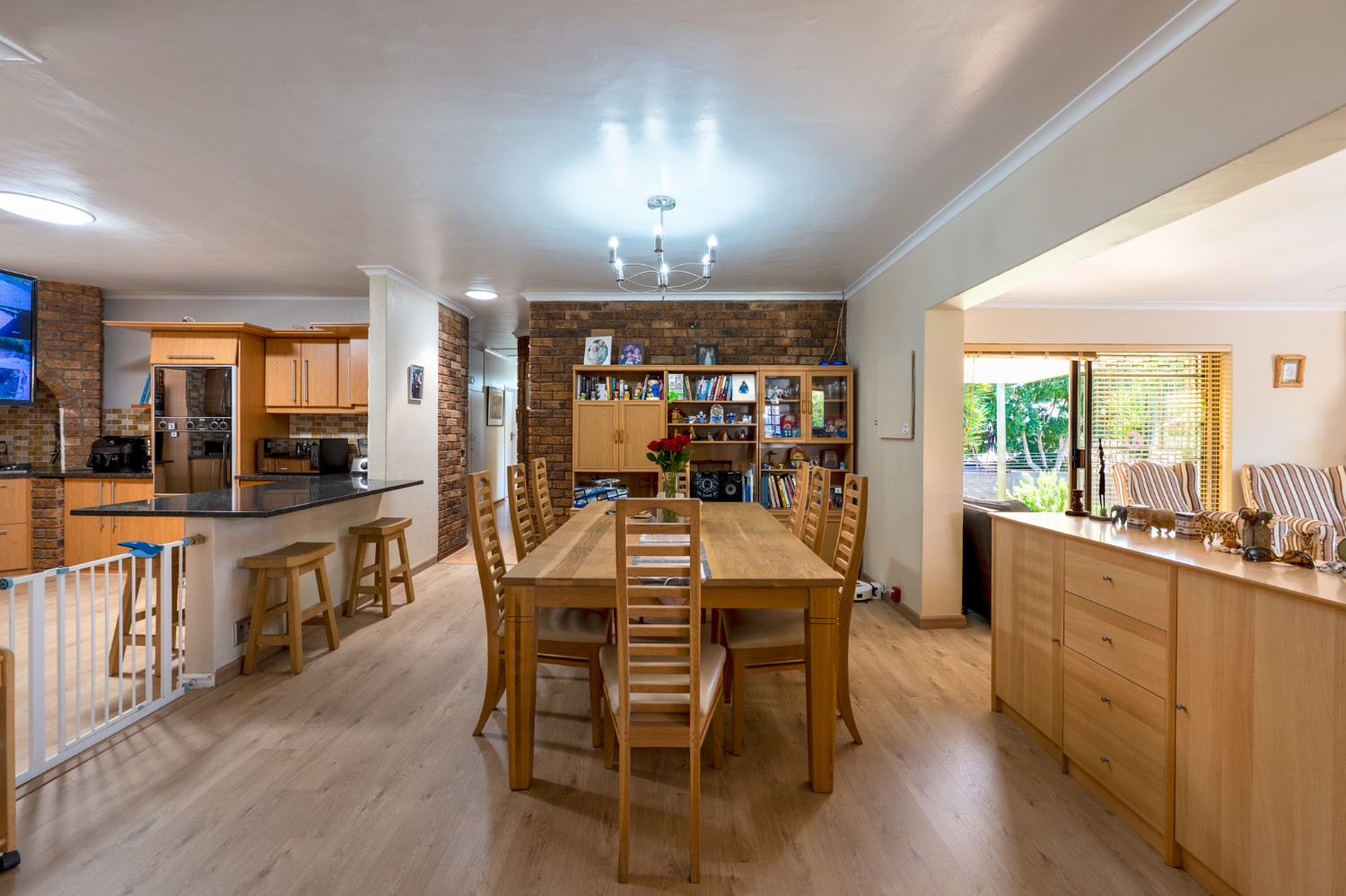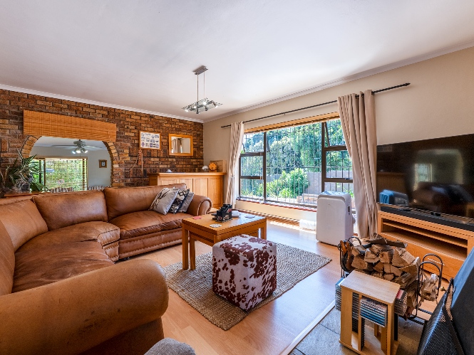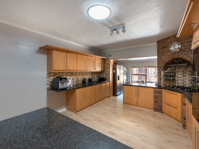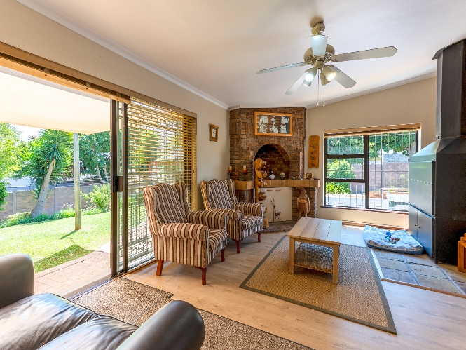 The entrance hall leads to the generously proportioned lounge, which creates a welcoming atmosphere for relaxation with a fireplace and large windows. The separate family room offers additional space for informal gatherings with an indoor built-in braai and doors leading to the garden. A dedicated dining room flows seamlessly into the open-plan kitchen, making entertaining effortless. The kitchen is thoughtfully designed with ample cupboard space, granite countertops, a gas stovetop, double eye-level ovens, and is complemented by a convenient scullery and laundry to keep the main kitchen neat and organised.