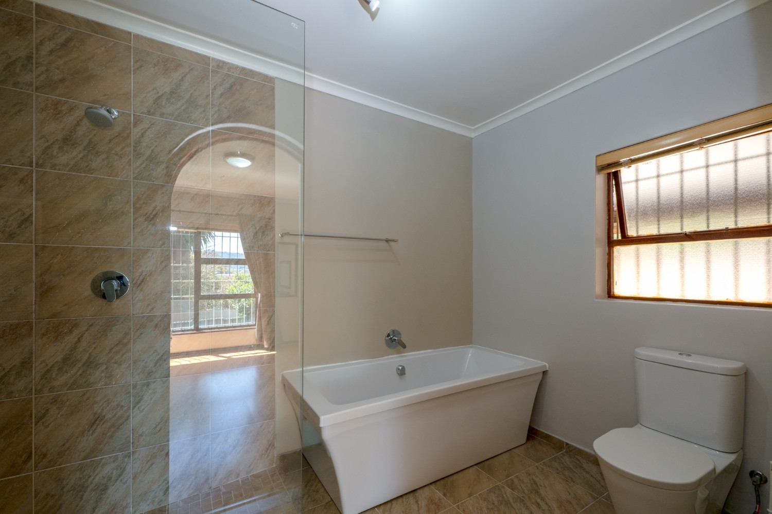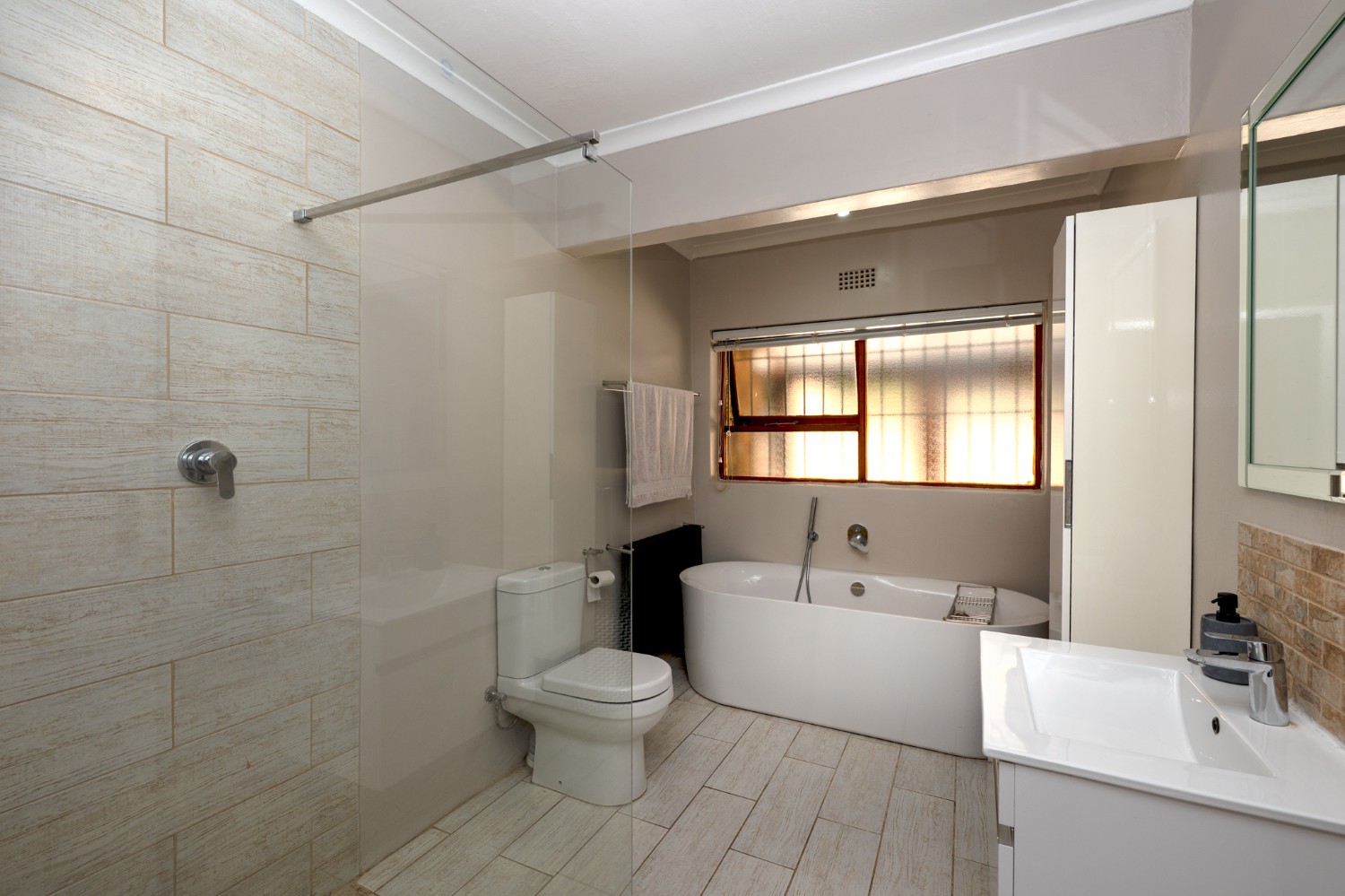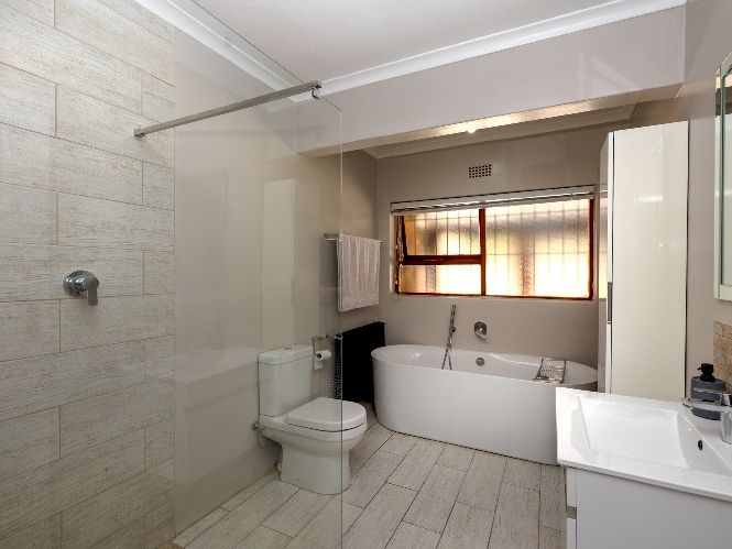 There are four well-sized bedrooms with ample cupboard space. The master suite has an en-suite bathroom equipped with a walk-in shower, bathtub, basin, and toilet. The family bathroom is equally modern with a shower, bathtub, basin with a toiletry cabinet, and toilet. The home provides ample accommodation with a practical layout designed for everyday convenience.