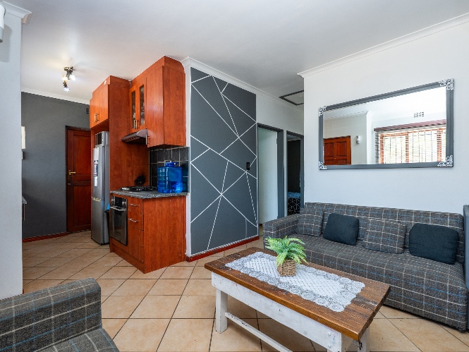 The lounge is bright and inviting, featuring tiled flooring and a large window that allows plenty of natural light to fill the space. The charming kitchen is fitted with dark wood cupboards, an under-counter oven and hob, and space for a fridge, making it both practical and functional for everyday living.