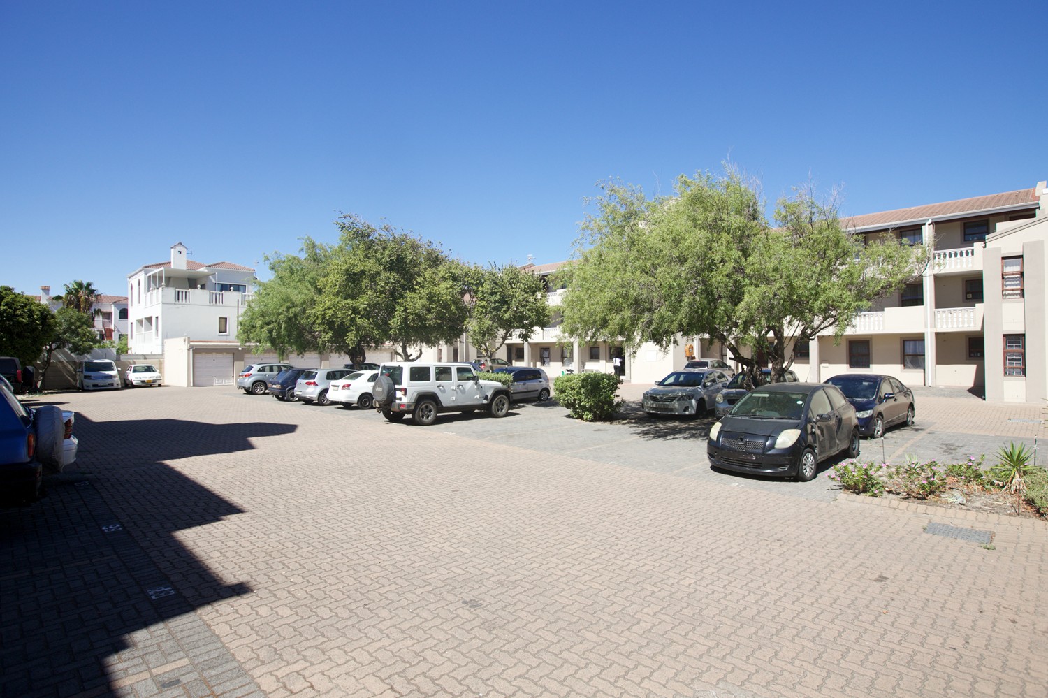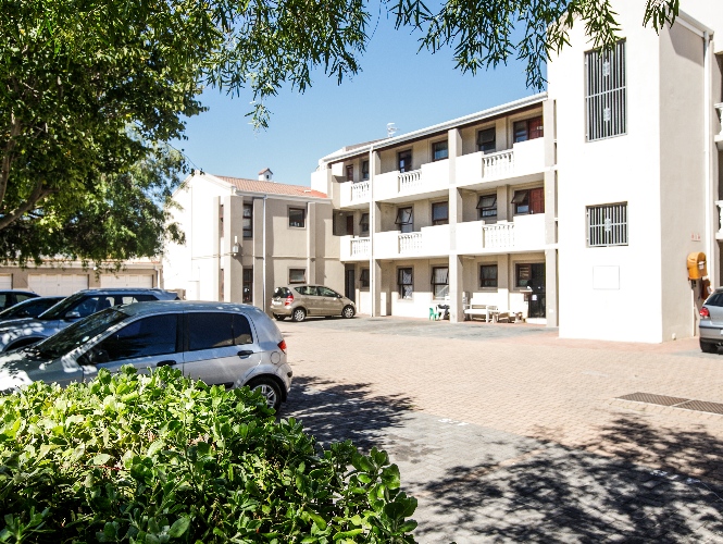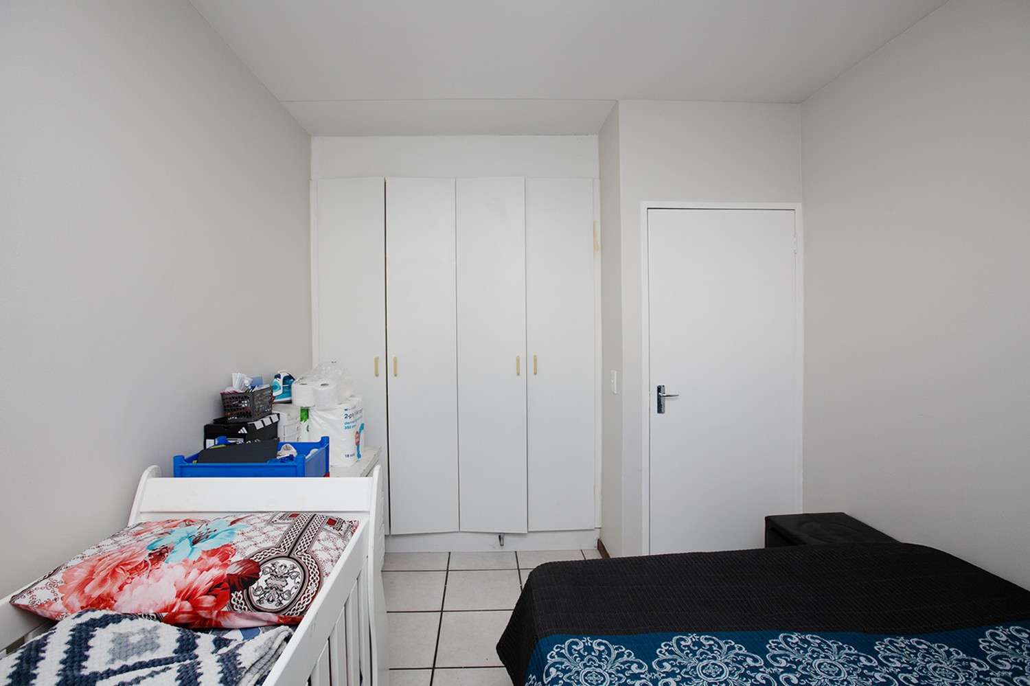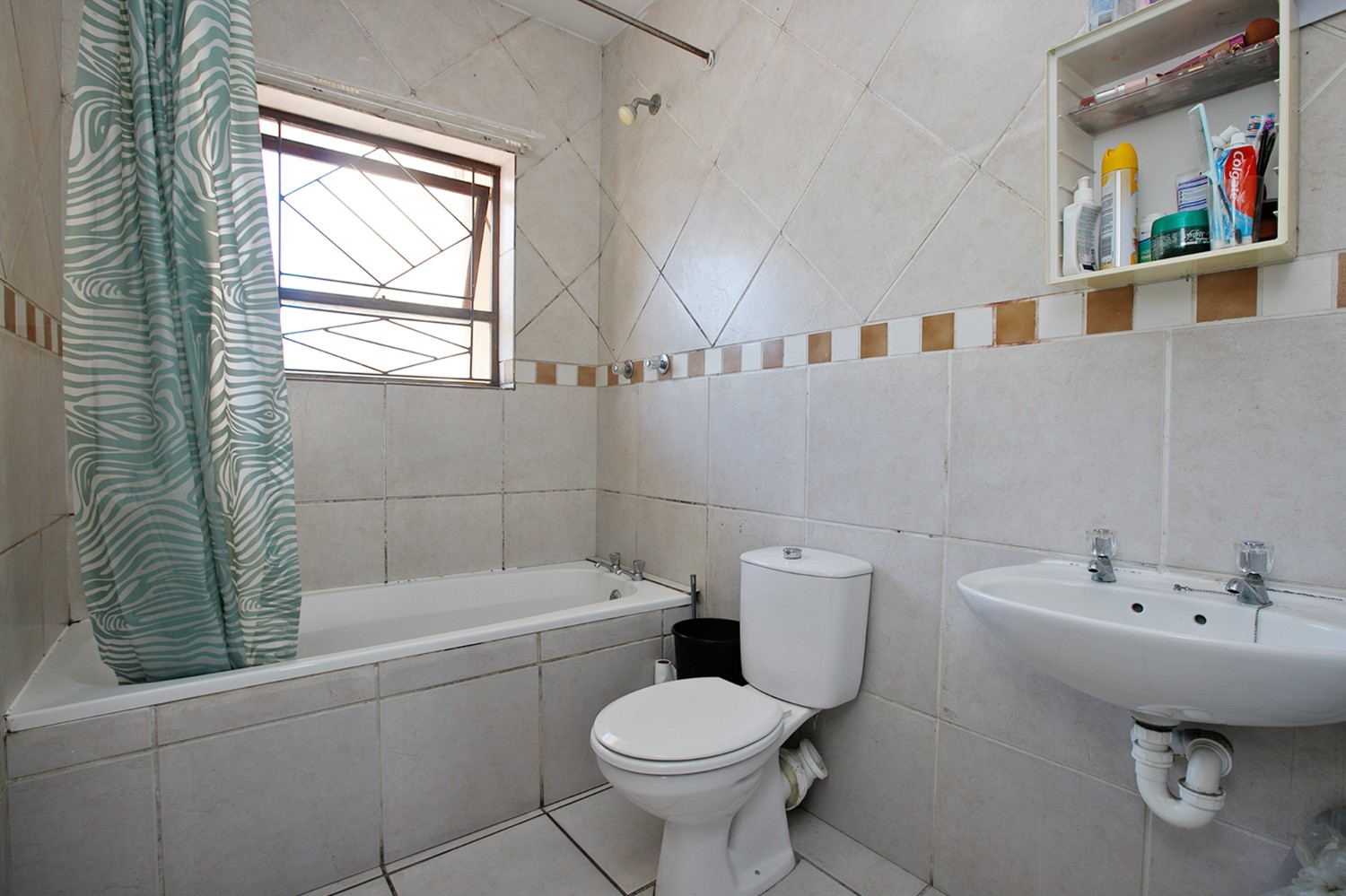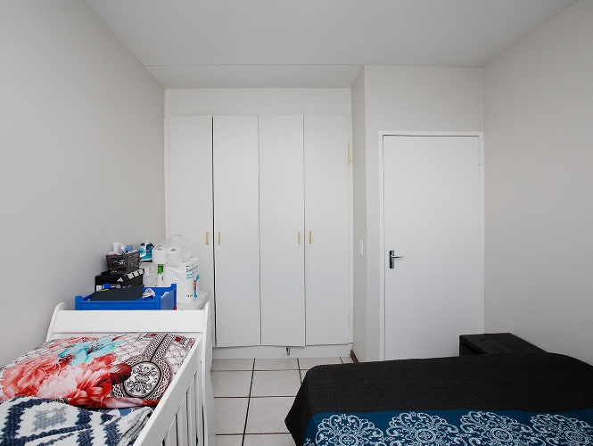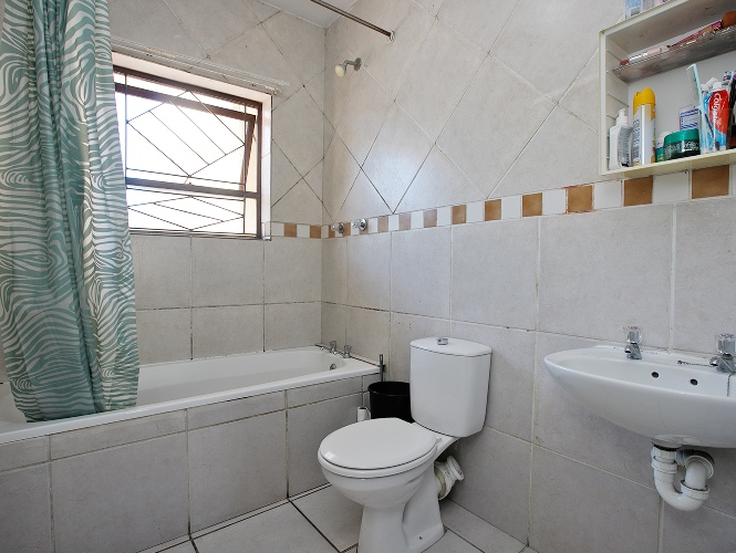The apartment comprises 2 bedrooms, both fitted with built-in cupboards, and one full bathroom featuring a shower over the bath, basin, and toilet.