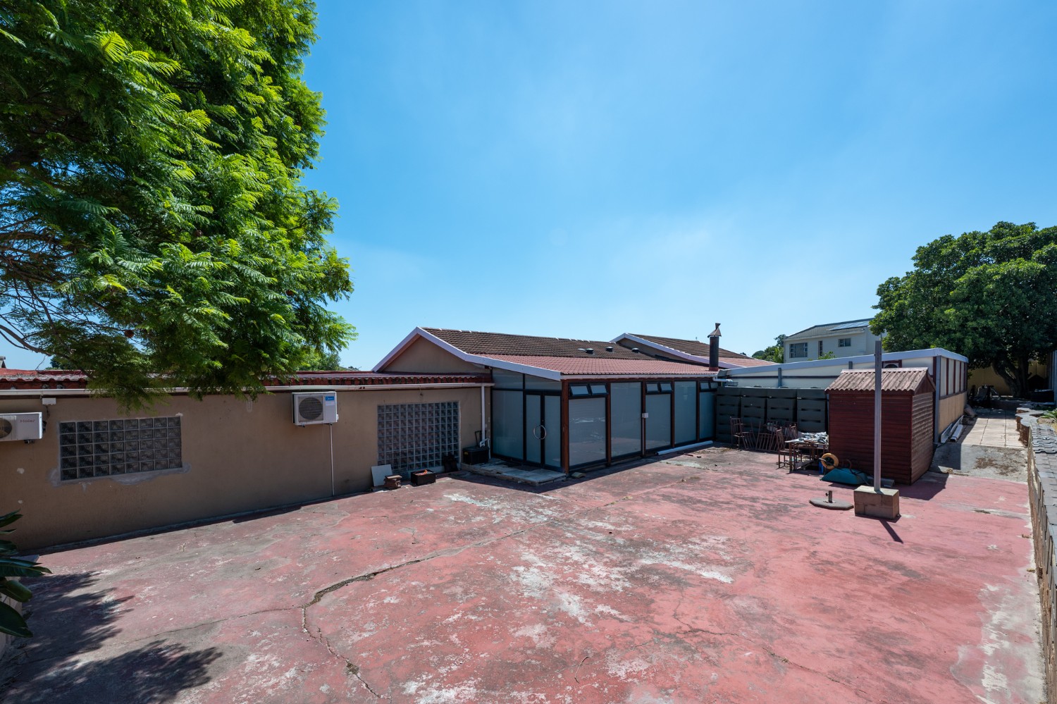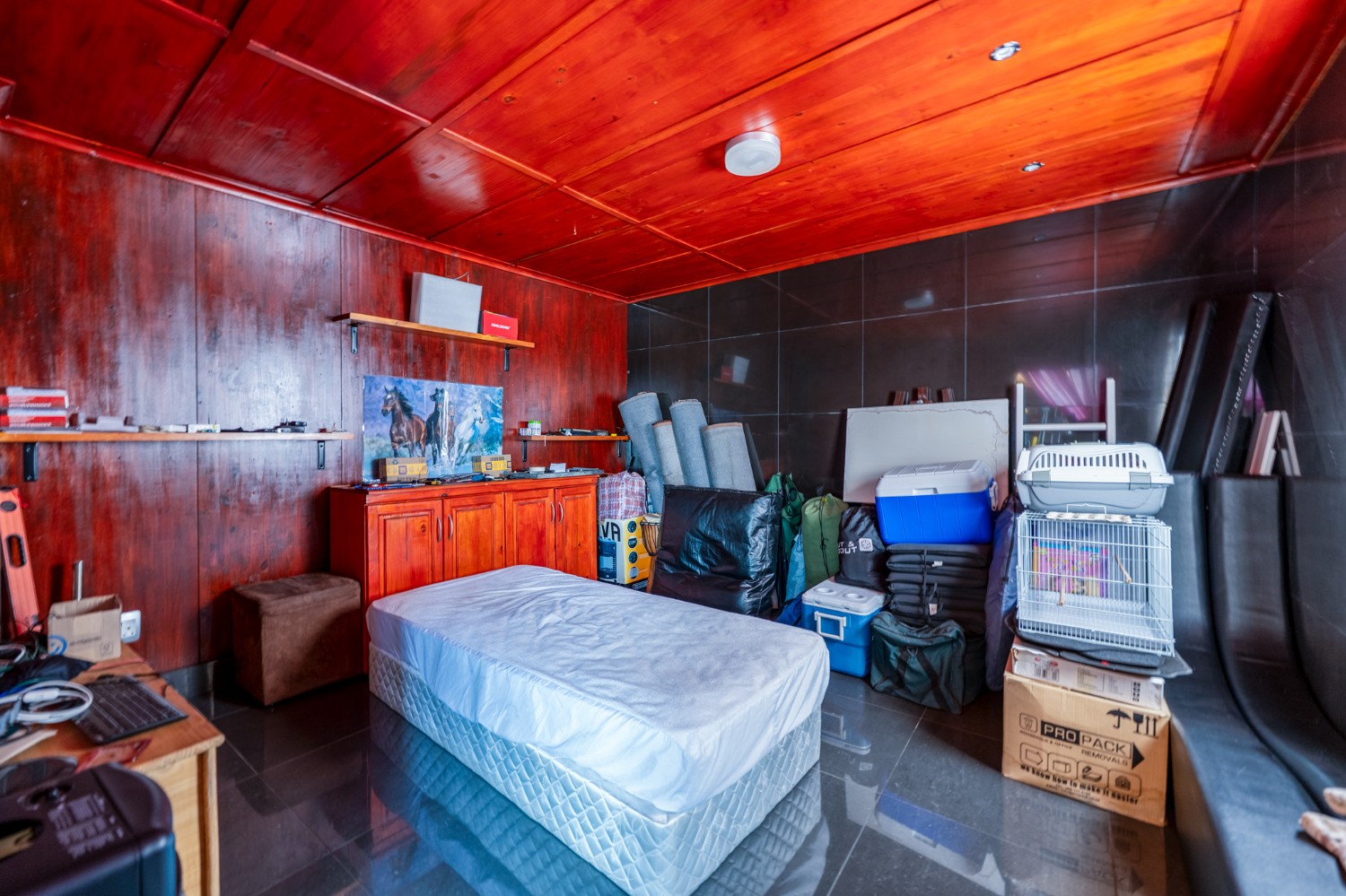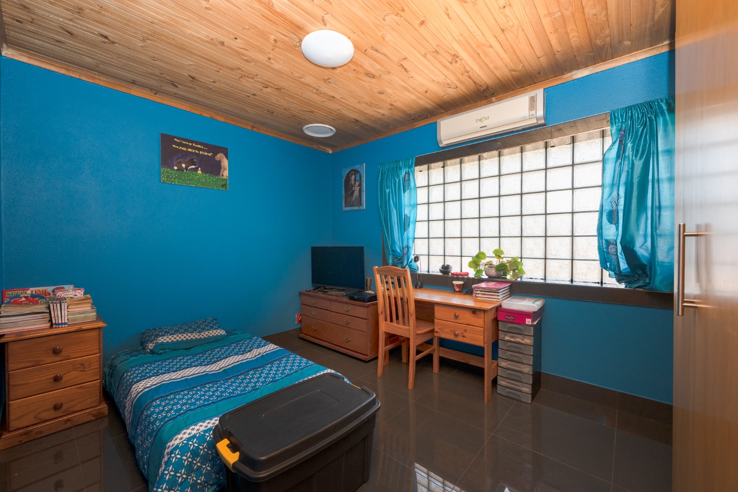 The home boasts five bedrooms, three of which include built-in cupboards, providing plenty of storage space. The main bedroom features an en-suite bathroom and an air conditioning unit for added comfort. The main bathroom is fitted with a shower, his-and-hers basins, and a toilet, while an additional guest bathroom ensures convenience for visitors. Adjacent to the kitchen, you will find a dedicated braai room complete with a built-in braai.