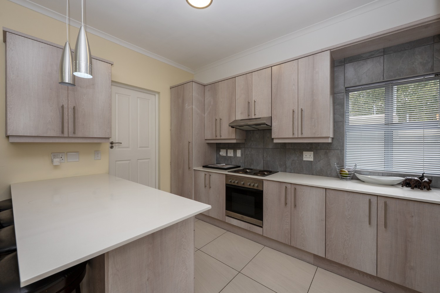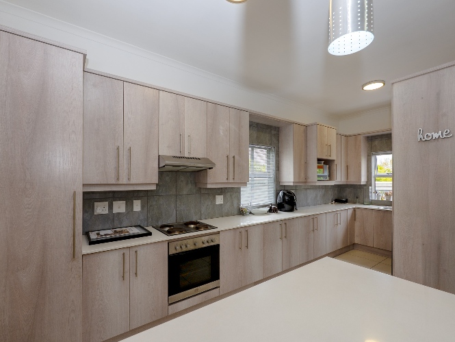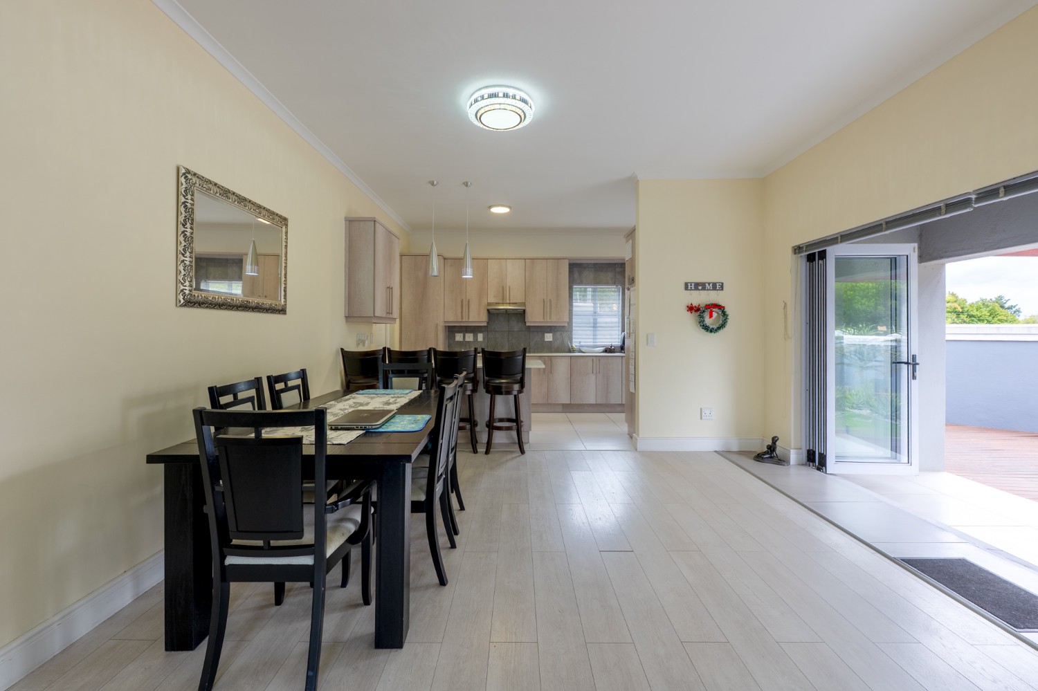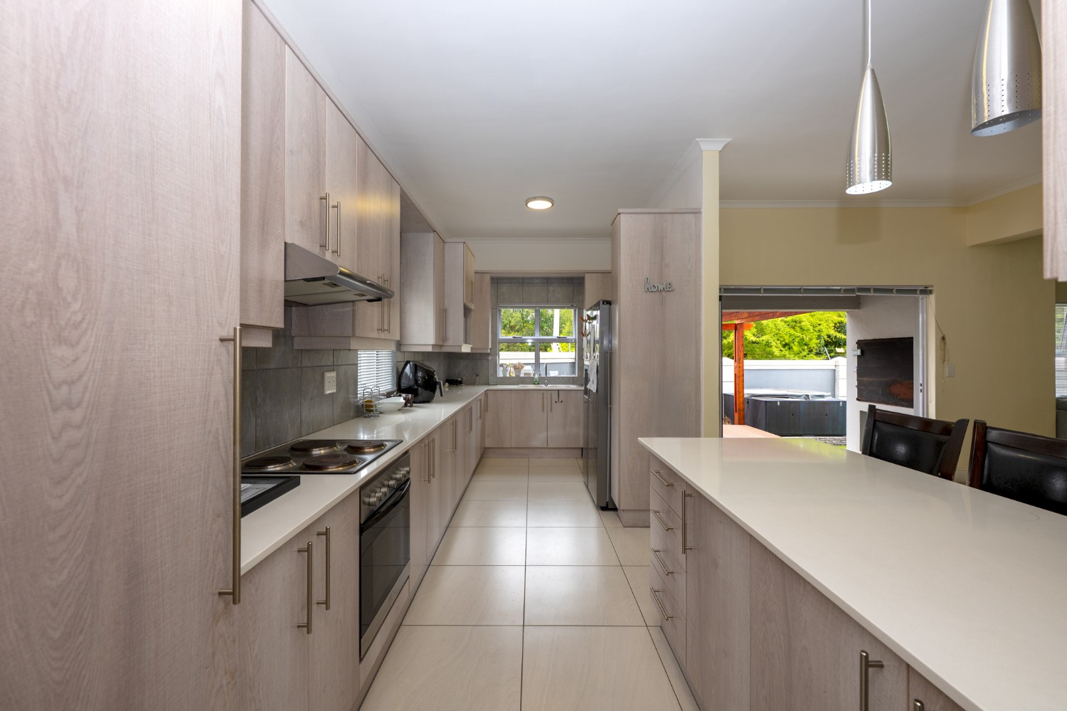Upon entering the home, you are welcomed by a generously proportioned lounge and dining area featuring laminated flooring and stacker doors that open onto an undercover entertainment space with a built-in braai, creating the perfect setting for indoor-outdoor living and entertaining. The modern kitchen is elegantly finished with ample cupboard space, quartz stone countertops, an under-counter oven and hob, and space for all your essential appliances. A convenient guest toilet is also located downstairs.