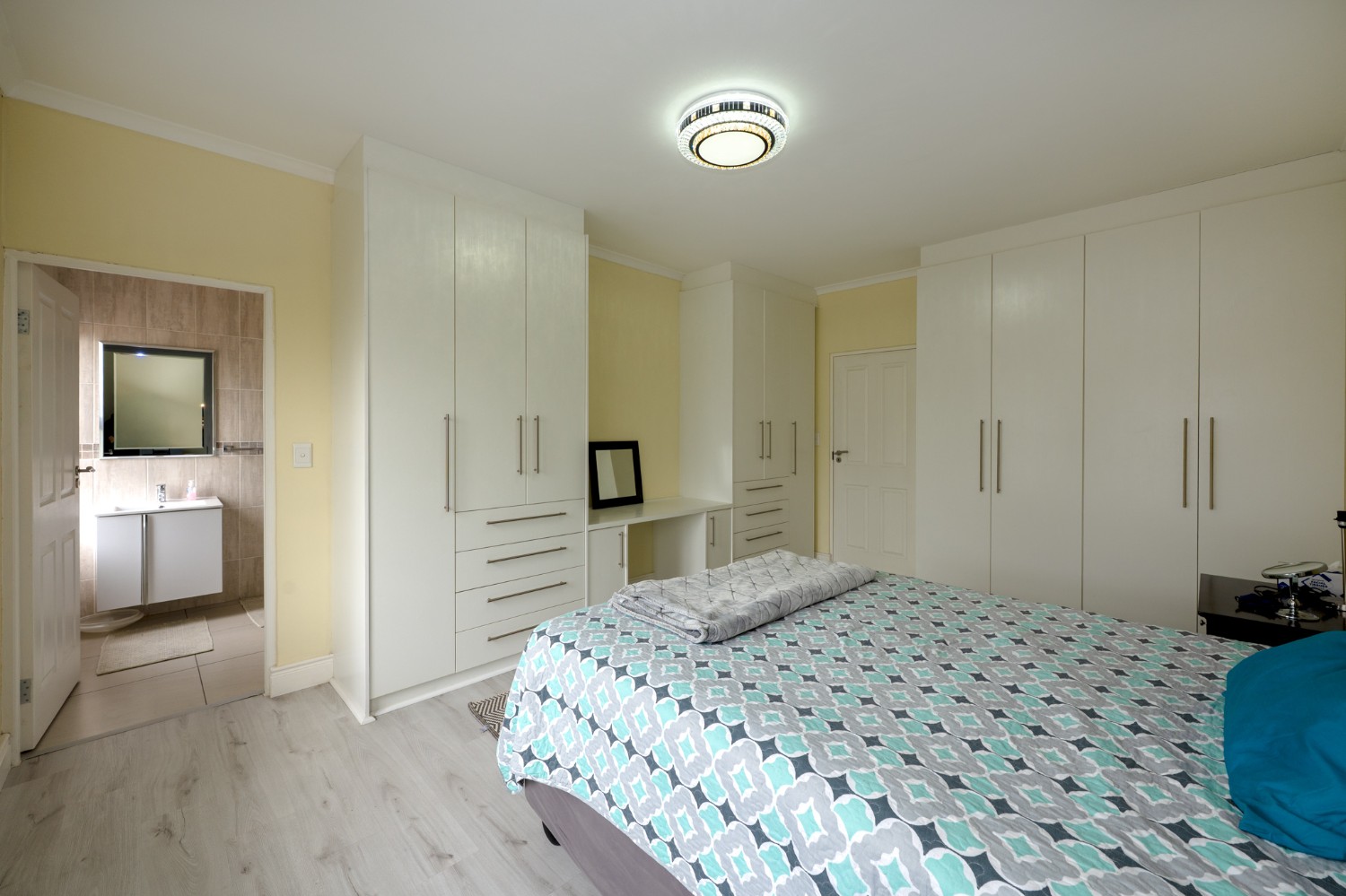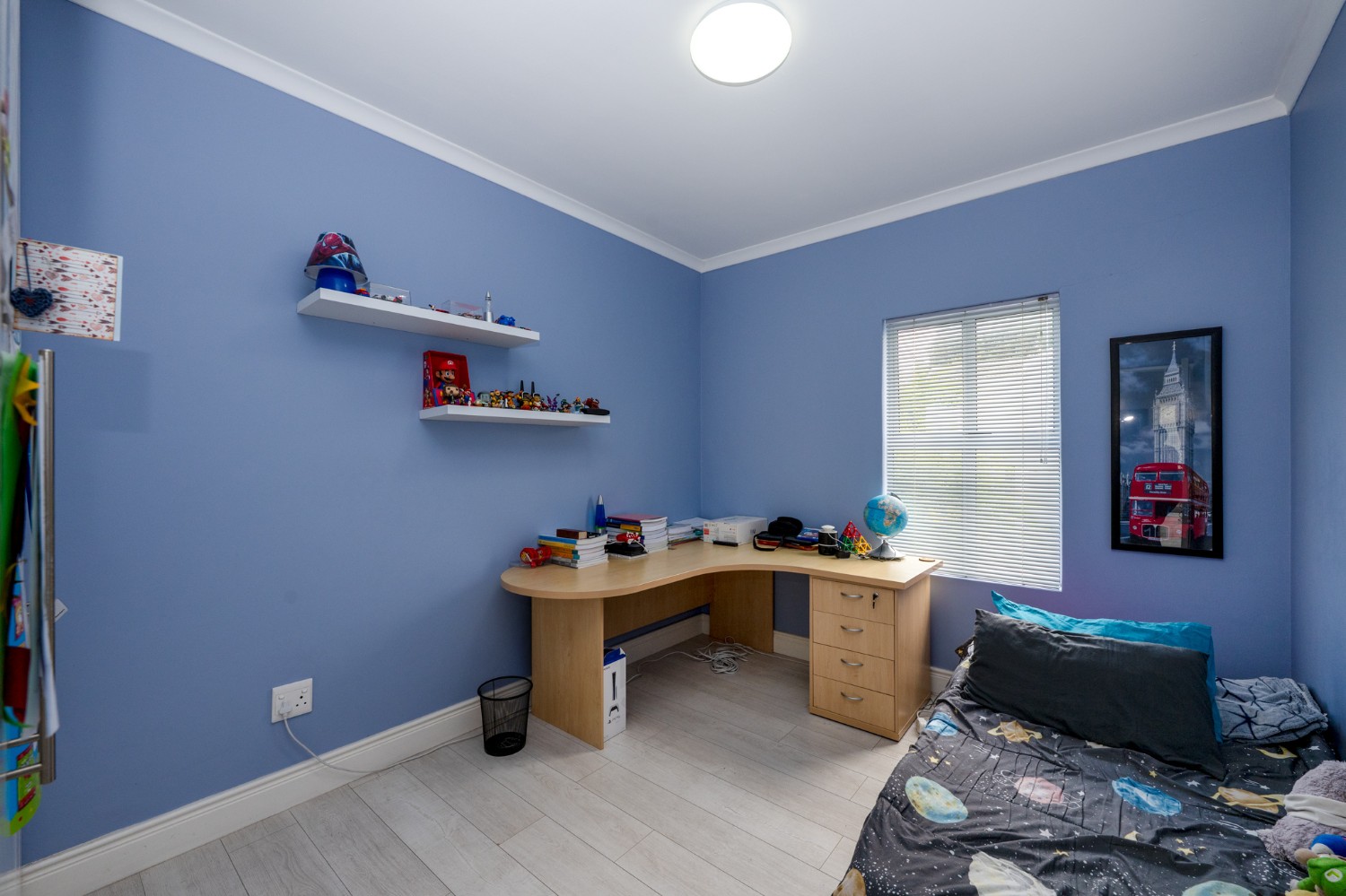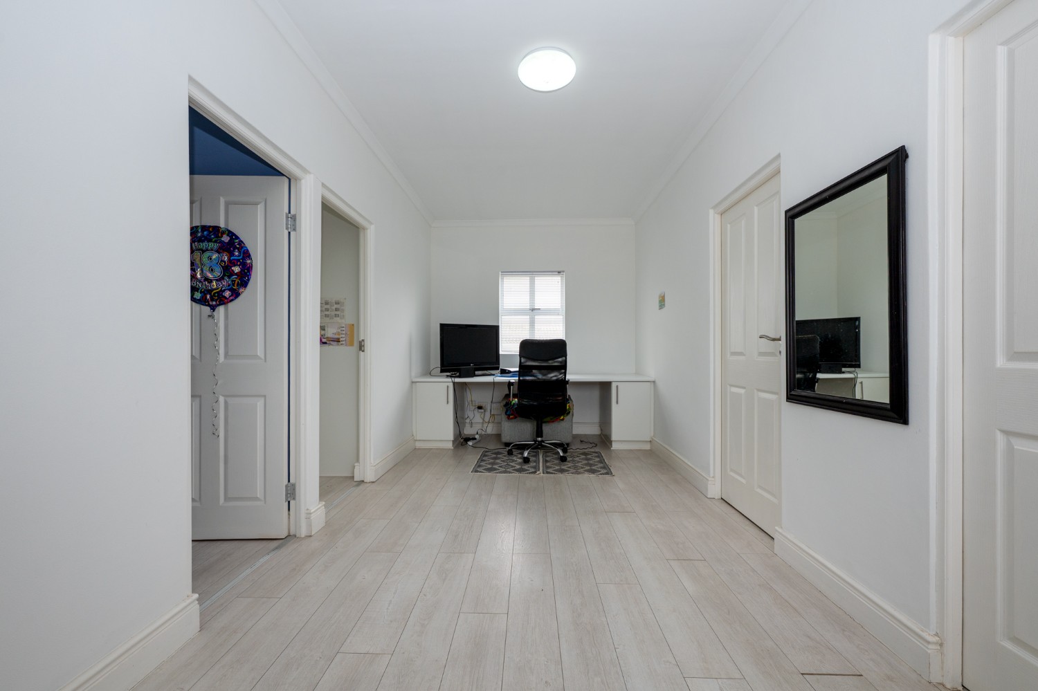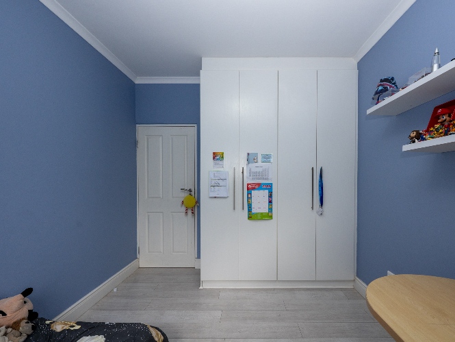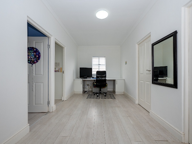Upstairs, the home offers three well-sized bedrooms, all fitted with built-in cupboards and filled with natural light. The main bedroom features a private en-suite bathroom with a shower, basin, and toilet. The tastefully tiled family bathroom includes a shower, bathtub, basin, and toilet. The upstairs landing area provides a versatile space that is ideally suited for a home office, perfect for those working remotely.
