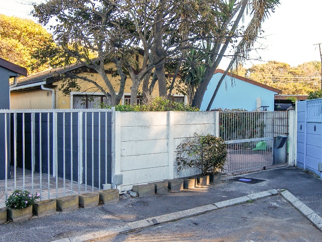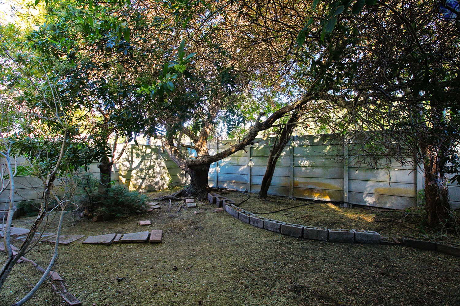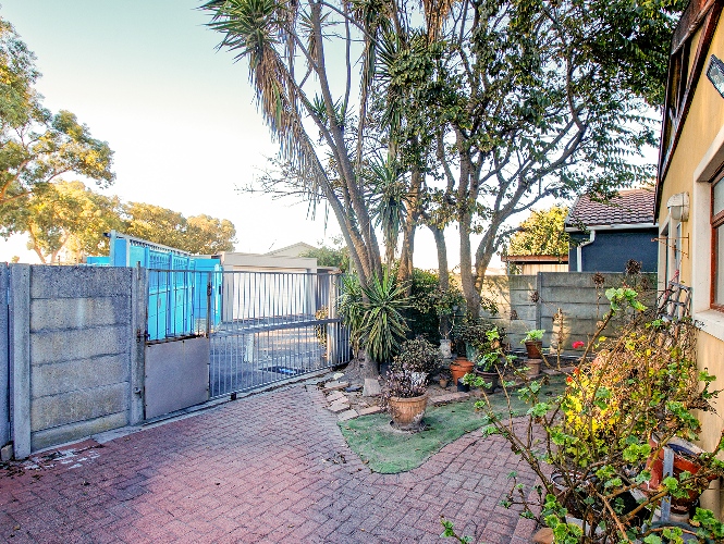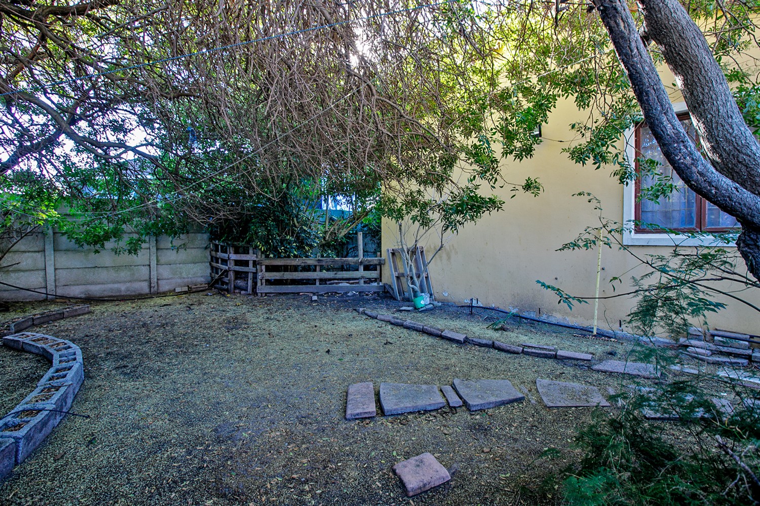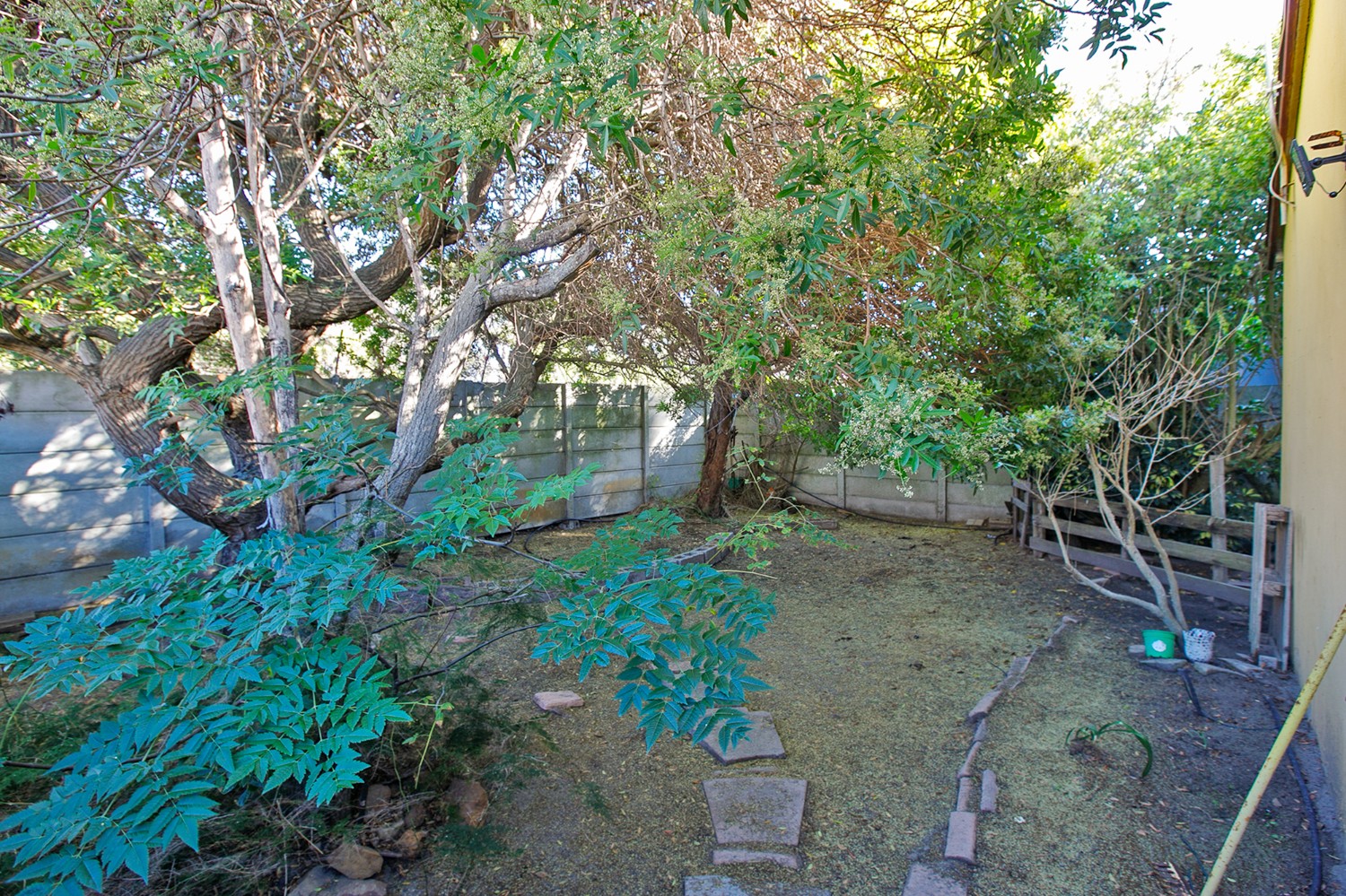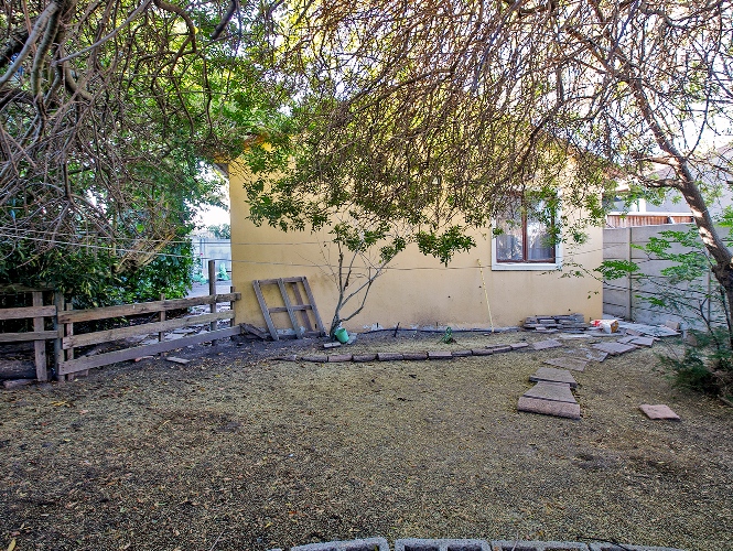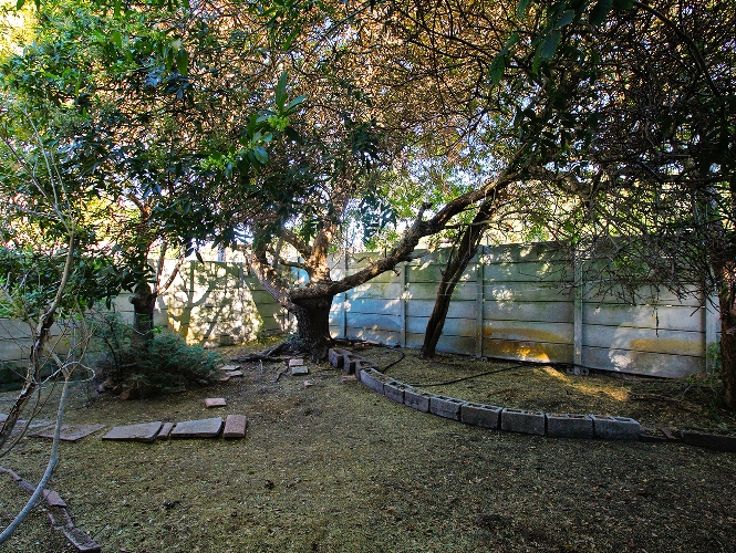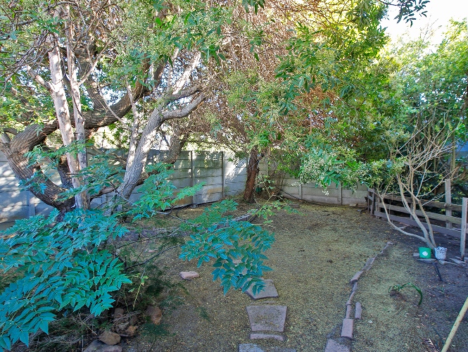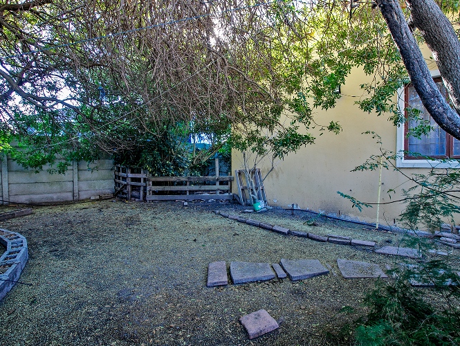 Large back garden with a borehole and driveway parking for 1 car behind a gate.