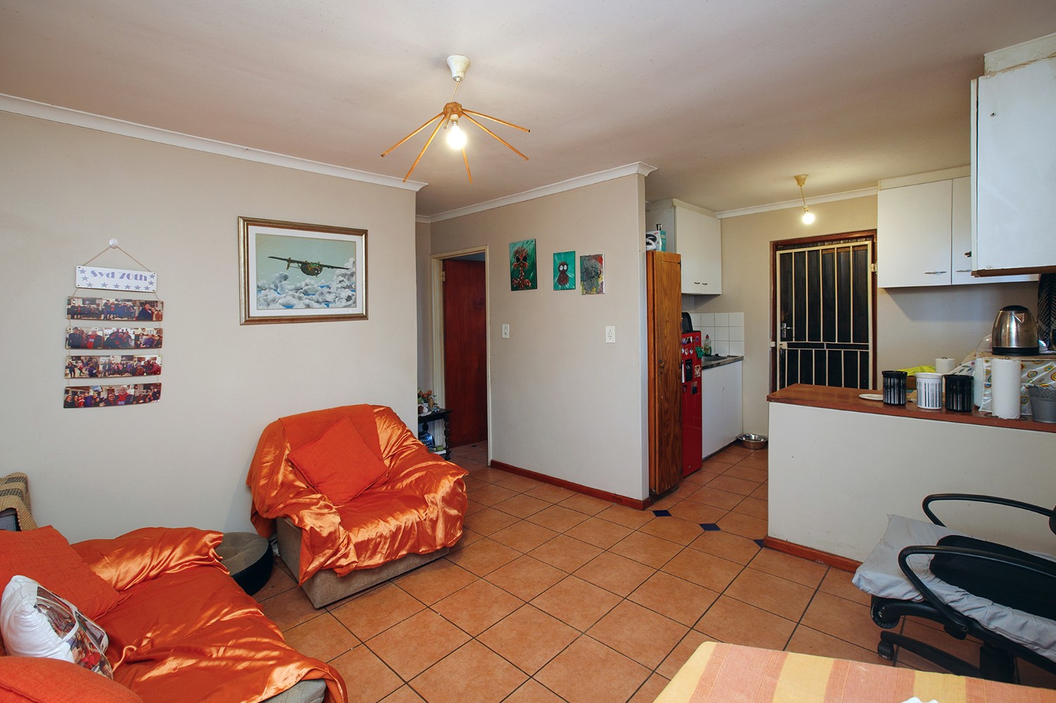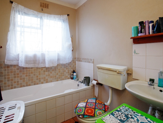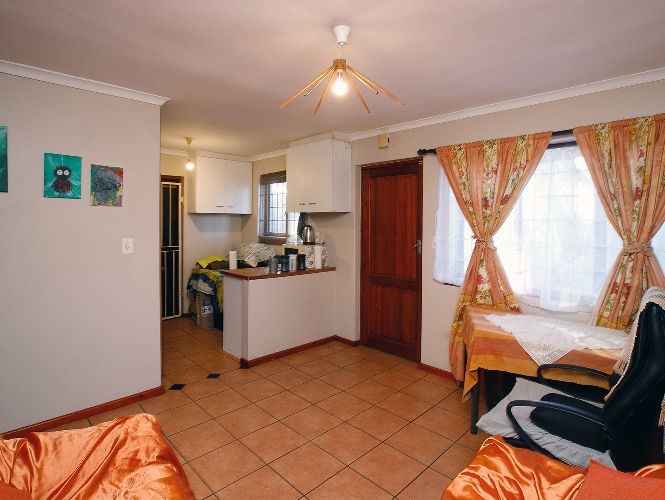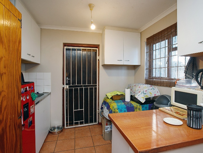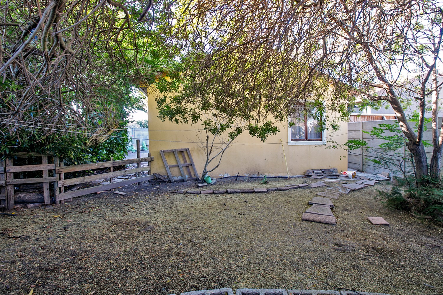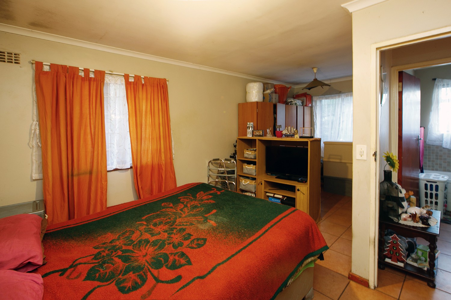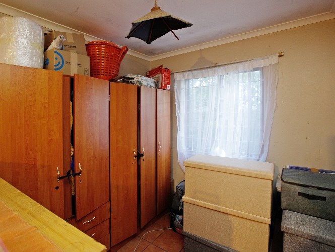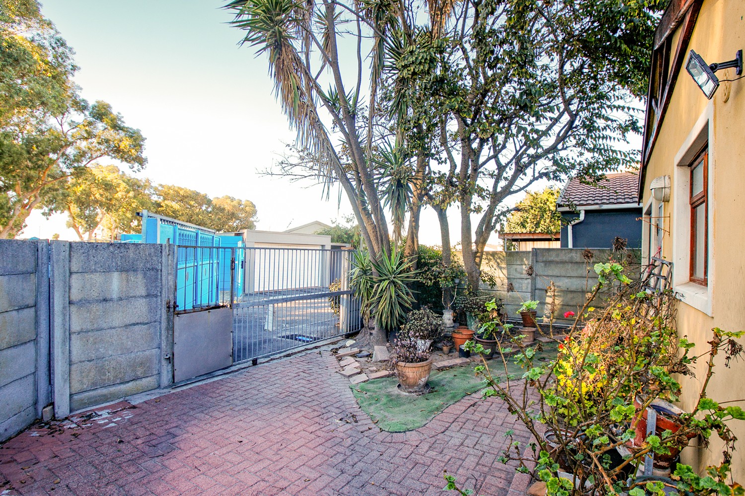 Large back garden with a borehole and driveway parking for 1 car behind a gate.
